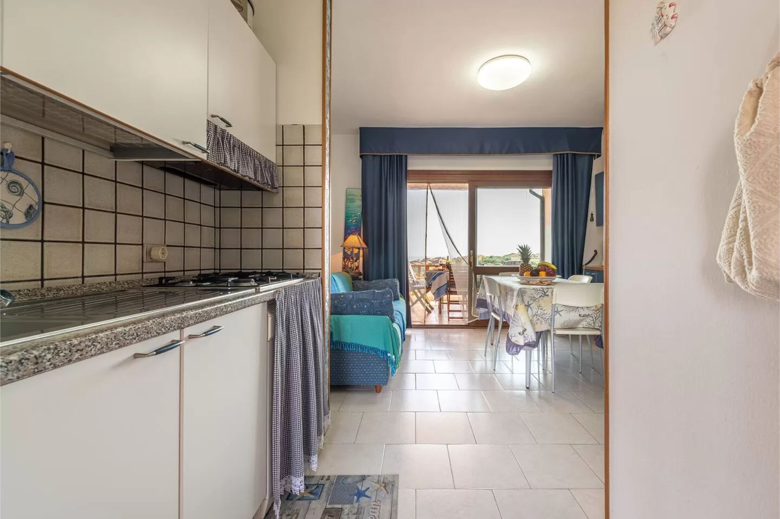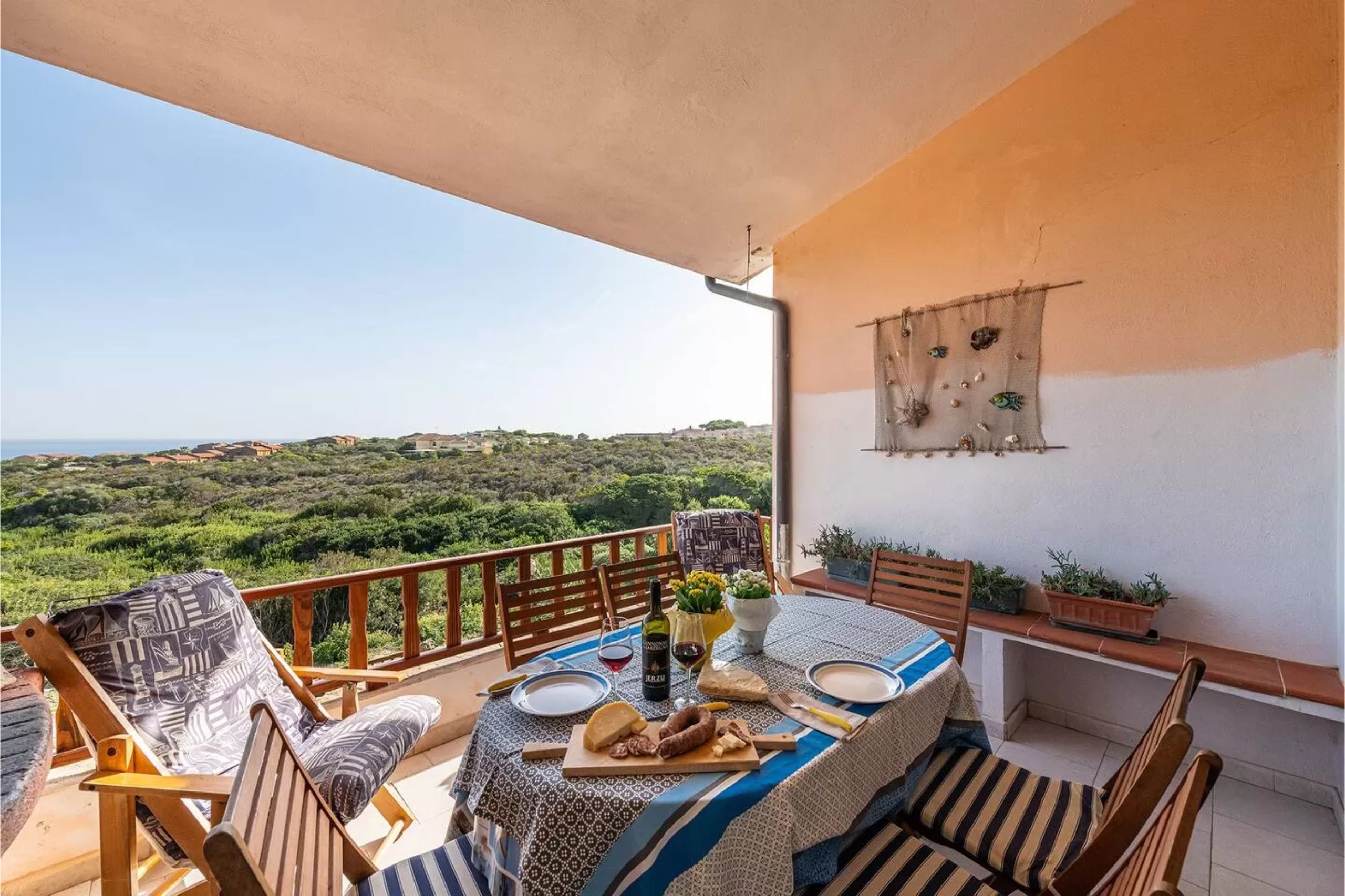 Stap vanuit de woonkamer naar buiten op de ruime veranda, waar je buiten kunt eten te midden van het adembenemende uitzicht op de zee en het pittoreske eiland Asinara.