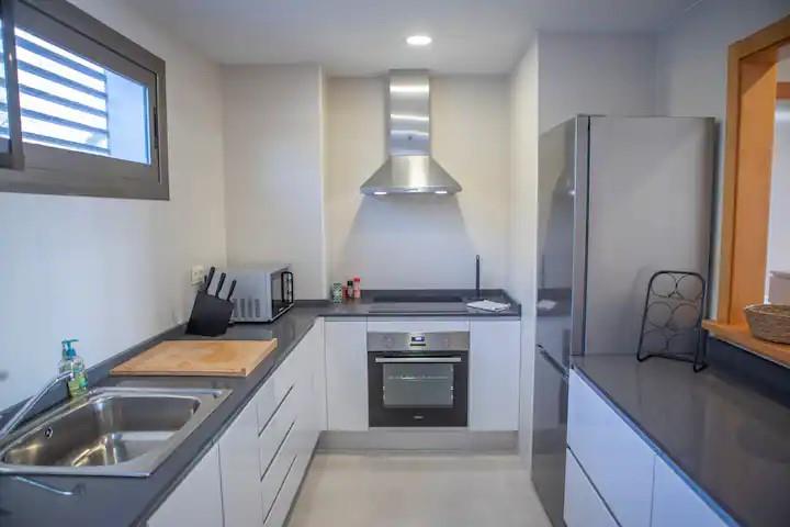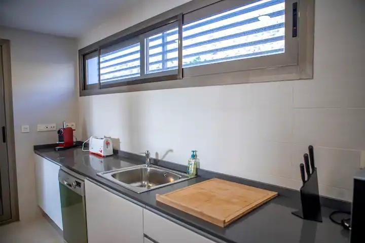 Keuken met elektrische kookplaat, elektrische oven, vaatwasser, koelkast, koffiezetapparaat, waterkoker en citruspers