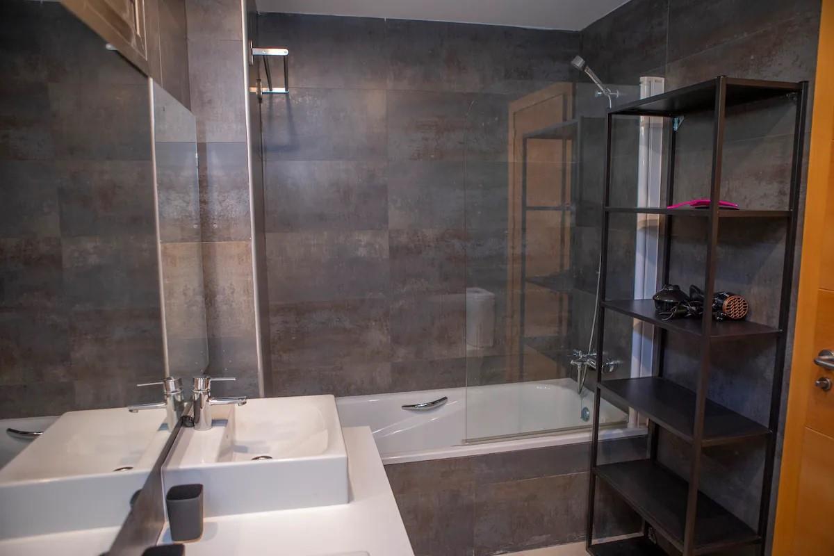 Badkamer met dubbele wastafel, bad, douche, bidet, toilet en haardroger