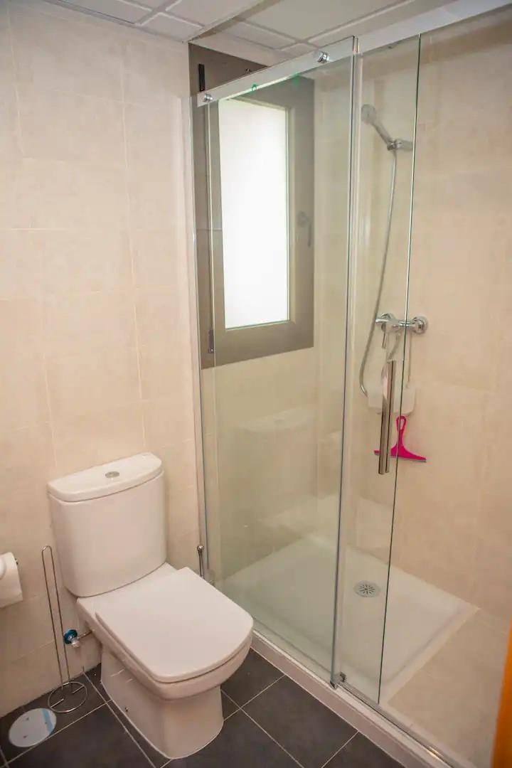 Badkamer met enkele wastafel, douche, toilet en haardroger