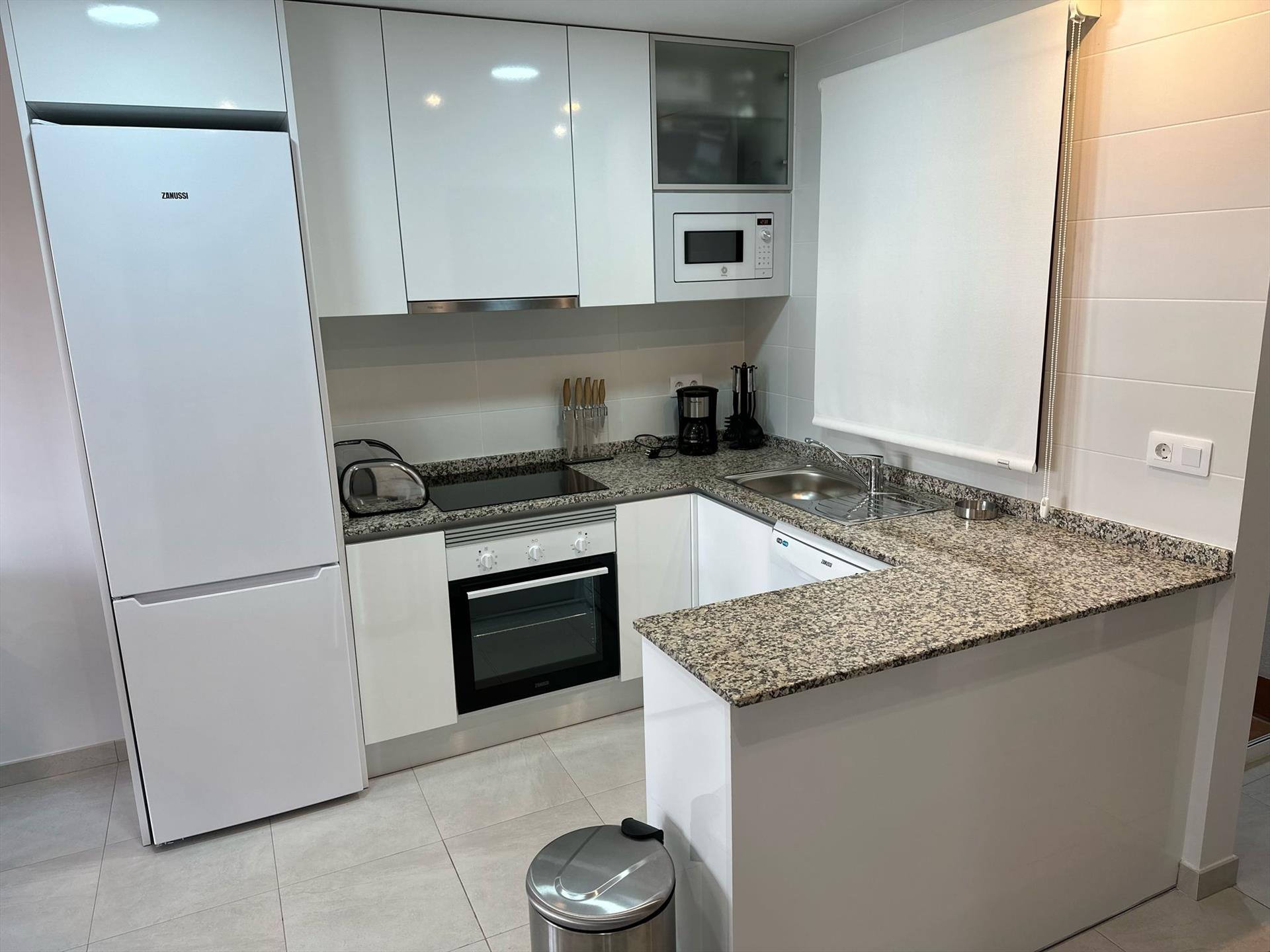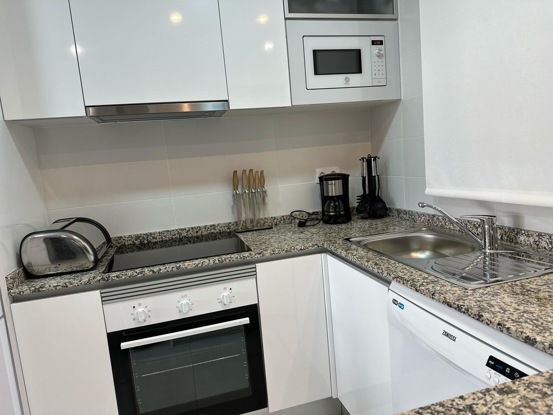 Open keuken met inductiekookplaat, elektrische oven, magnetron, vaatwasser, koel-vriescombinatie, koffiezetapparaat, waterkoker, broodrooster en citruspers
