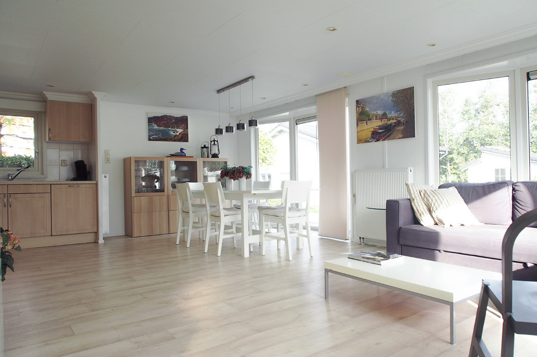 - Keuken en eetkamer: Het huis beschikt over een open keuken, eetkamer en woonkamer. Apparaten omvatten een fornuis, oven, koelkast, magnetron, broodrooster, waterkoker, Senseo-koffiezetapparaat en vaatwasser. De eetkamer heeft een grote tafel met plaats voor 6 personen.