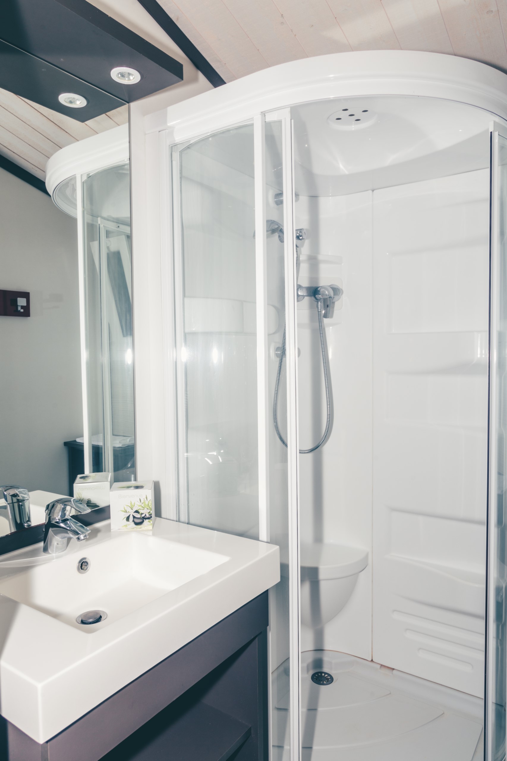 - Een badkamer met douche, wastafel en een grote spiegel.