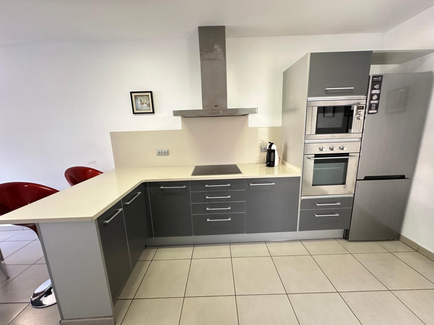 - Volledig Uitrustte Open Keuken: Inclusief keramische kookplaat, koelkast, magnetron, oven, wasmachine, vaatwasser, servies, bestek, kookgerei, koffiezetapparaat en broodrooster