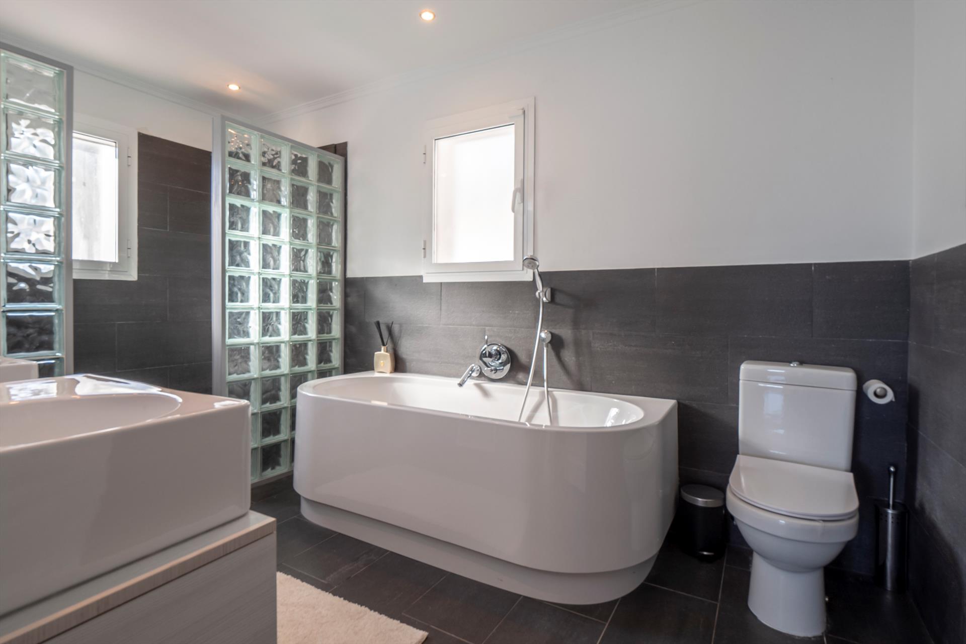 - badkamer met dubbele wastafel, bad, douche en toilet