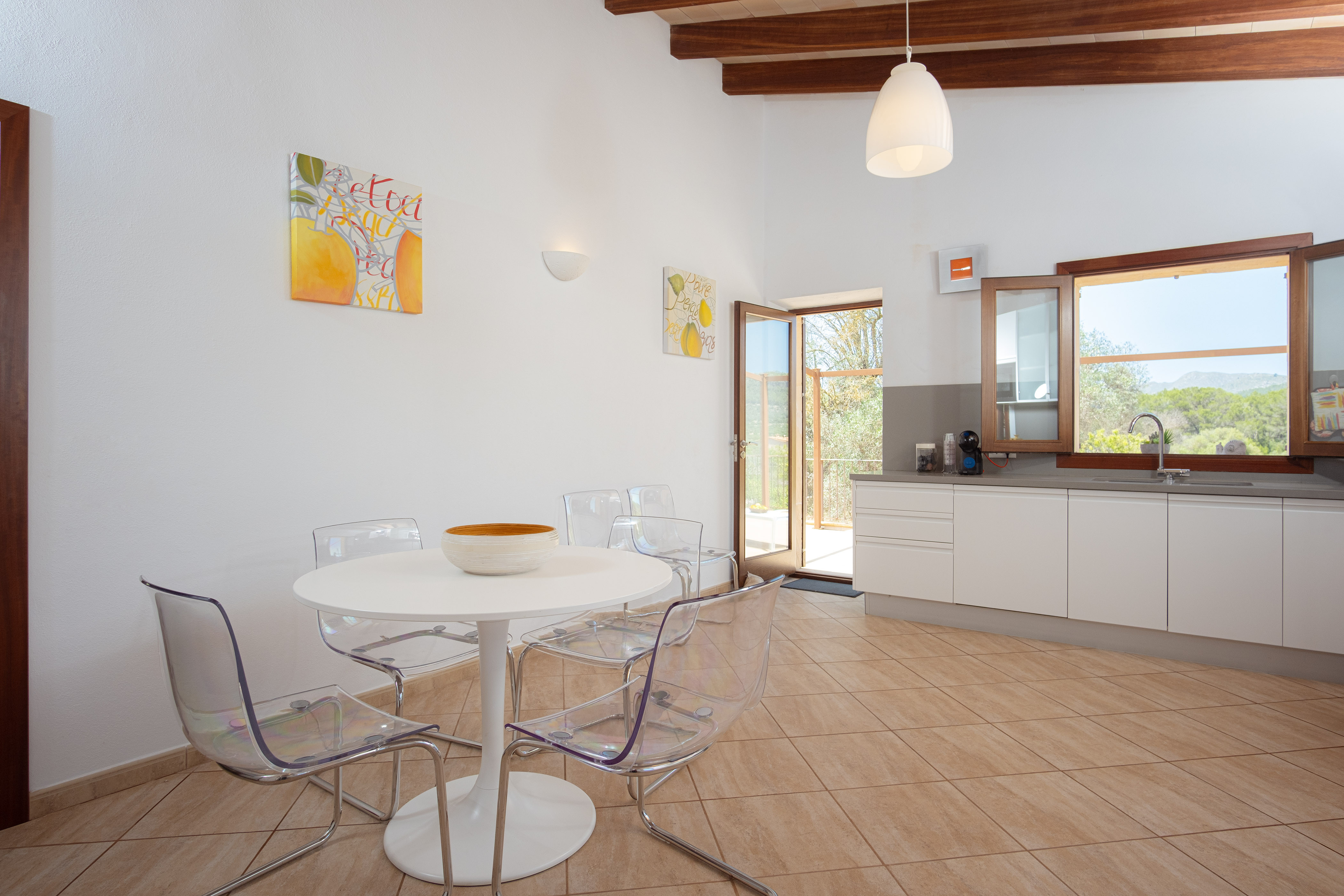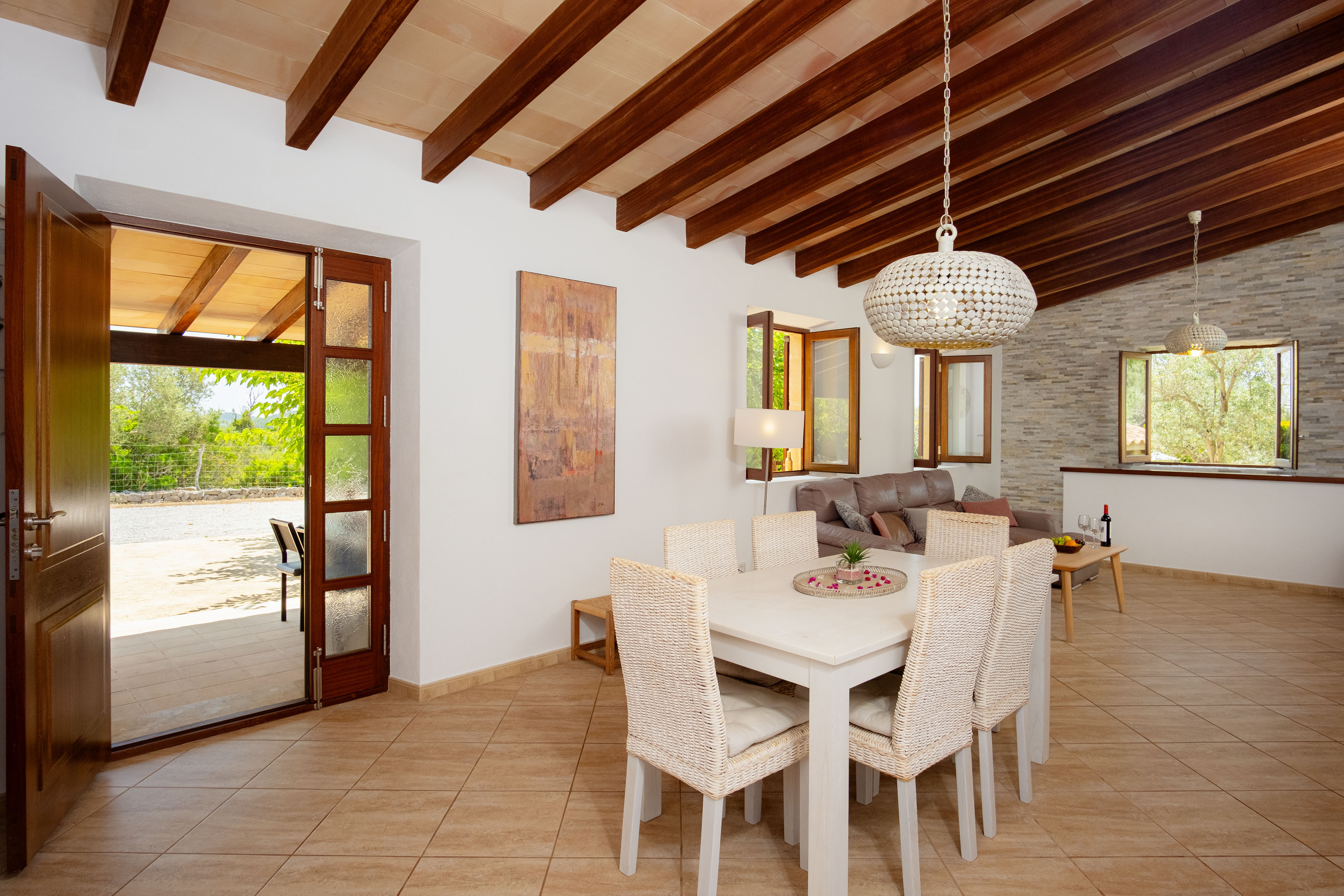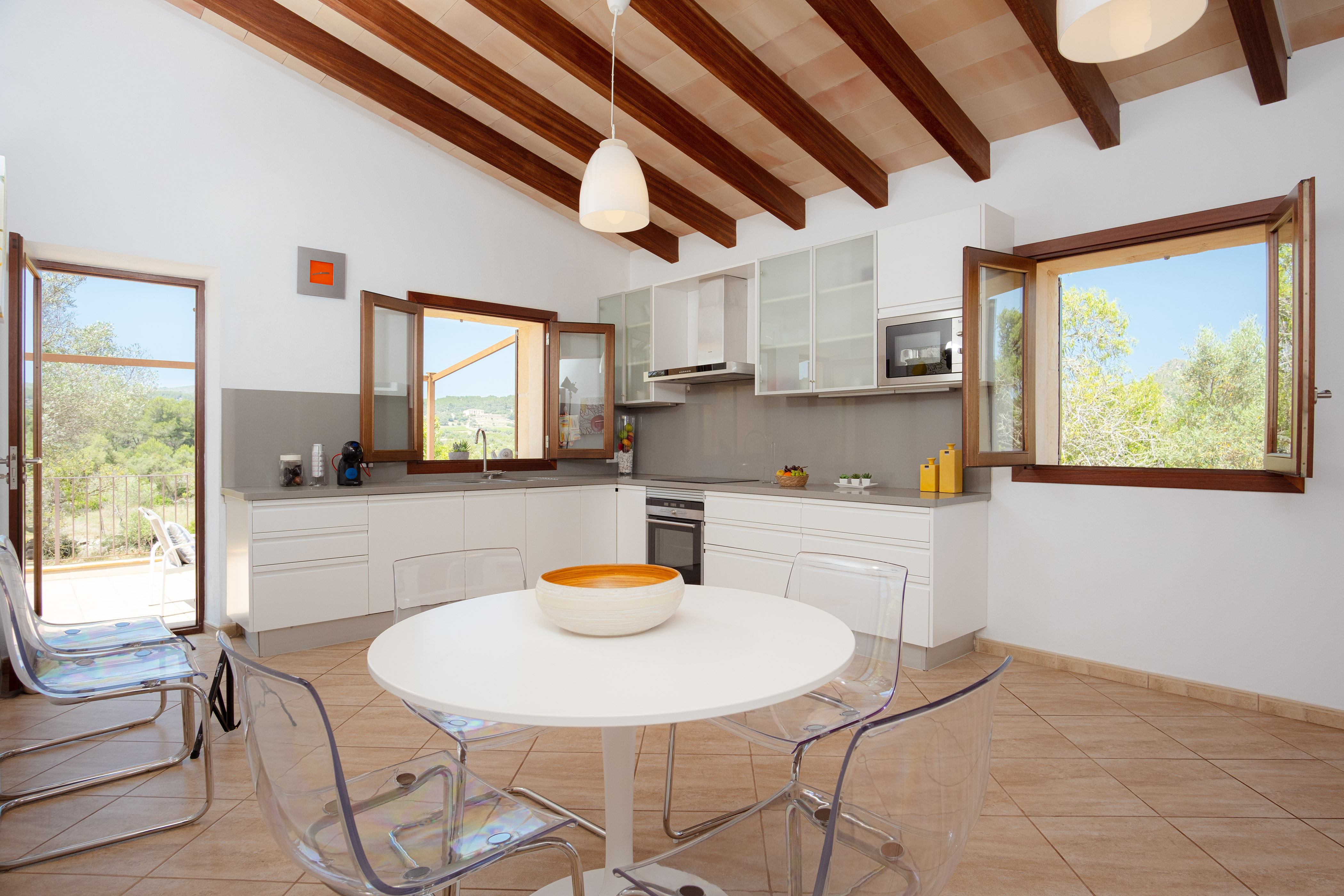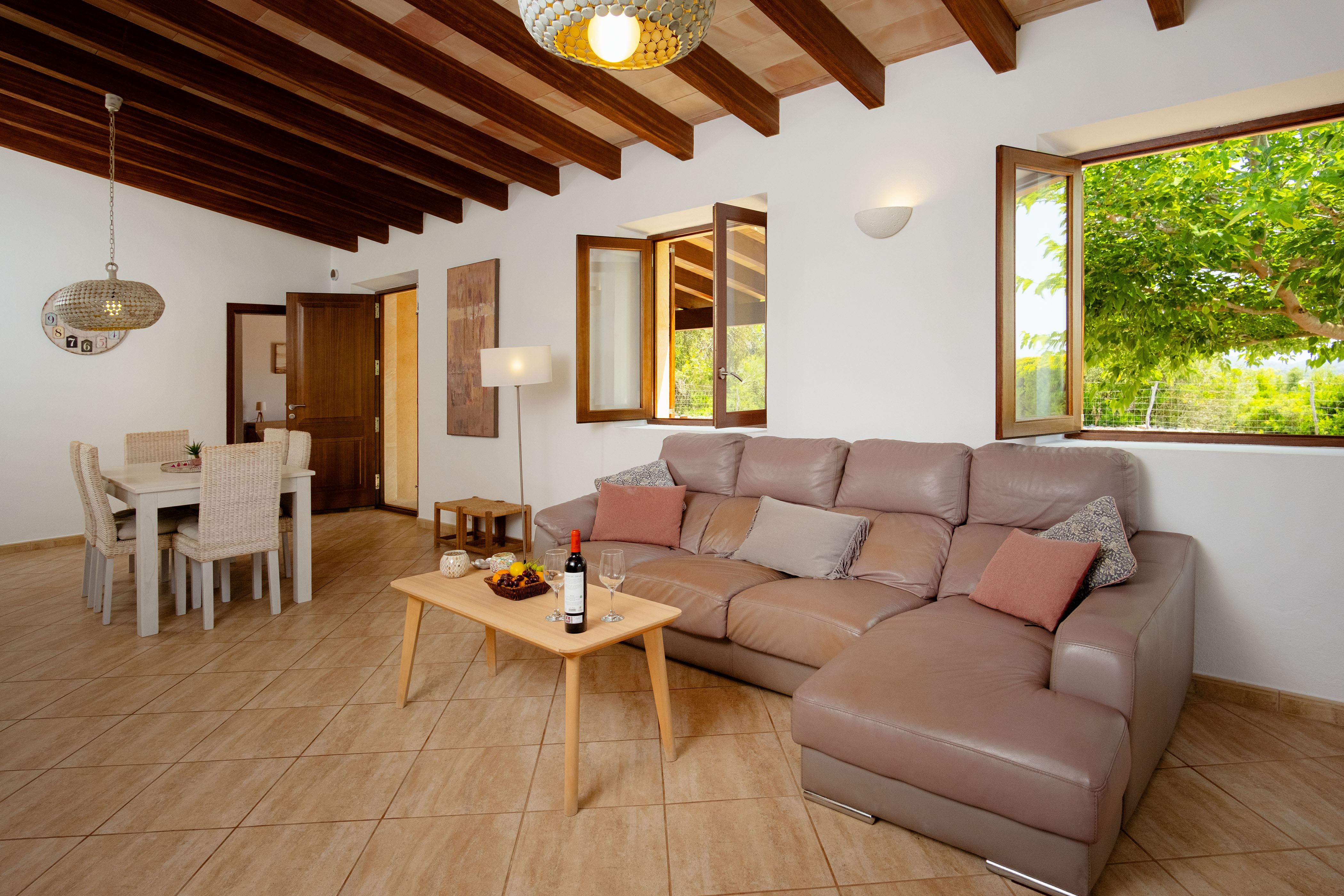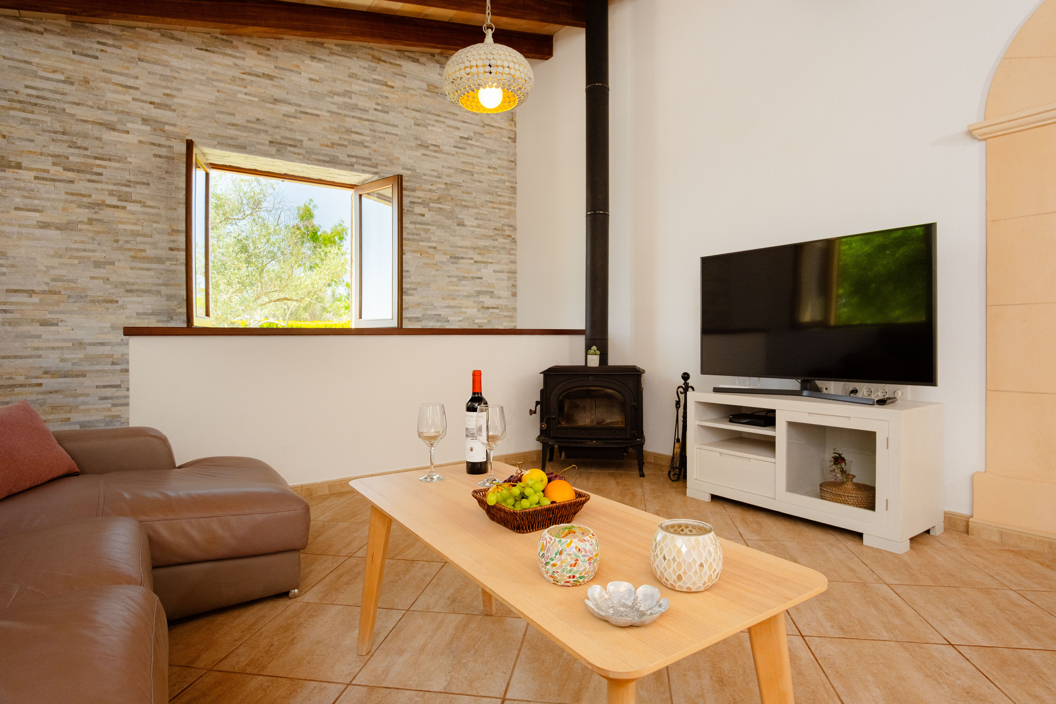 Binnen, op één verdieping, bevindt zich een ruime woonkamer met een grote bank om te ontspannen en films te kijken op de smart-tv met airconditioning. De woonkamer heeft een geïntegreerde eethoek waar u met z'n allen kunt genieten van heerlijke maaltijden, bereid in de volledig uitgeruste keuken met keramische kookplaat. Voor het slapengaan zijn er in totaal drie slaapkamers. Eén slaapkamer heeft twee eenpersoonsbedden en de andere twee hebben een tweepersoonsbed. Eén van deze appartementen beschikt over airconditioning en een eigen badkamer met douche. Een andere badkamer met bad bedient de rest van het huis. Alle slaapkamers hebben toegang tot een gemeubileerd terras waar u kunt genieten van een heerlijk ontbijt met uitzicht op de bergen.