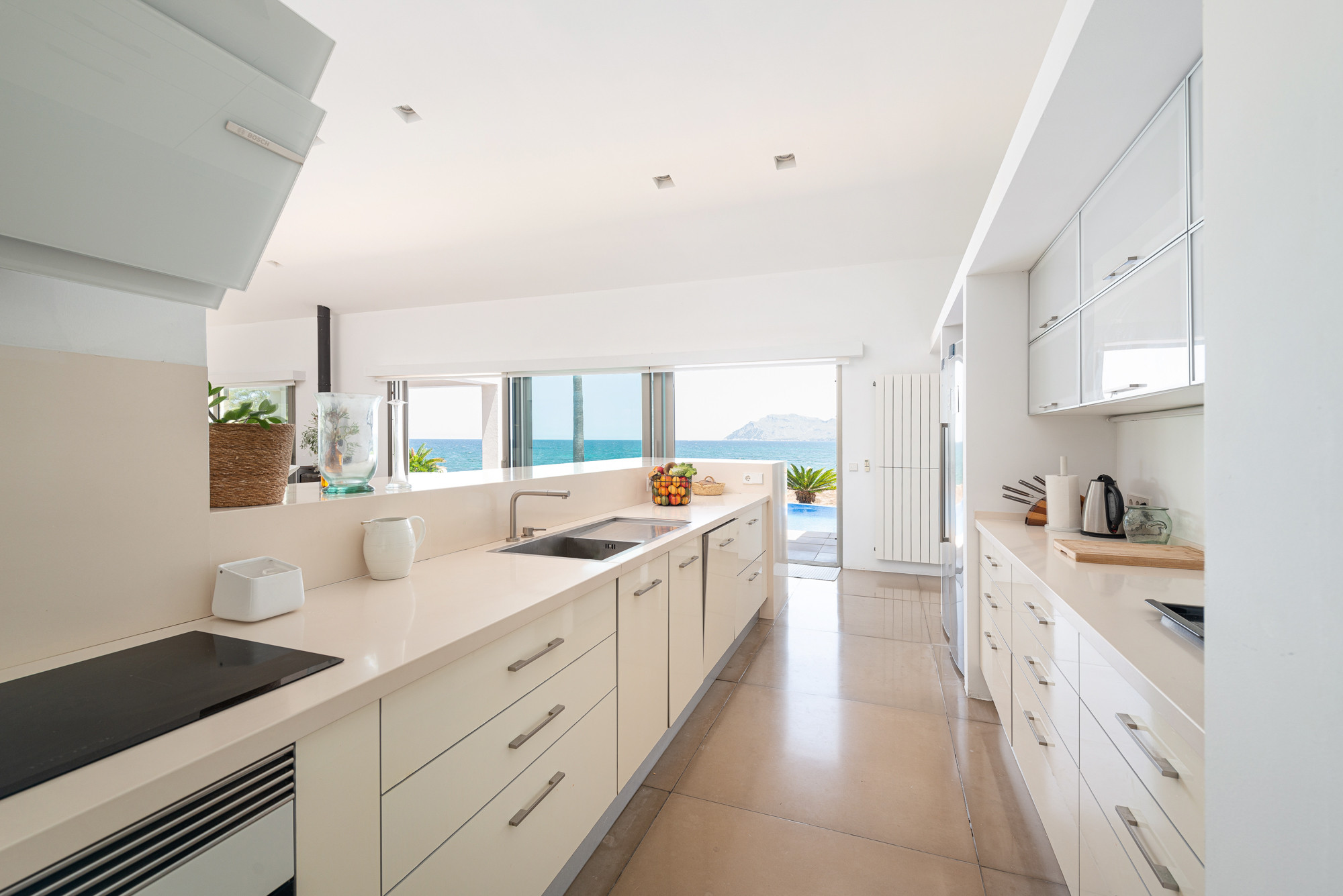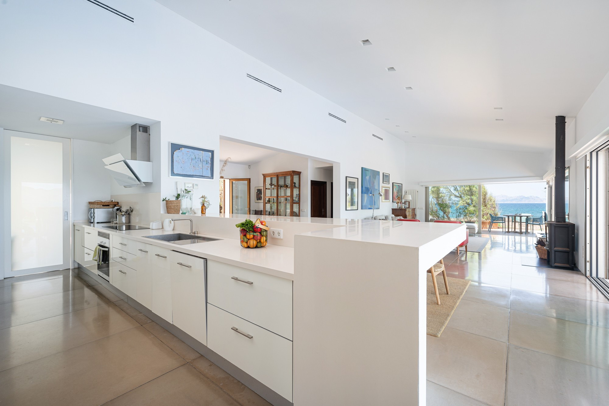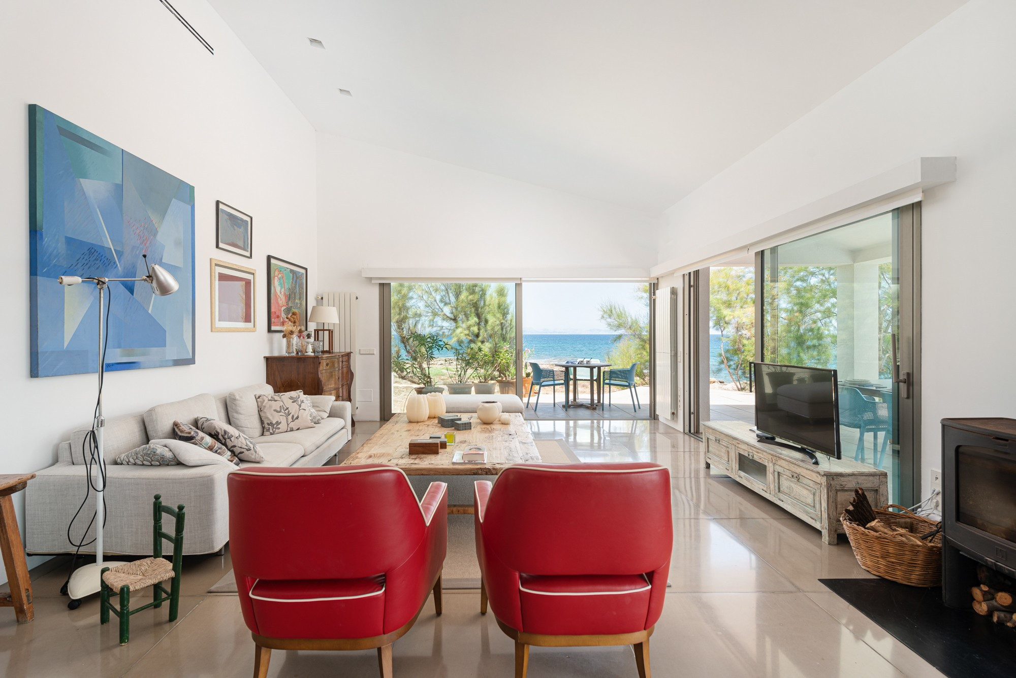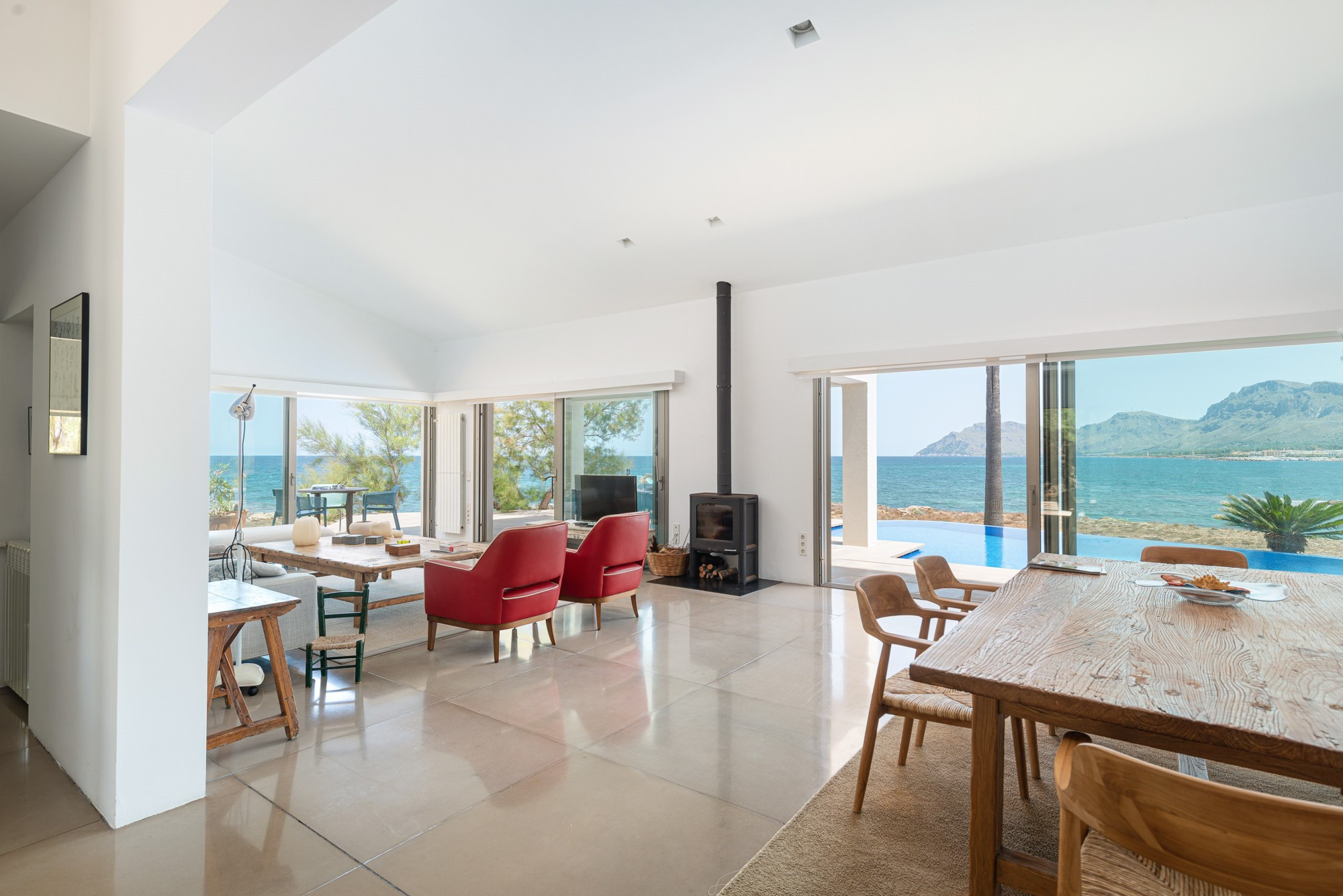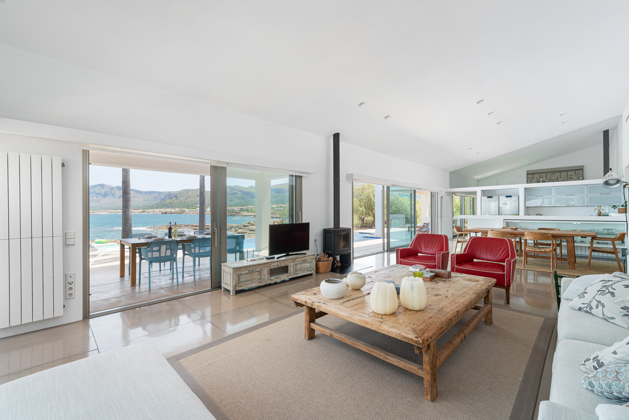 Het interieur is verdeeld over twee verdiepingen. Op de begane grond wordt u verwelkomd door een ruime woon-eetkamer, compleet met airconditioning en satelliet-tv. Vanaf hier is het uitzicht op zee simpelweg onverslaanbaar, wat een warme en uitnodigende sfeer creëert voor gezinnen.