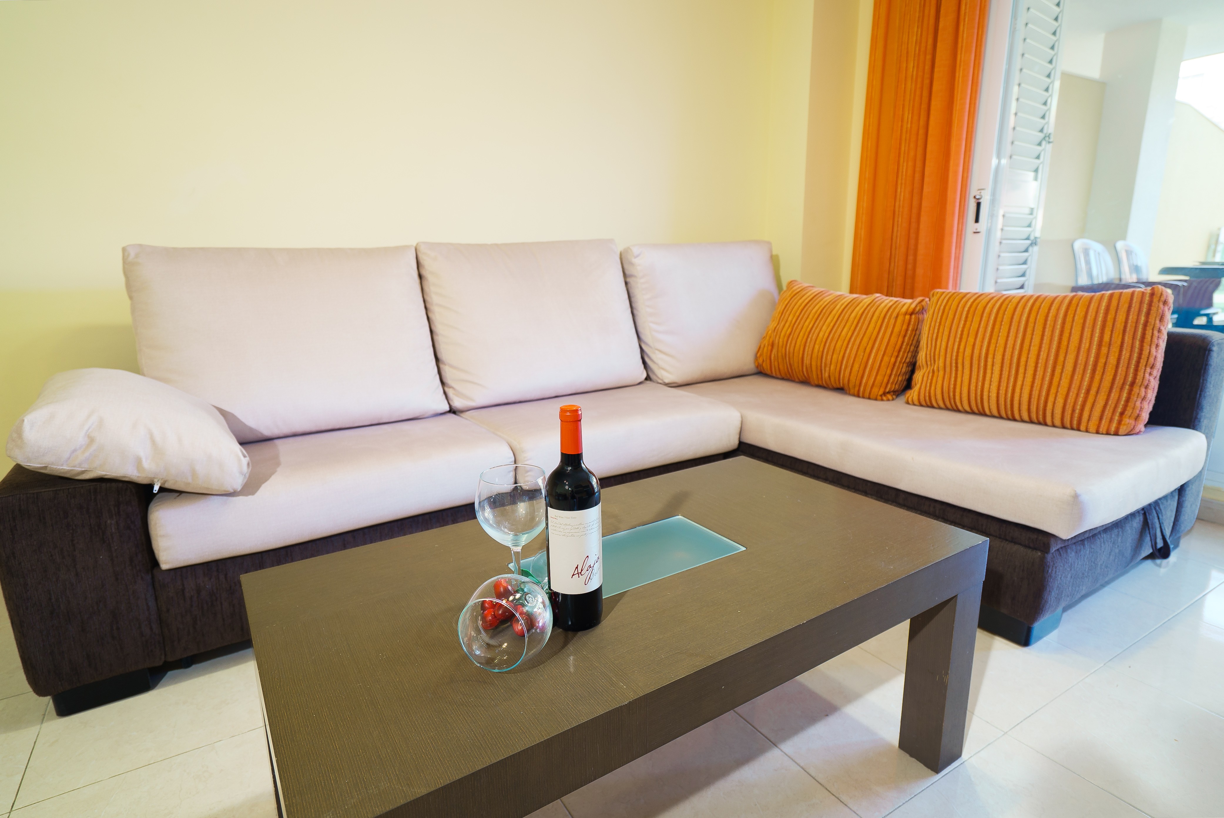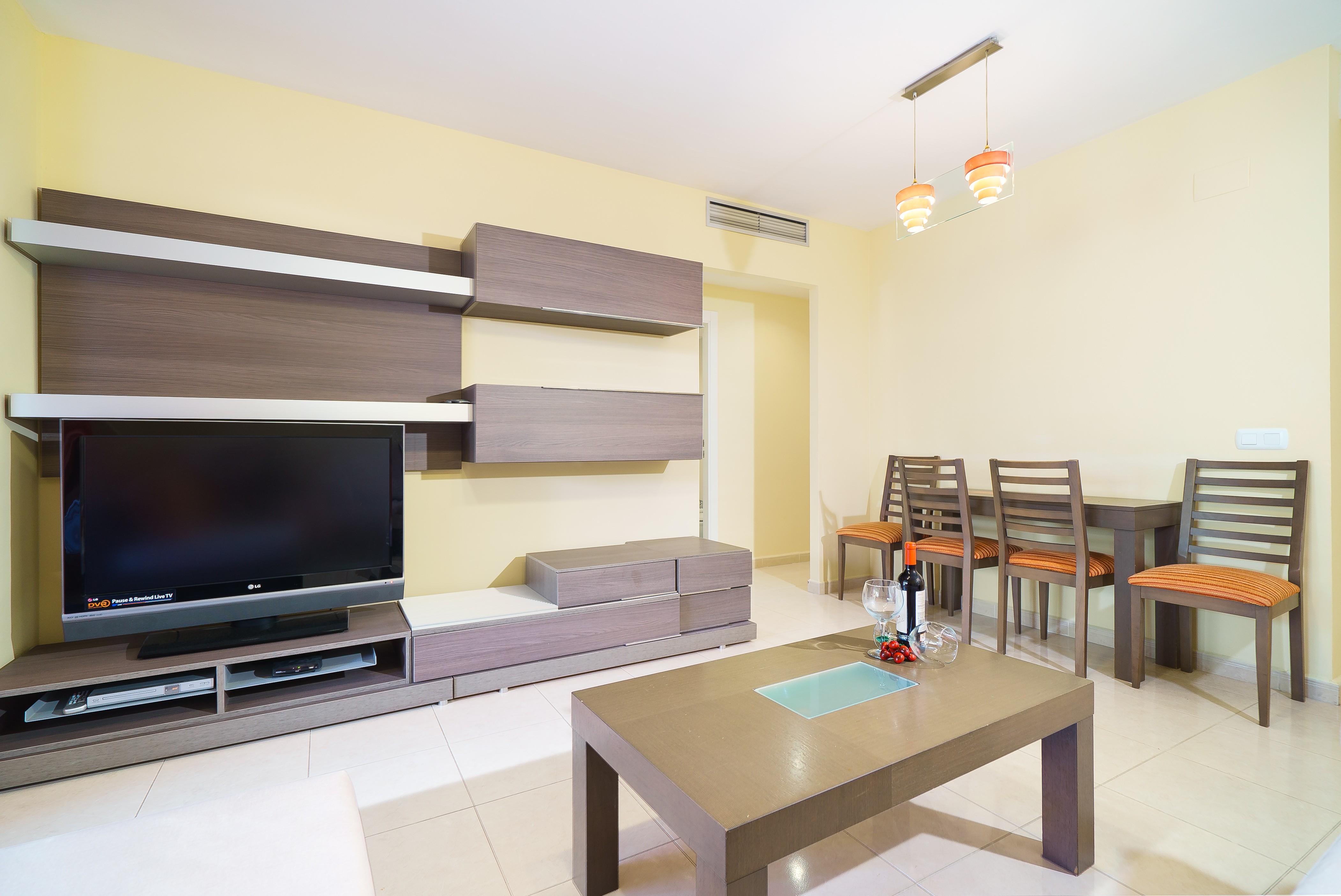 - Heldere woon-eetkamer met chaise longue bank en TV