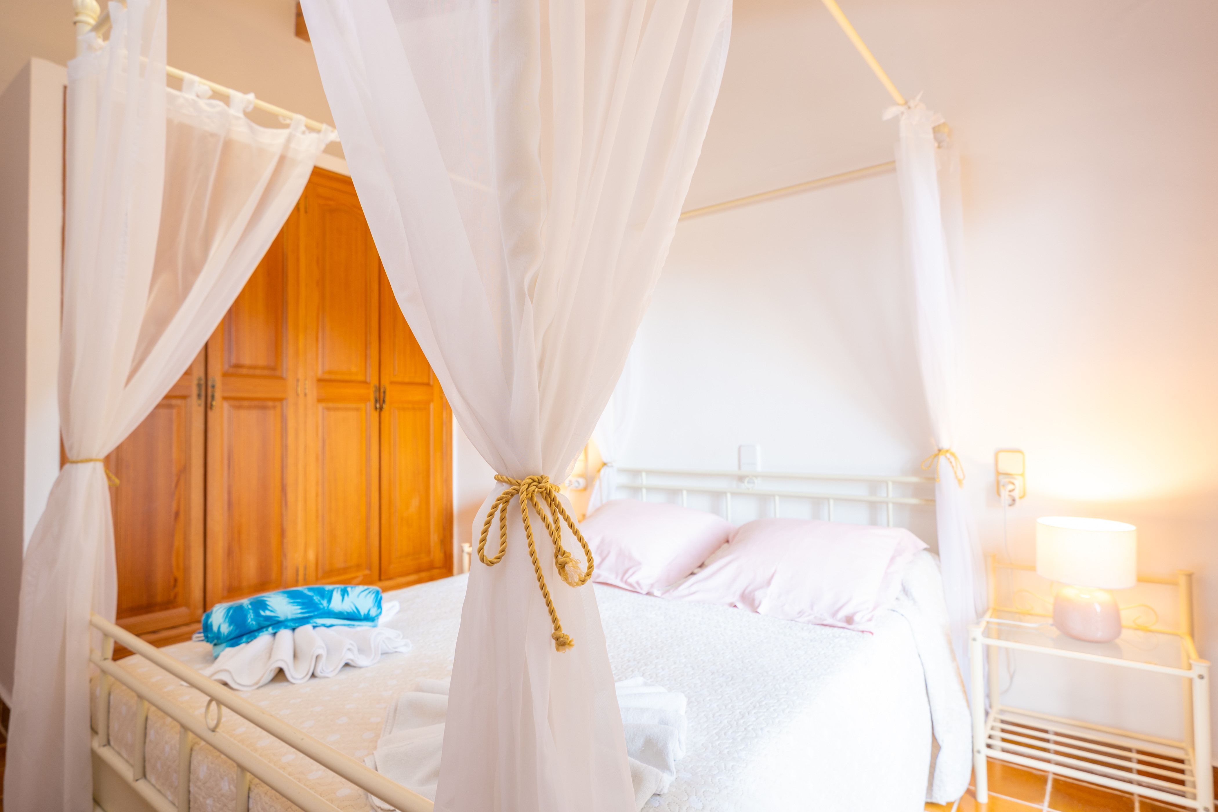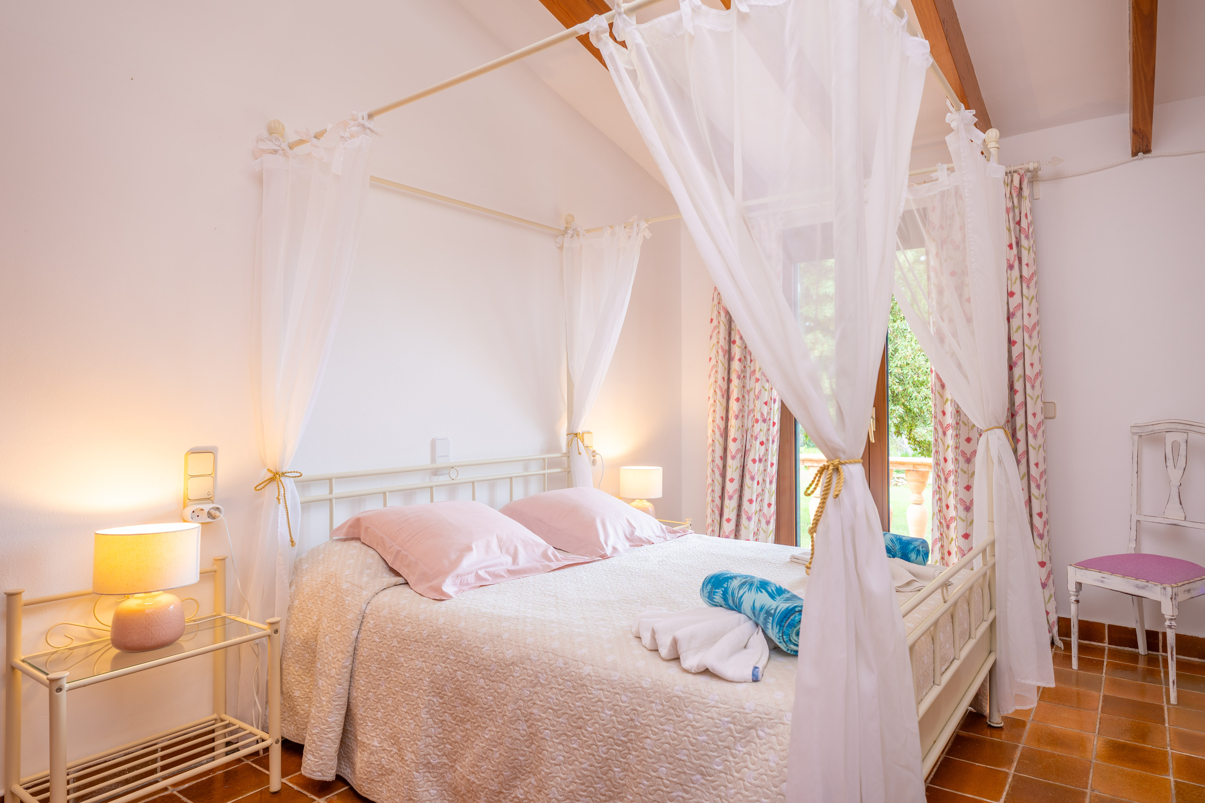 Er zijn vier badkamers met douches - waarvan twee en suite. Op de begane grond vindt u vier slaapkamers: drie met tweepersoonsbedden en één met twee eenpersoonsbedden, allemaal uitgerust met ventilatoren, verwarming, kledingkasten en directe toegang naar buiten. De bovenverdieping herbergt de vijfde slaapkamer, ingericht met twee eenpersoonsbedden, een ventilator, verwarming en een eigen privéterras.