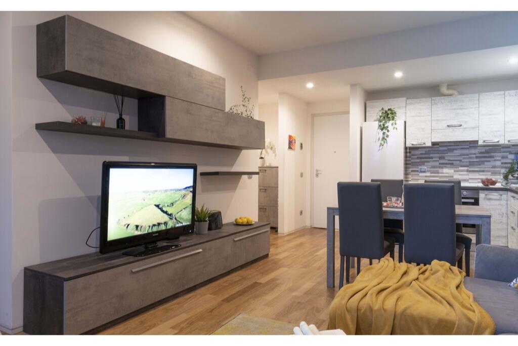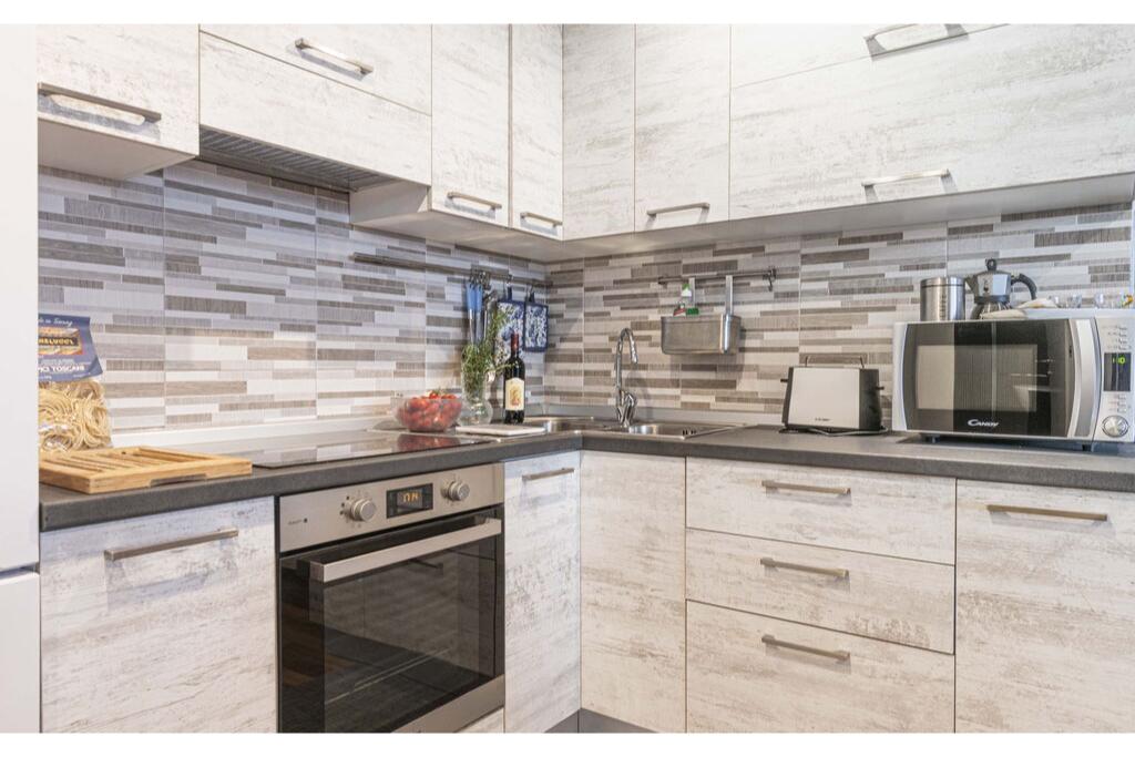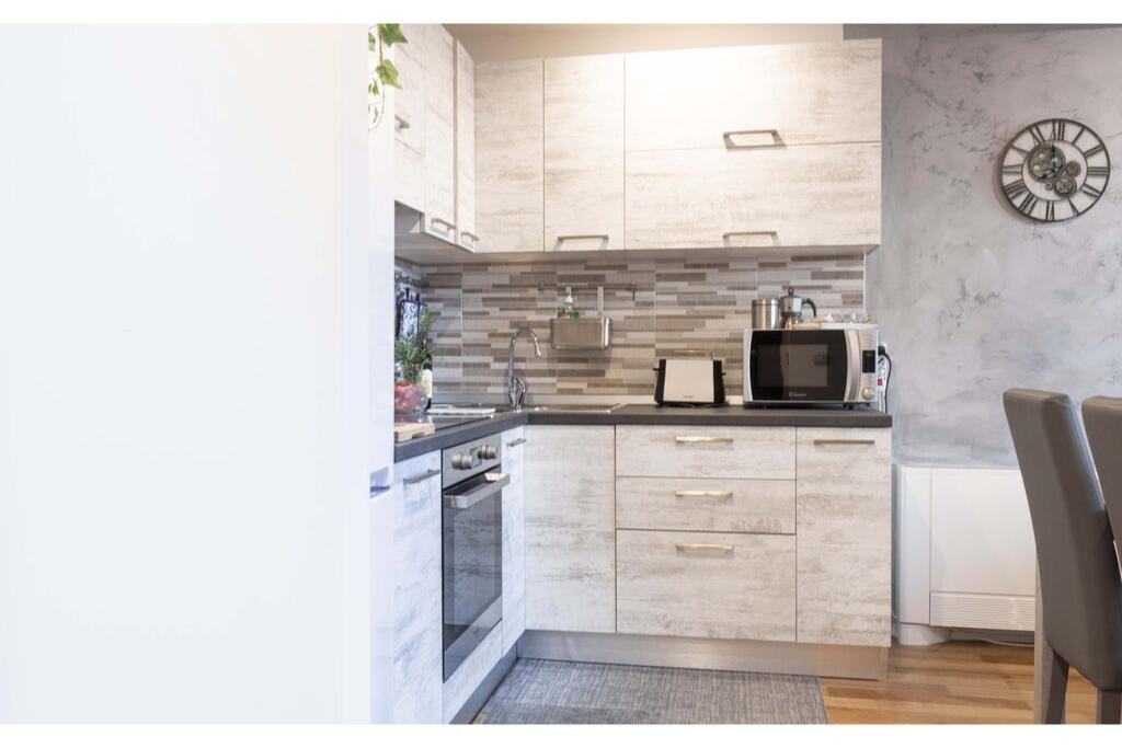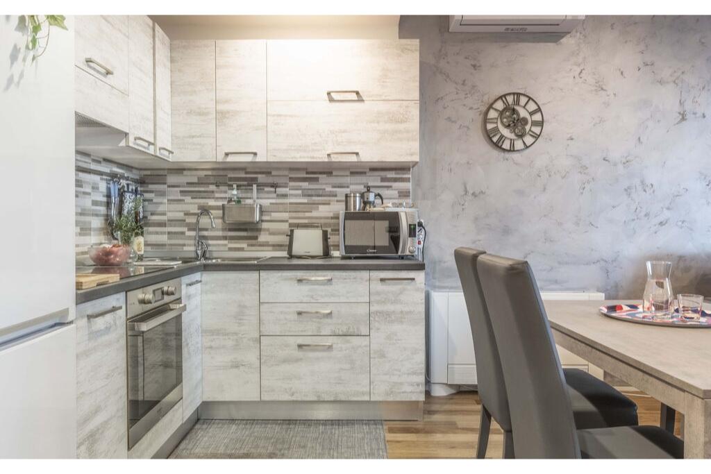 - grote woonkamer met volledig uitgeruste open keuken en eettafel