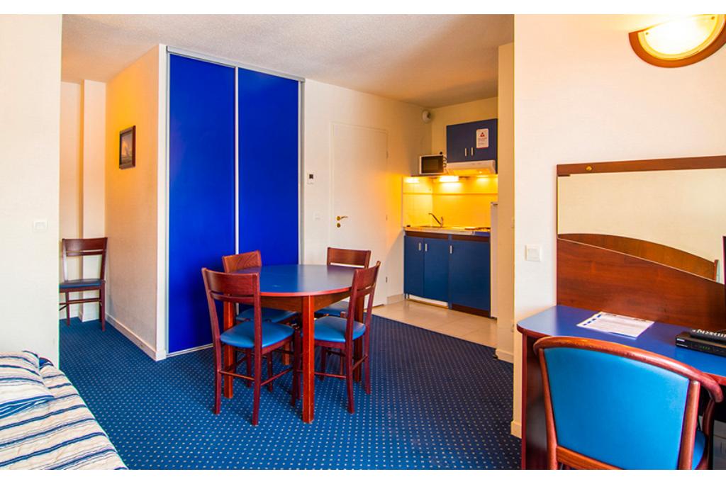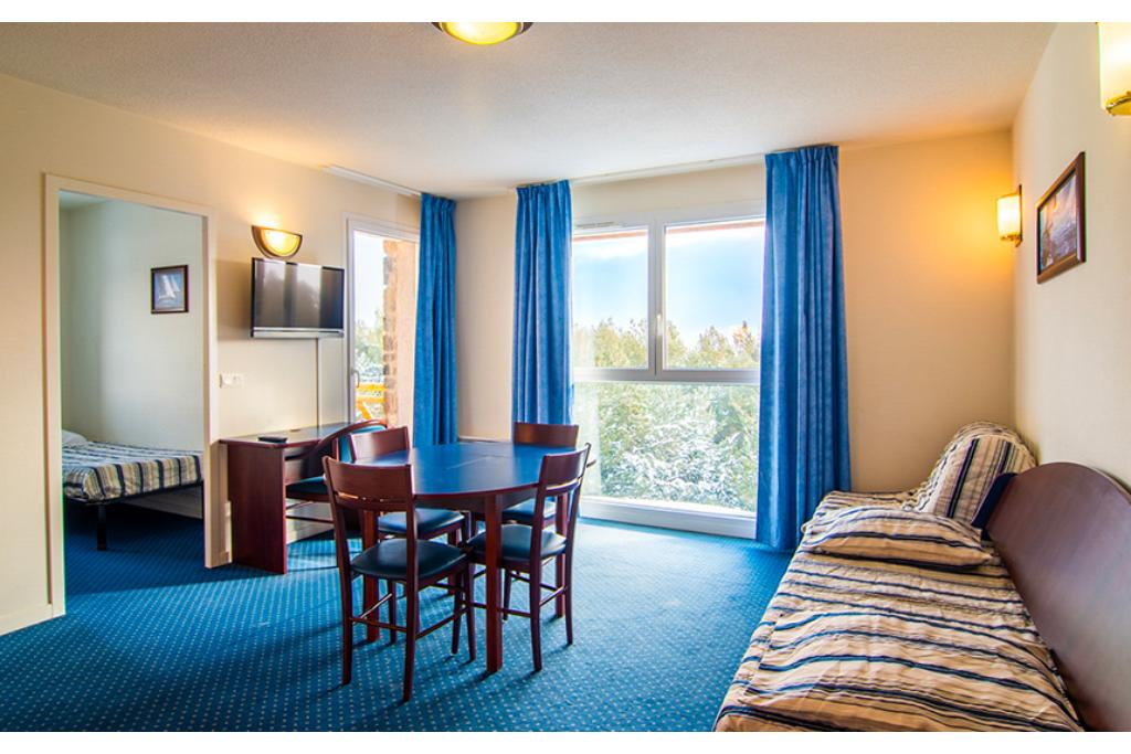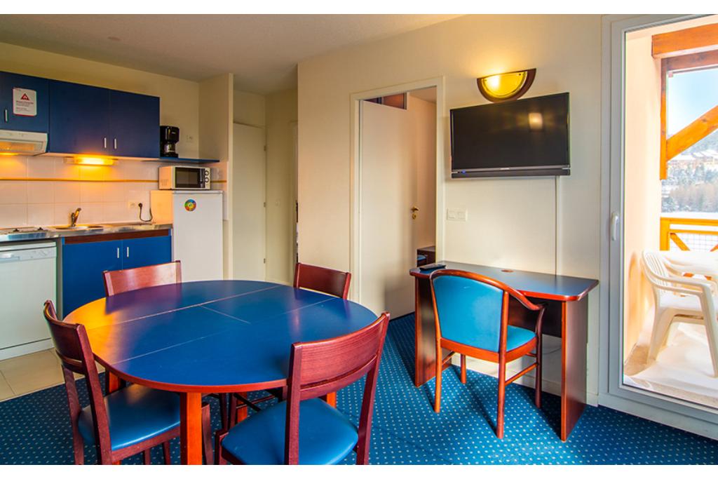 Woonkamer met flatscreen-tv, tafel, stoelen en bureau 1 uitschuifbare slaapbank (2 personen)