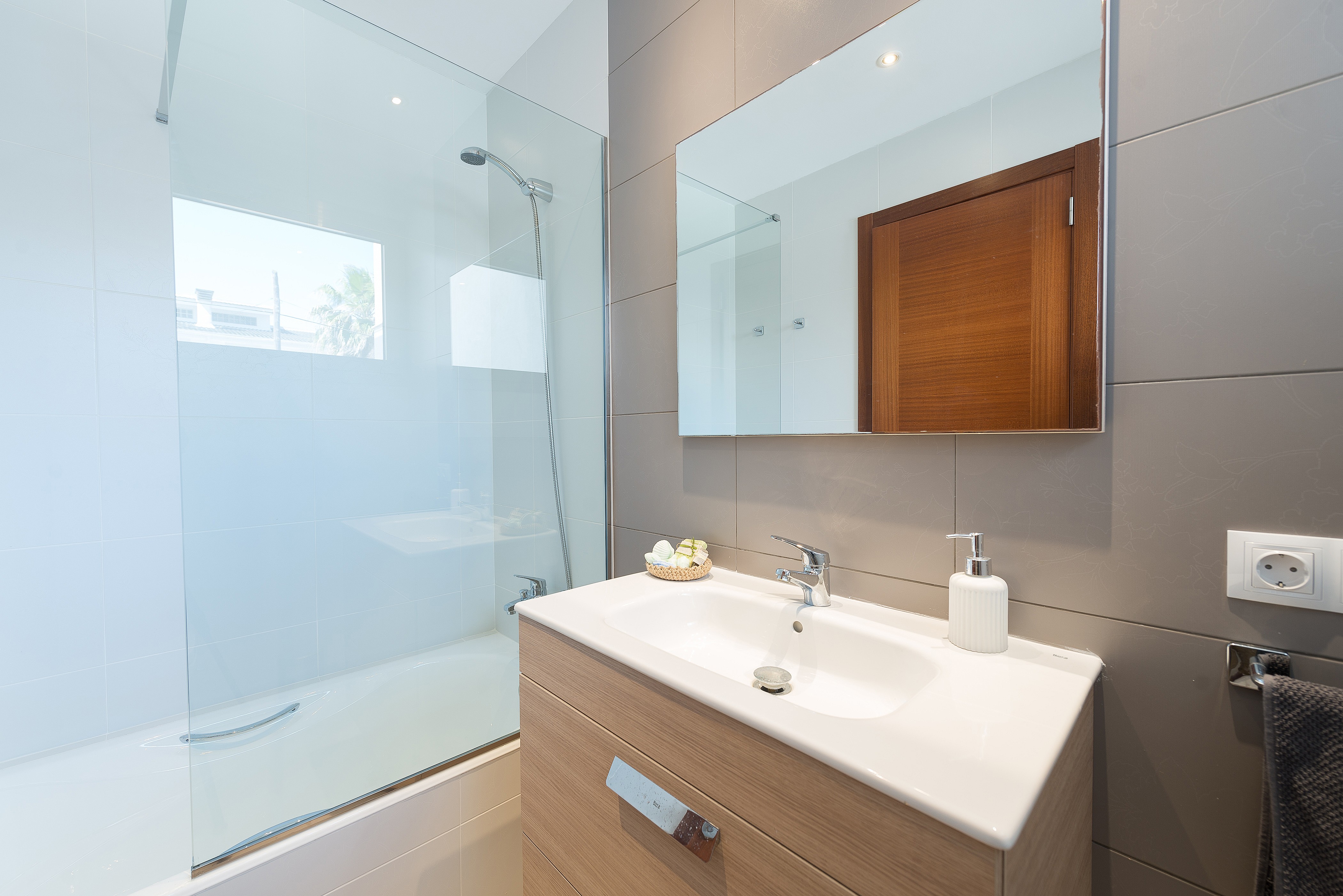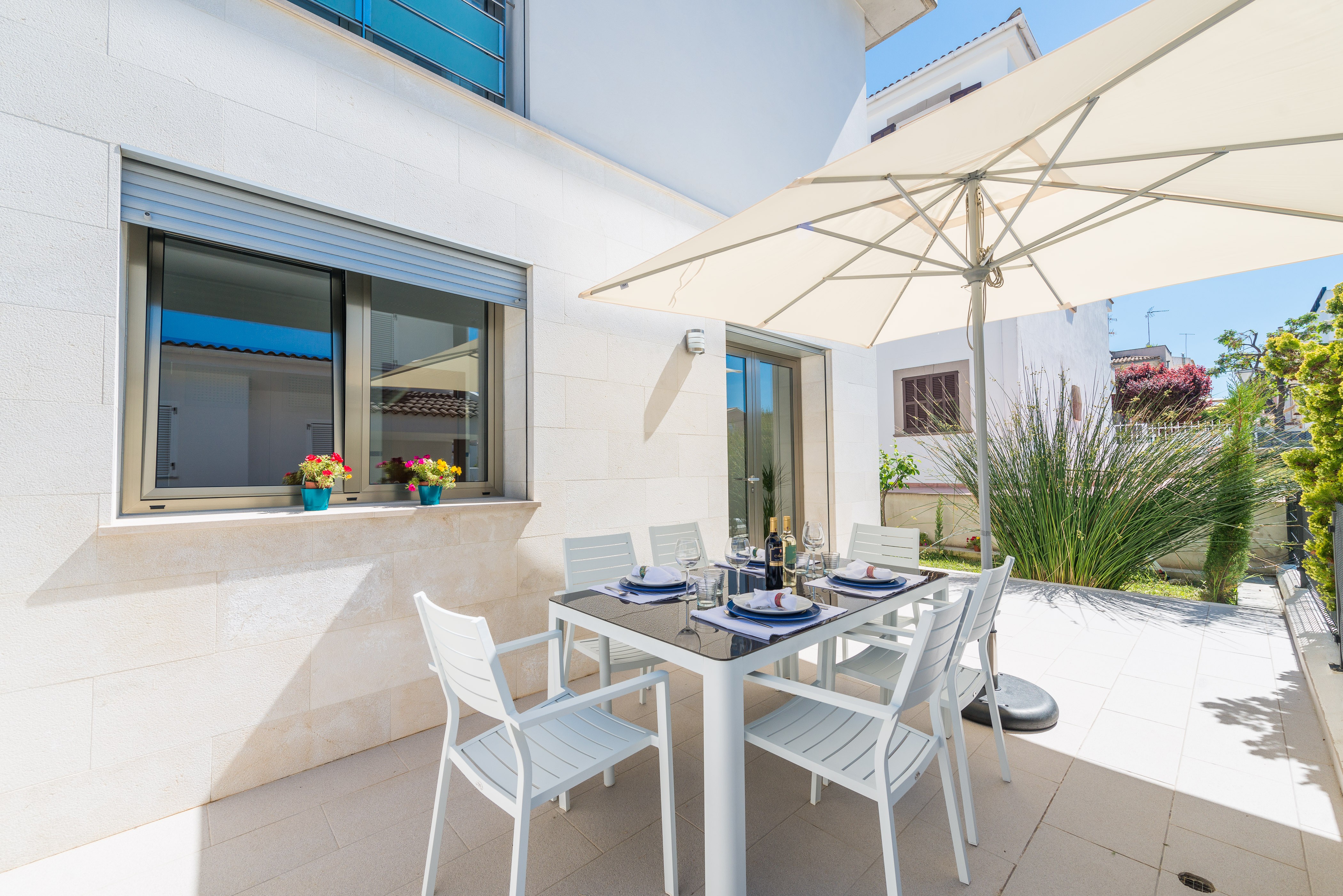 Het huis is gebouwd in 2017 en heeft een moderne mediterrane stijl, met stenen vloeren, lichte meubels en mooie kunstwerken die een levendige toets aan de kamers geven. De ruime woonkamer is uitgerust met satelliet-tv en gaat open naar de eetruimte, die plaats biedt aan 6 personen. Een deur van de eetkamer leidt naar het achterterras, wat het gemakkelijk maakt om je barbecue buiten ook binnen te genieten als je dat wilt. De open keuken is eenvoudig uitgerust voor het bereiden van lichte maaltijden, met een keramische kookplaat, een magnetron en essentiële kookgerei.