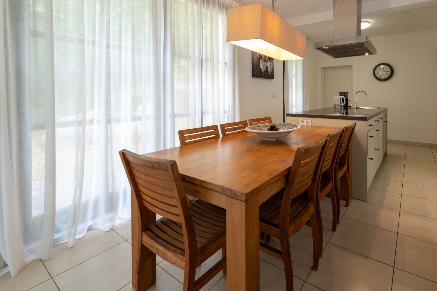 De ruime woonkamer is een uitnodigende ruimte om te ontspannen, met zachte zitplaatsen, een open haard en een tv met internationale zenders. De moderne, open keuken is volledig uitgerust met ingebouwde apparatuur en een kookeiland, waardoor het gemakkelijk is om heerlijke maaltijden te bereiden.
