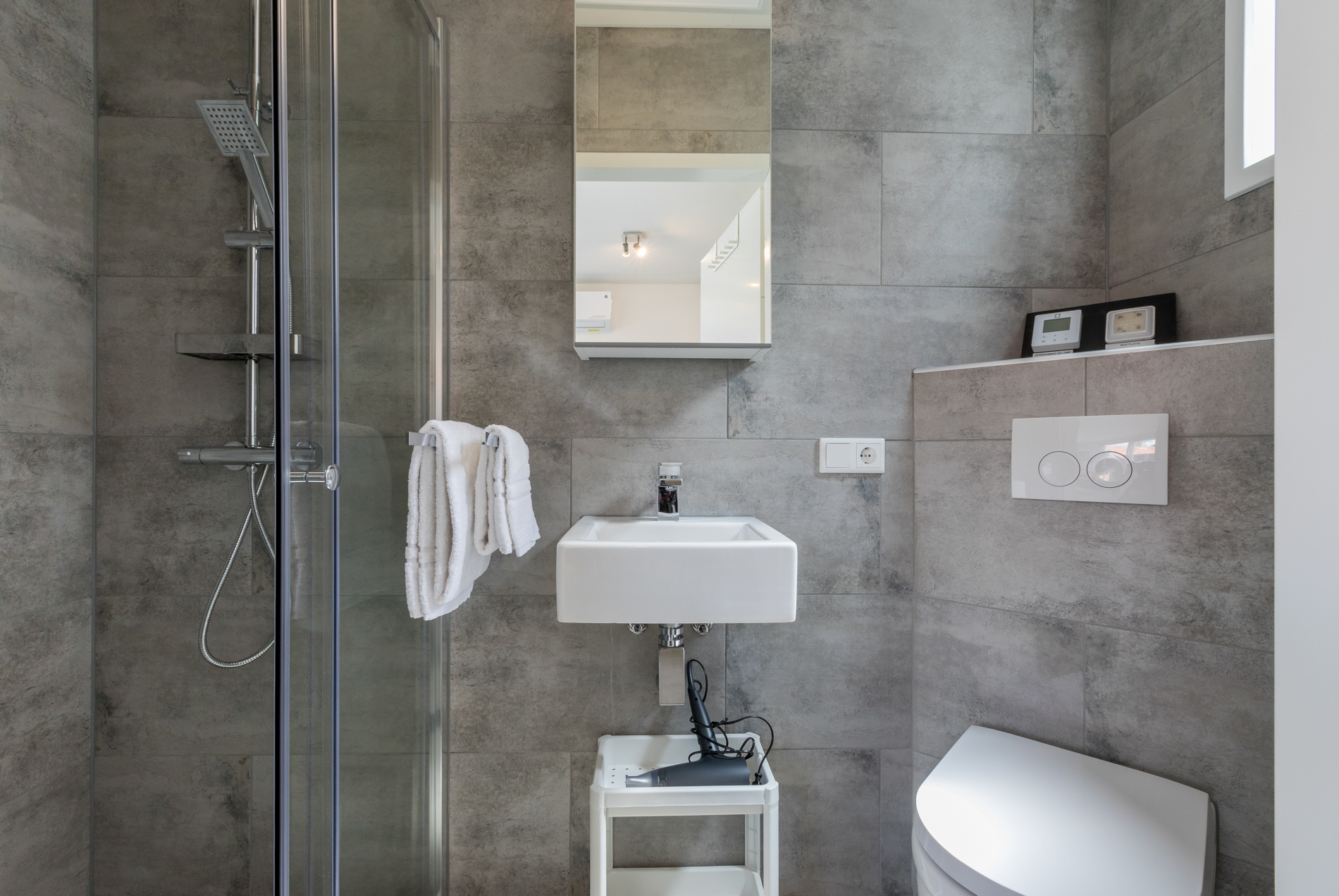 De badkamer heeft een toilet, een douche, een wandkast met opbergruimte en een föhn. De open keuken is voorzien van een kookplaat, een combimagnetron, een vaatwasser, een koelkast met vriesvak, een waterkoker en een Nespresso-koffiezetapparaat. Aangrenzend aan de keuken is de gezellige woonkamer, die een flatscreen-tv heeft, ideaal om te ontspannen en je favoriete programma's te bekijken. De woonkamer leidt naar het privéterras, volledig betegeld (15 m²), dat naar het zuidwesten is gericht, zodat je zowel van de zon als van de schaduw kunt genieten gedurende de dag. Het terras is ingericht met een tuinset en voor de ultieme buitenervaring raden we aan je eigen barbecue mee te nemen. Fietsen kunnen veilig worden geparkeerd in de fietsenrek op het terras (niet overdekt), dat ook twee oplaadpunten voor elektrische fietsen heeft.