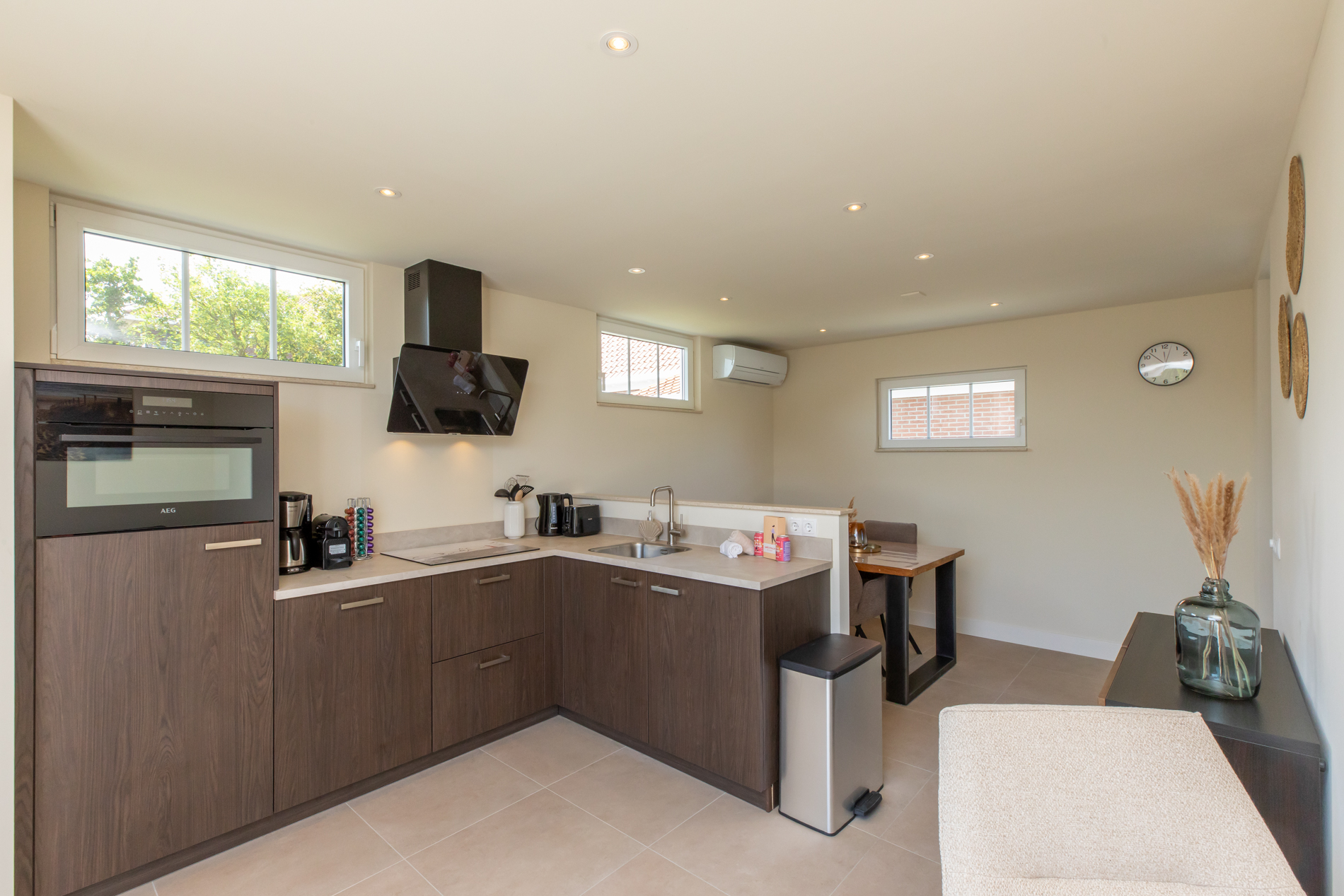 Voor kookliefhebbers is de keuken volledig uitgerust met moderne apparatuur, waaronder een kookplaat, een combimagnetron met ovenfunctie, een vaatwasser, een koelkast met vriesvak en een broodrooster. Koffieliefhebbers kunnen kiezen tussen een Nespresso-apparaat en een filterkoffiezetapparaat, terwijl een waterkoker klaarstaat voor een snelle kop thee.