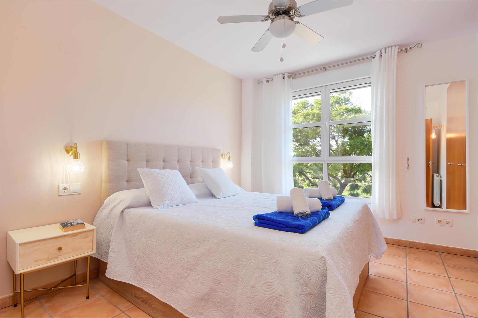 • Slaapkamer met tweepersoonsbed, ventilator en airconditioning