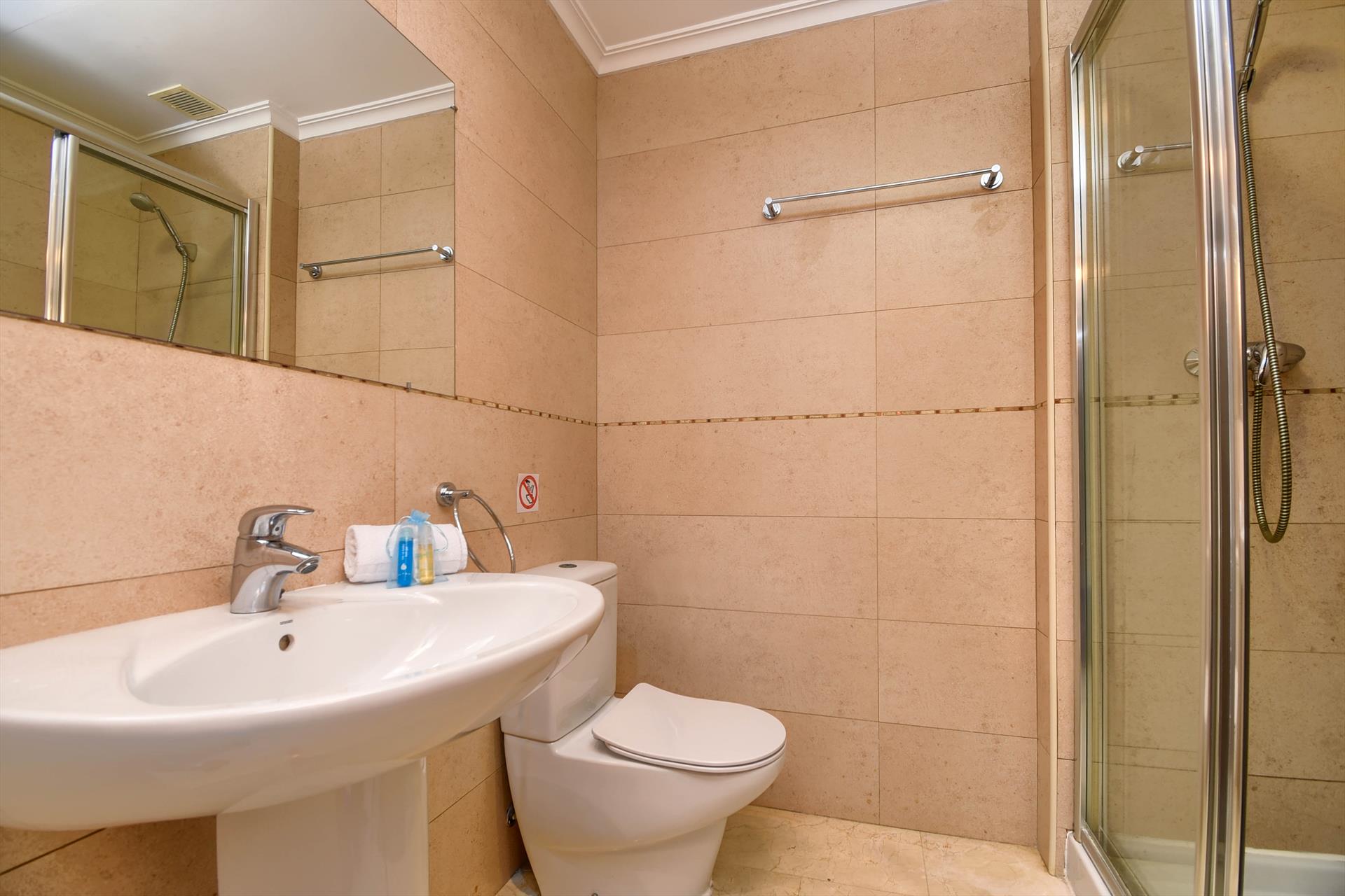 - en-suite badkamer met enkele wastafel, douche en toilet