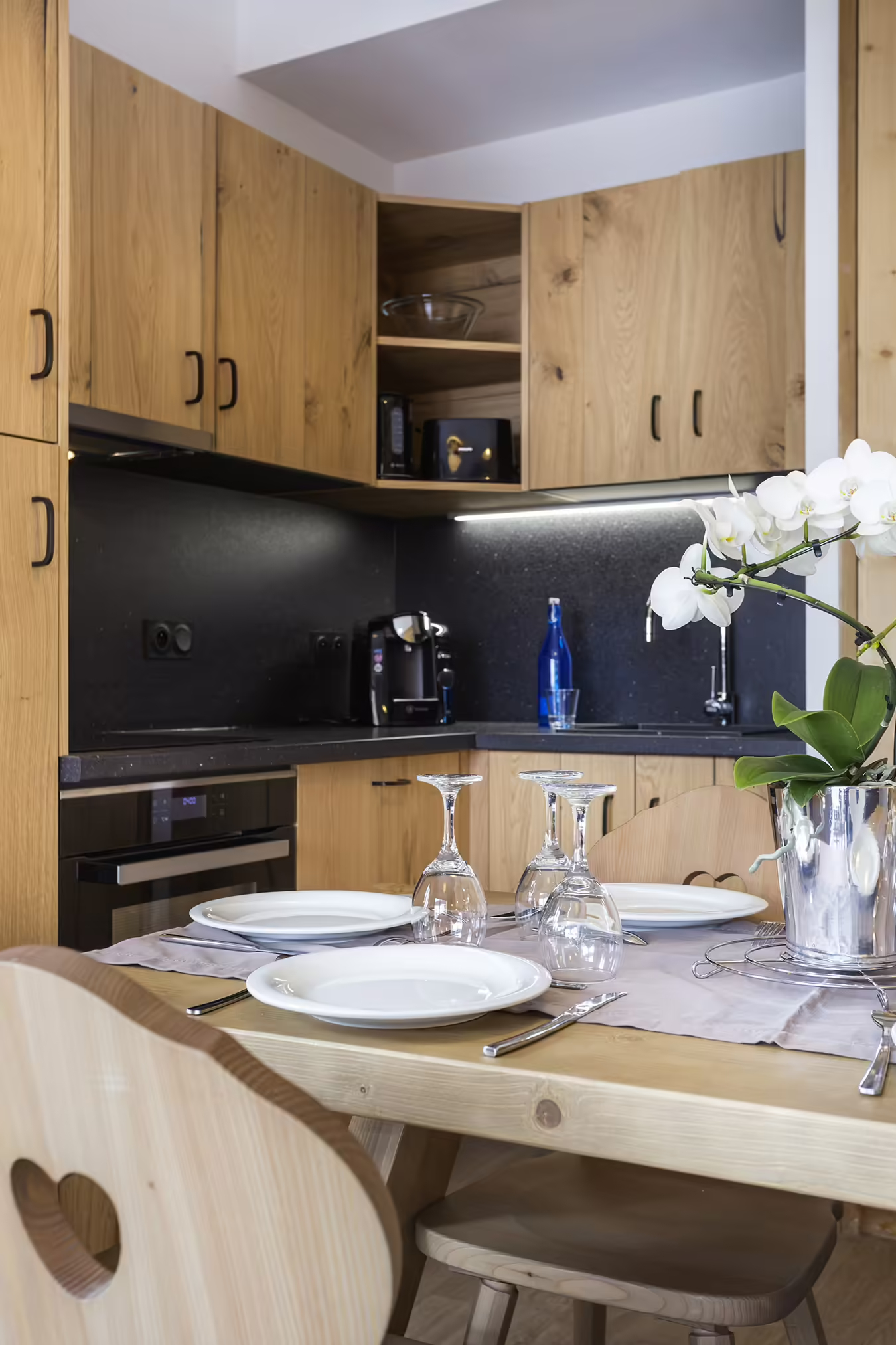 - Open keuken: Keramische kookplaat, vaatwasser, magnetron, koelkast, capsule-koffiezetapparaat, waterkoker, broodrooster