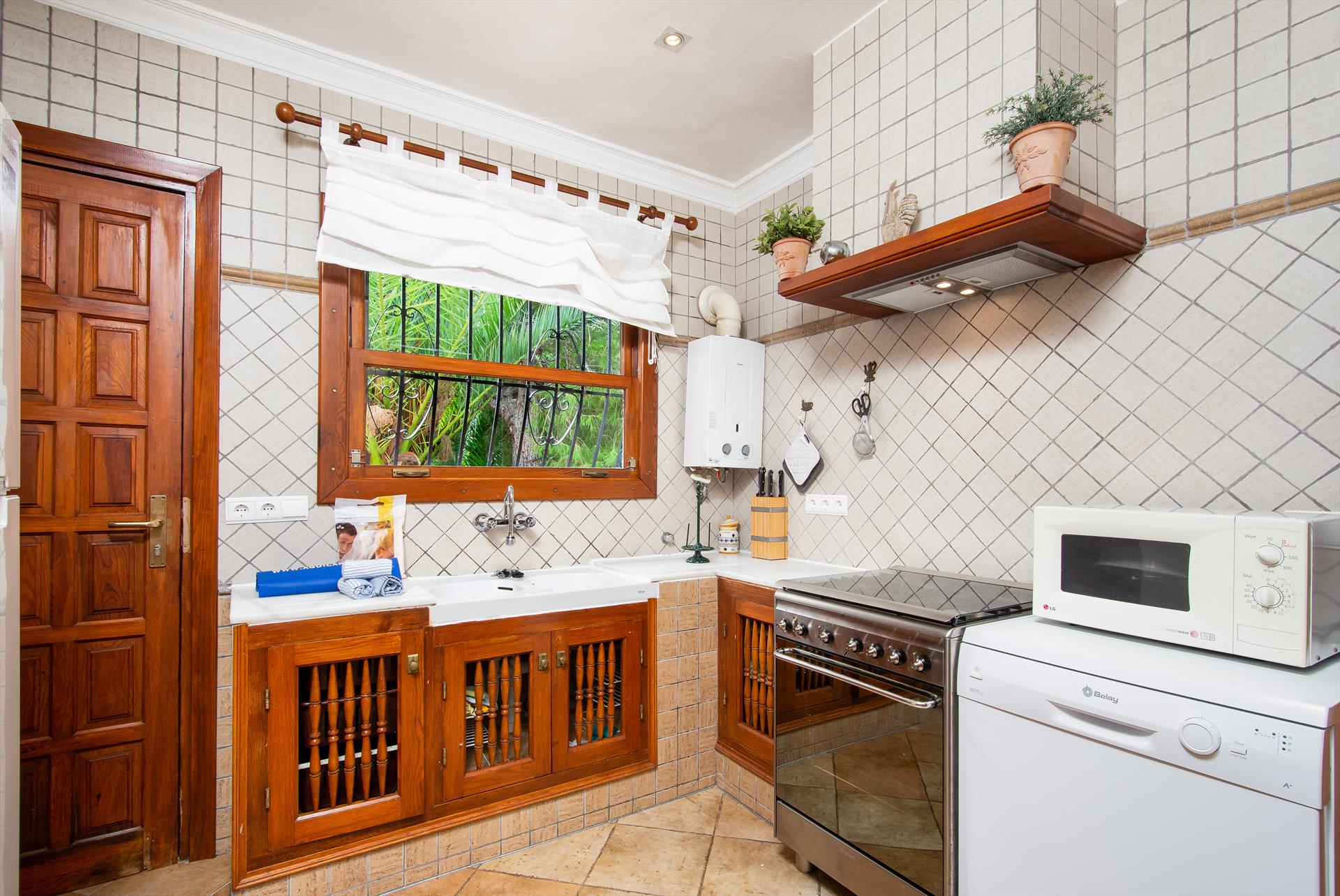 • keuken met gaskookplaat, elektrische oven, magnetron, vaatwasser, koel-vriescombinatie, koffiezetapparaat, waterkoker, mixer, broodrooster en sapcentrifuge