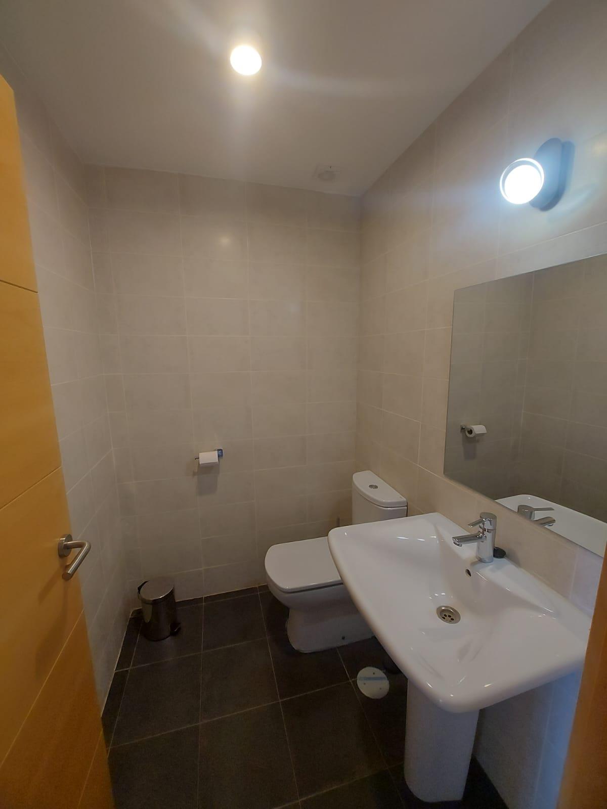 Badkamer met enkele wastafel, douche, toilet en haardroger