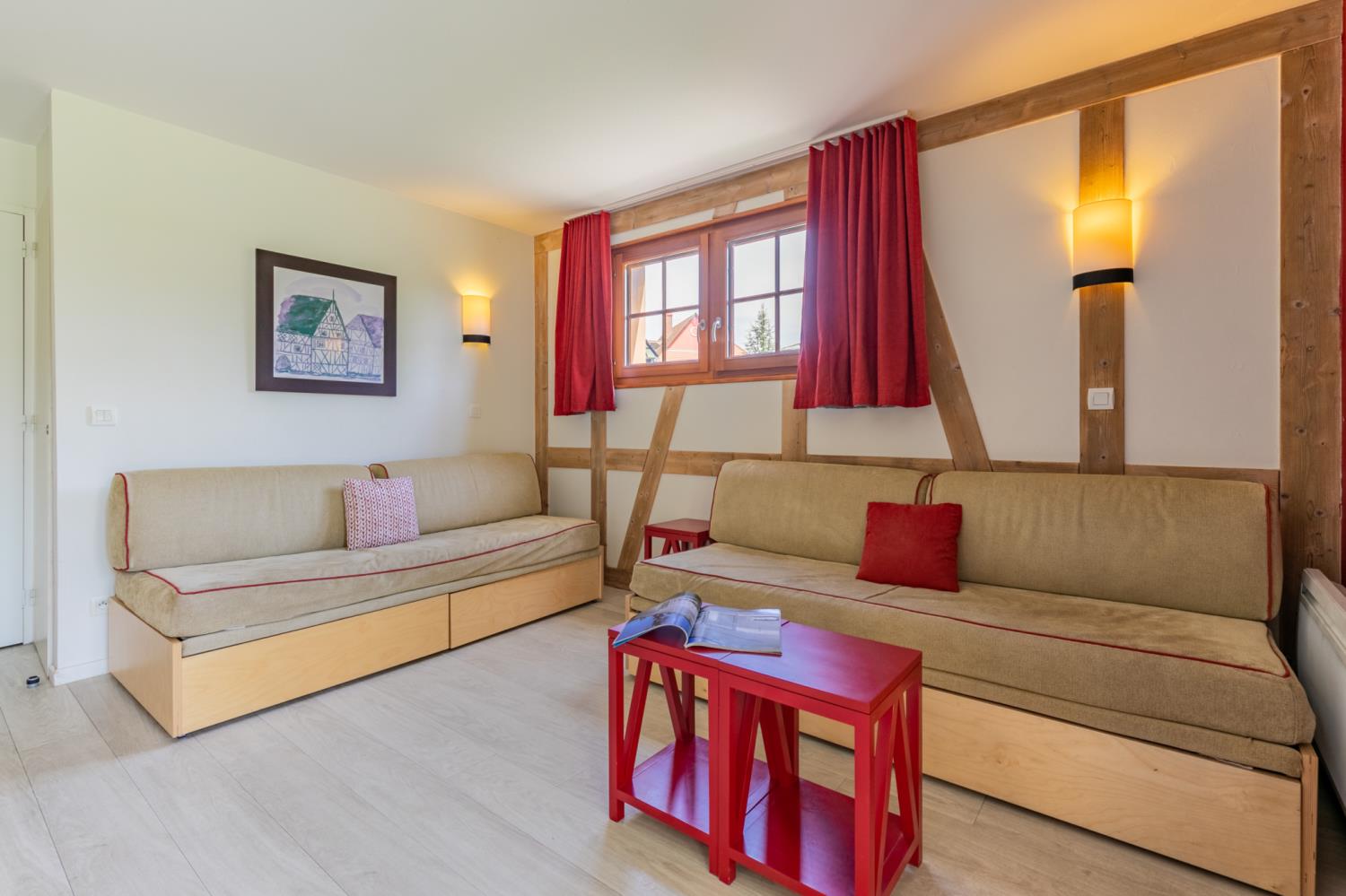 - Woonkamer: 2 divans, waarvan één met uitschuifbed (aanbevolen voor kinderen)