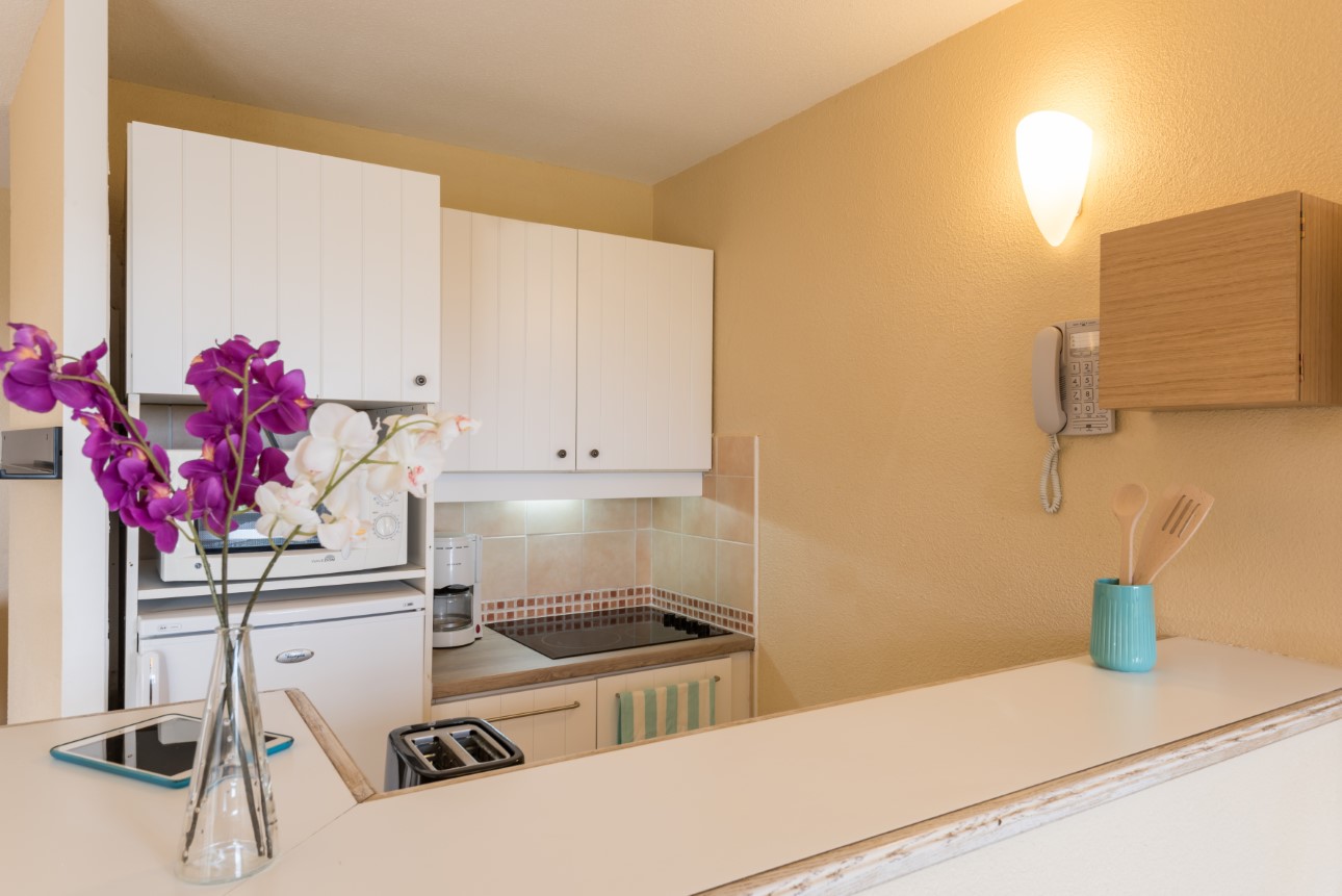 Keuken: Open kitchenette geïntegreerd in de woonkamer.