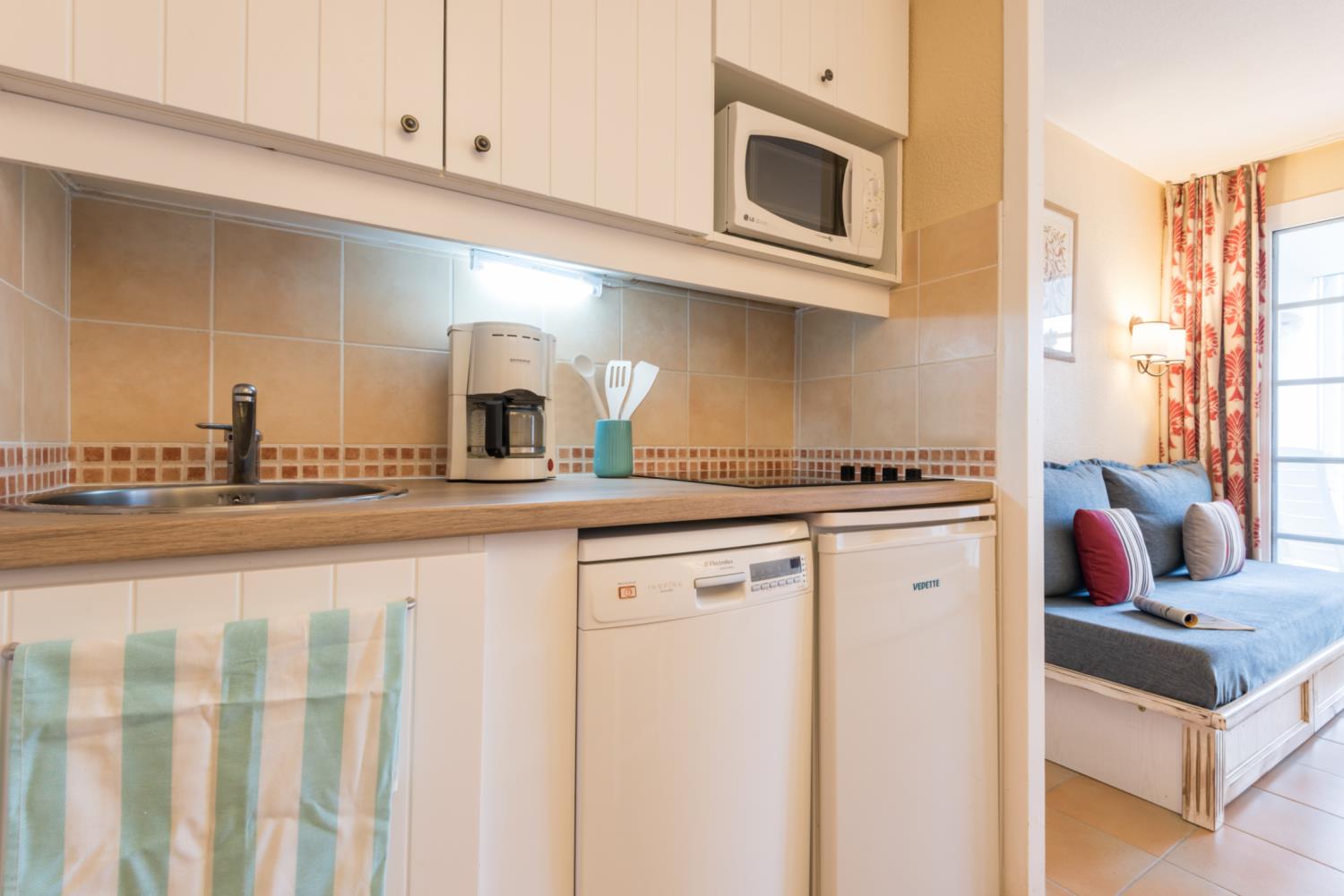 • Voorzieningen van de keuken: Volledig uitgeruste kitchenette met open woonruimte