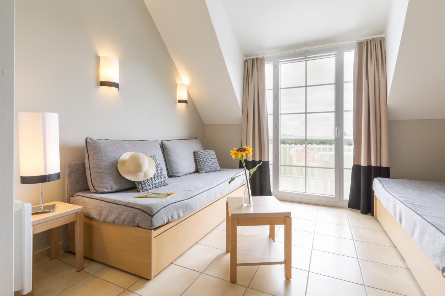 • Voorzieningen woonkamer: 1 tweepersoonsslaapbank in de woonkamer + 1 uitschuifbaar bed (aanbevolen voor kinderen) of 1 tweepersoonsbed in de slaapkamer en dus twee ligbedden waarvan 1 uitschuifbaar bed (aanbevolen voor kinderen)