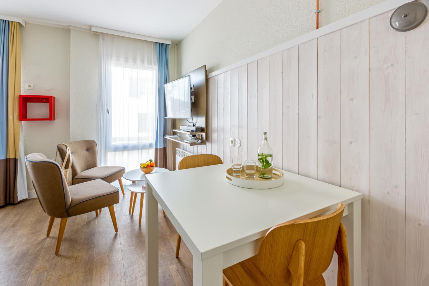 • Keukenfaciliteiten: Uitgeruste open kitchenette en woonkamer