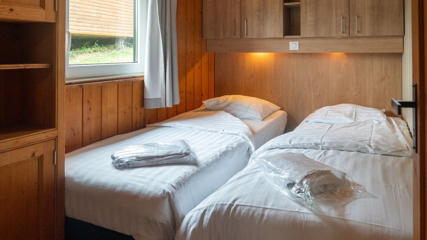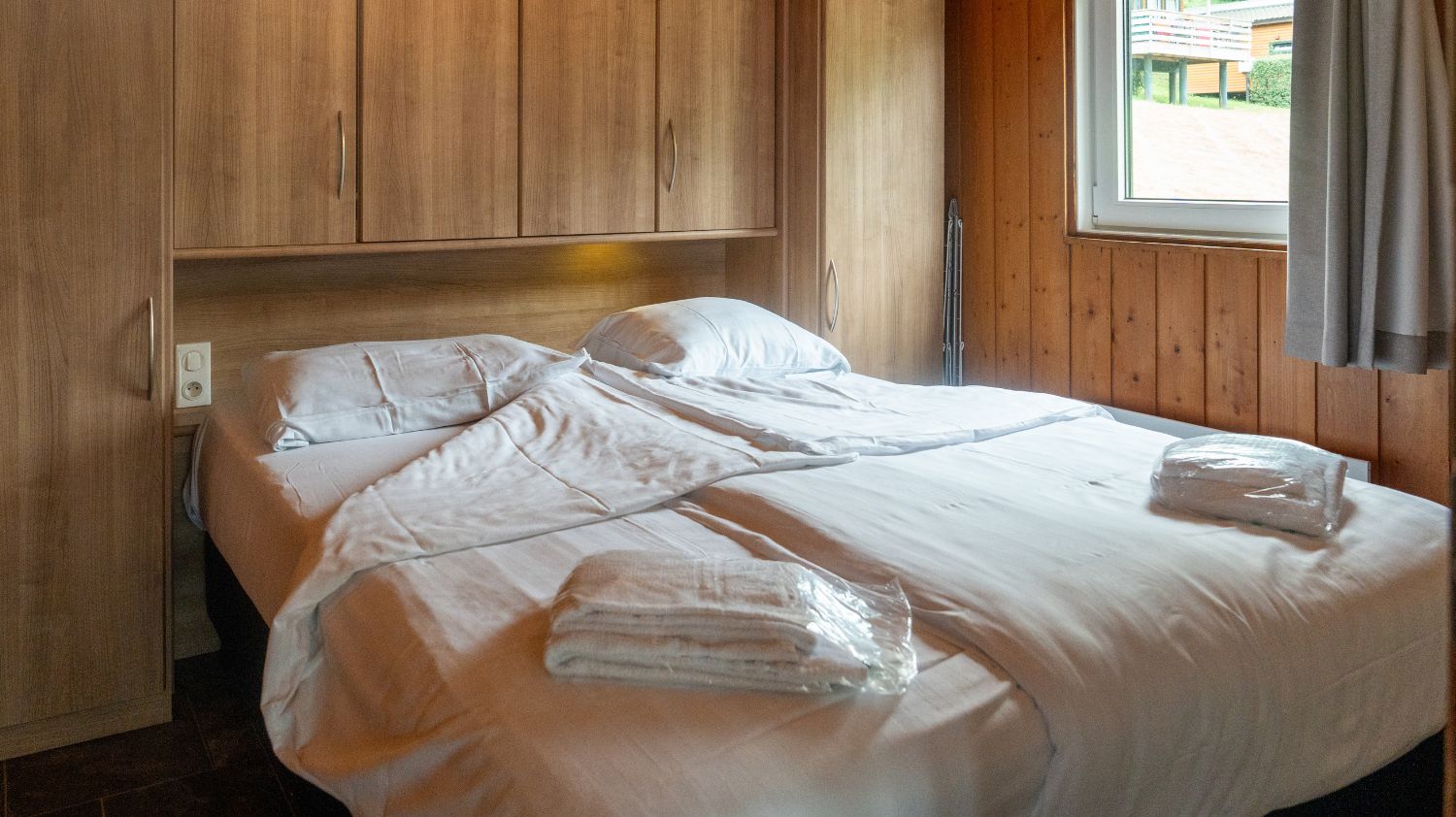 De chalet beschikt over twee slaapkamers; een met een tweepersoons boxspringbed en de ander met twee eenpersoons boxspringbedden. Beide zijn voorzien van dekens en kussens. De badkamer heeft een wastafel, douche en toilet.