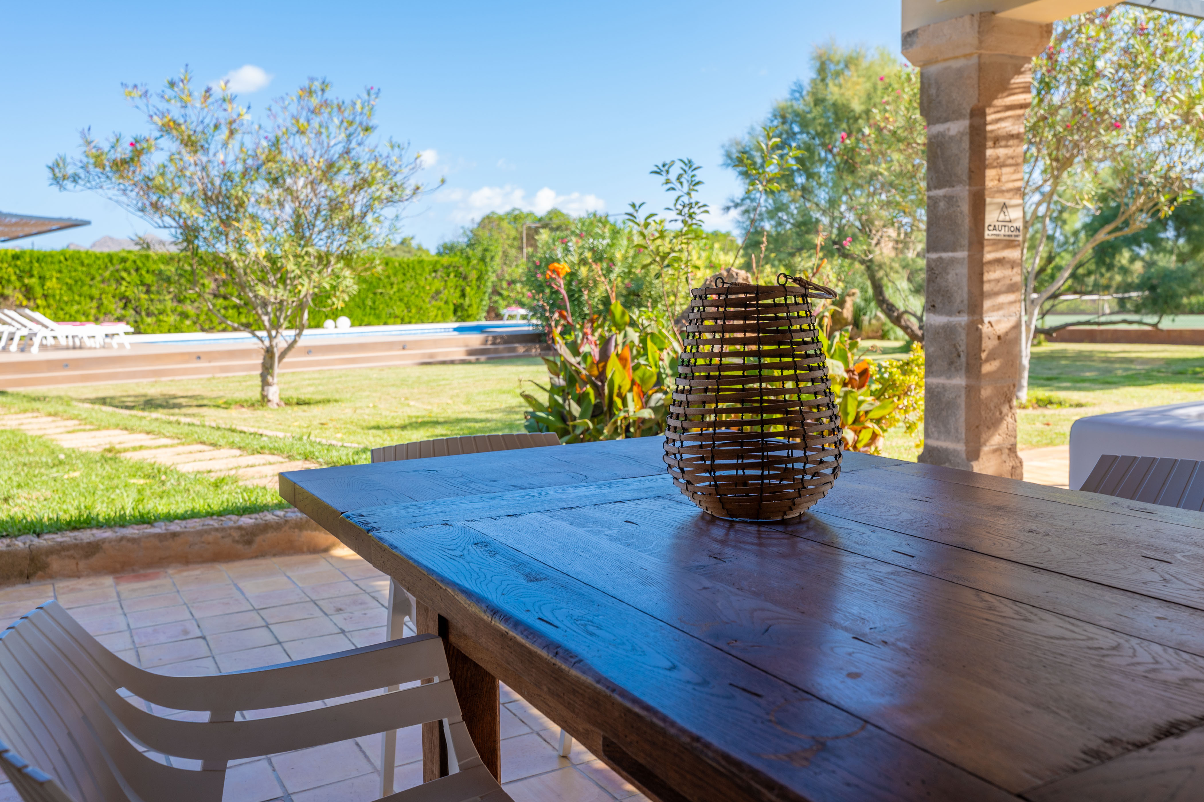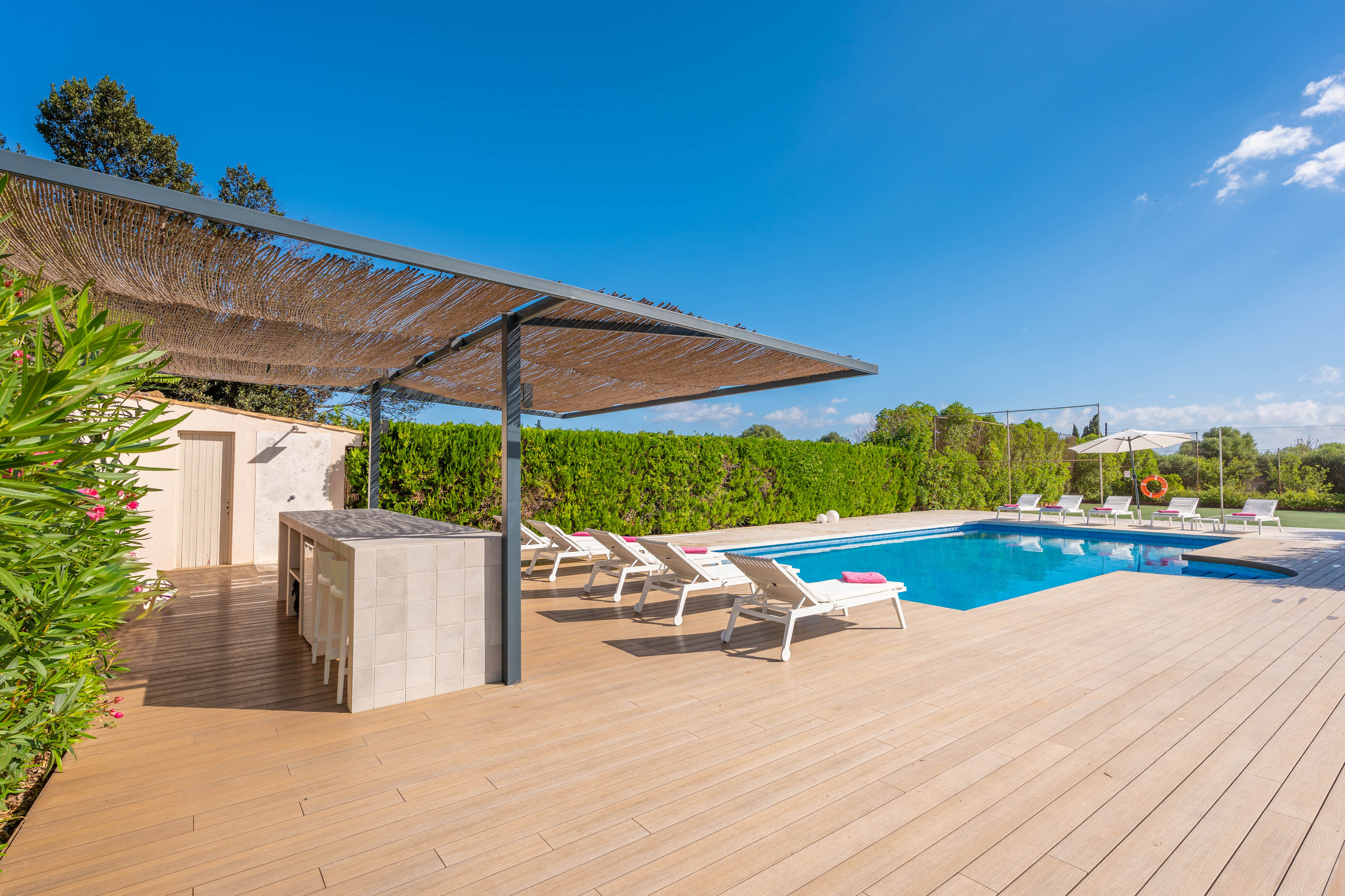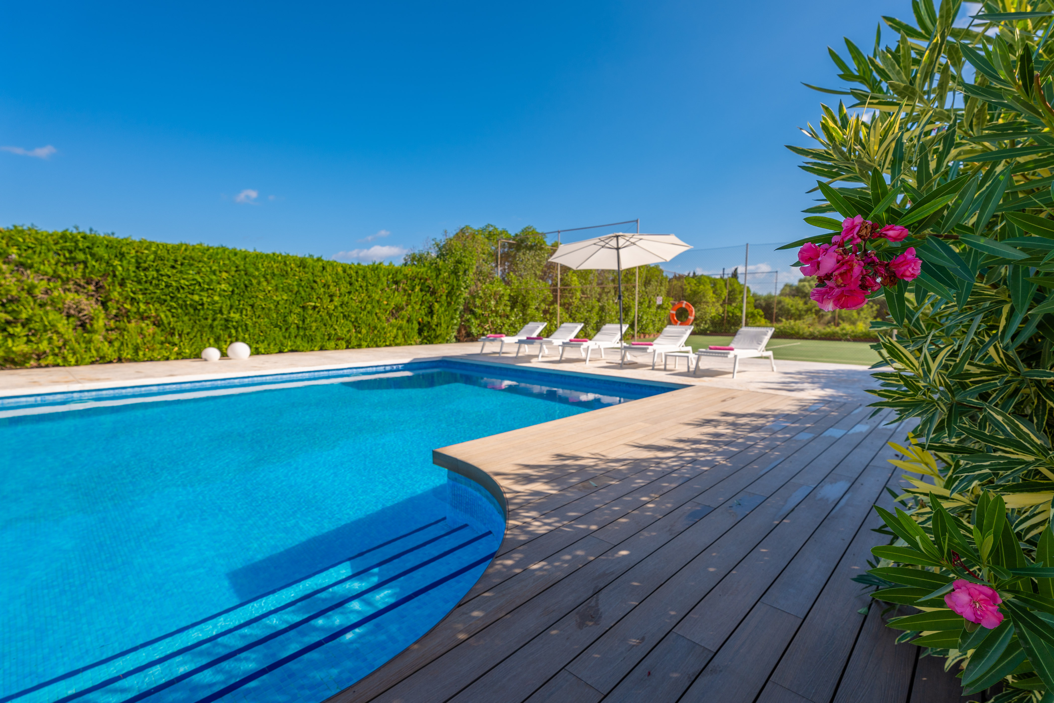 Op de eerste verdieping zijn de overige vier slaapkamers. Twee slaapkamers hebben tweepersoonsbedden en een eigen badkamer met bad, waardoor gasten een comfortabele privéruimte hebben. De andere twee slaapkamers hebben elk twee eenpersoonsbedden, perfect voor kinderen of vrienden. Een extra badkamer met ligbad completeert deze verdieping, zodat iedereen zijn eigen ruimte en privacy heeft. Voor jouw gemak heeft de villa een wasmachine, strijkijzer en strijkplank. Een kinderbedje en een kinderstoel zijn beschikbaar voor gezinnen die reizen met een baby.
