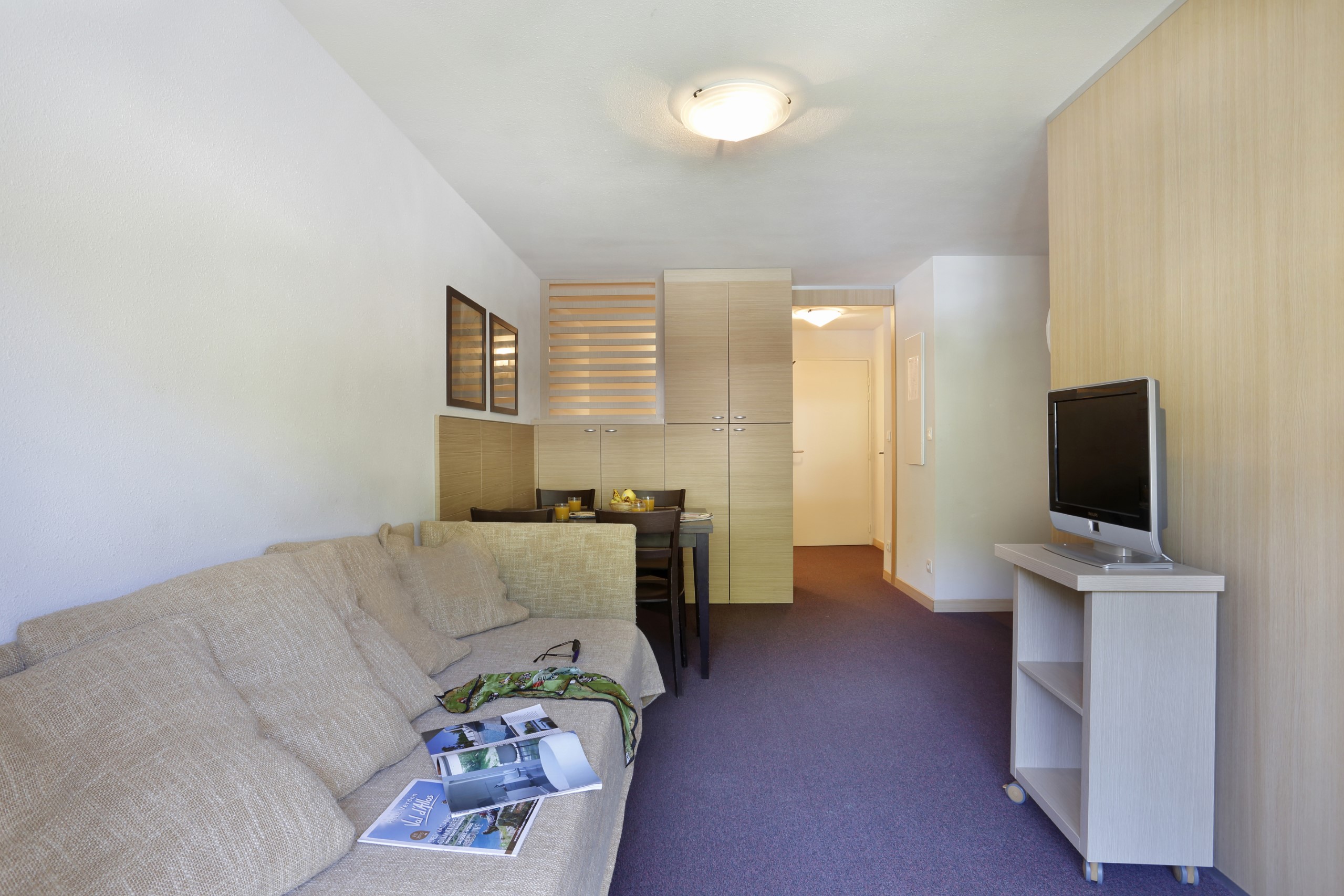 Het interieur beschikt over een gezellige woonruimte met een uitschuifbare slaapbank en een flatscreen-tv - perfect om te ontspannen na een actieve dag.