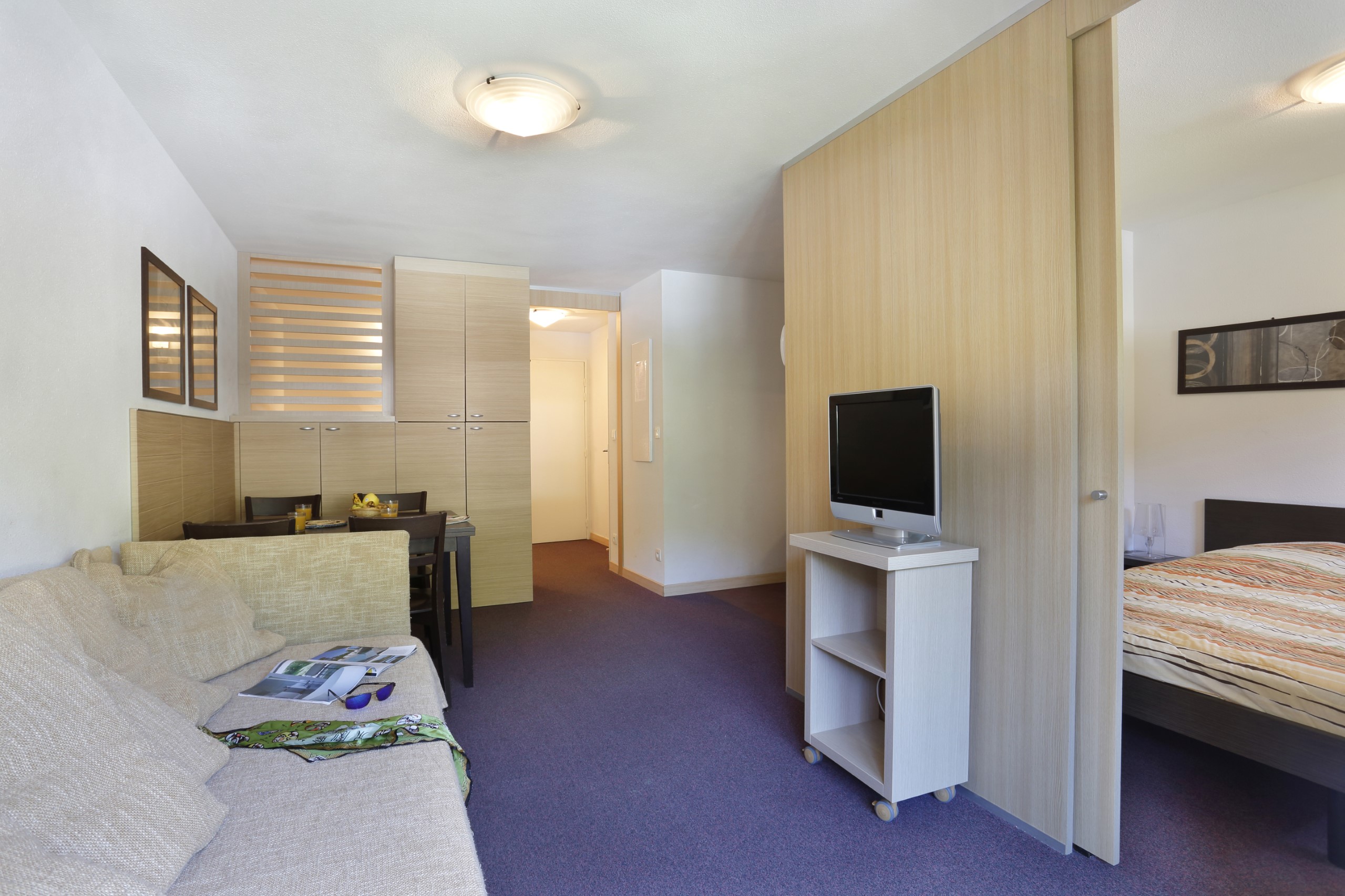 De volledig uitgeruste kitchenette bevat een koelkast, keramische kookplaat, magnetron, vaatwasser, filterkoffiezetapparaat, waterkoker en broodrooster - alles wat u nodig heeft voor een verblijf met zelfvoorziening.