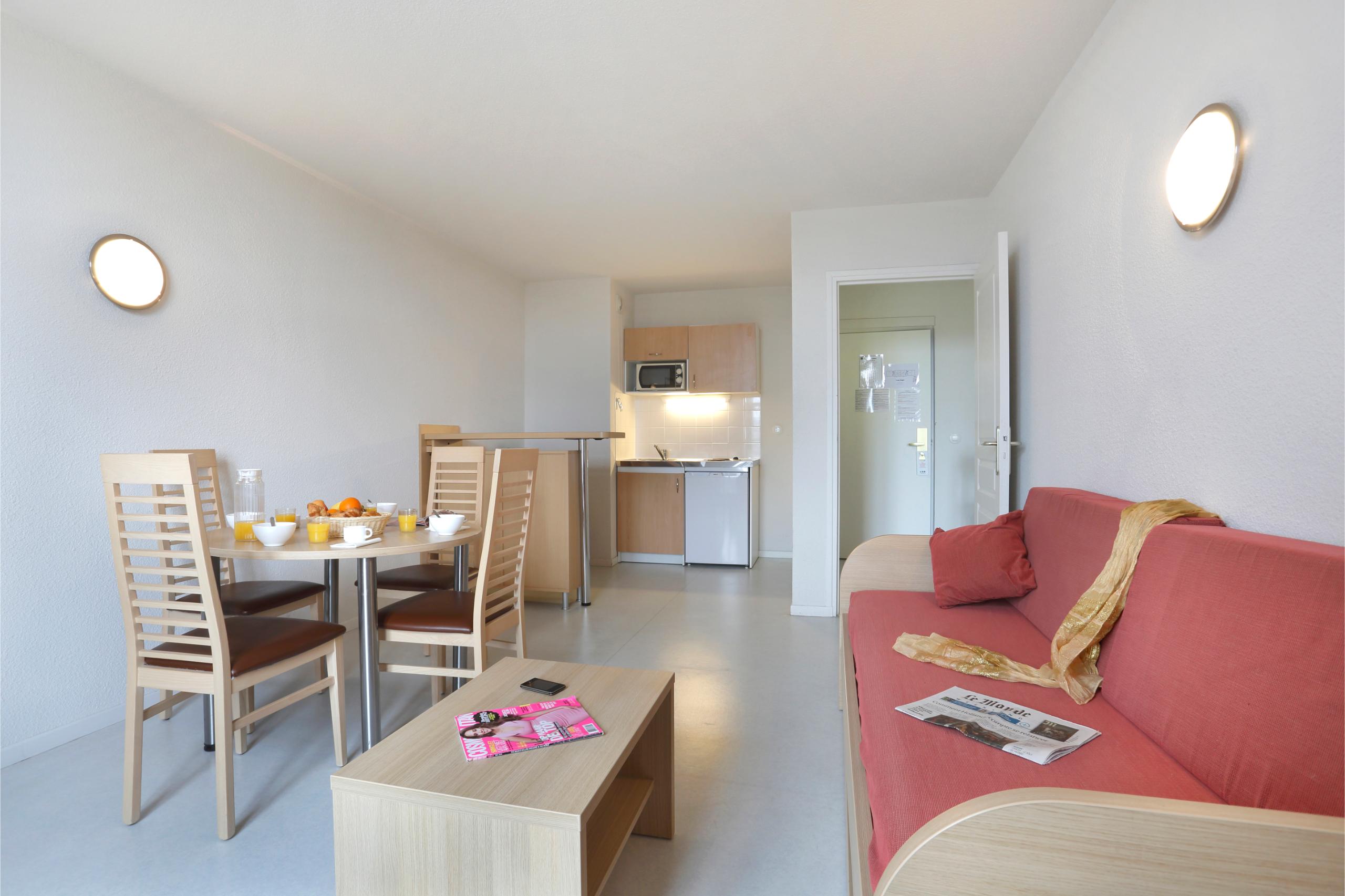 -Woonkamer met tweepersoonsslaapbank, eethoek en televisie