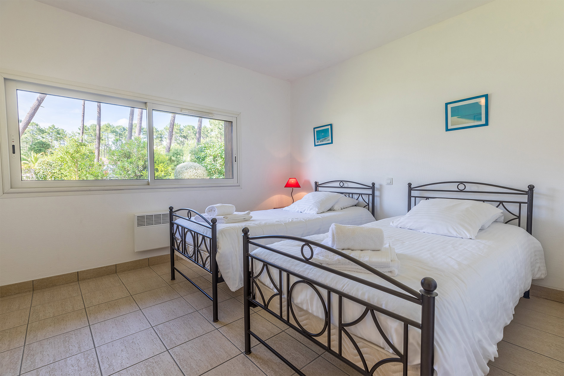 - Een slaapkamer met twee eenpersoonsbedden en een douche