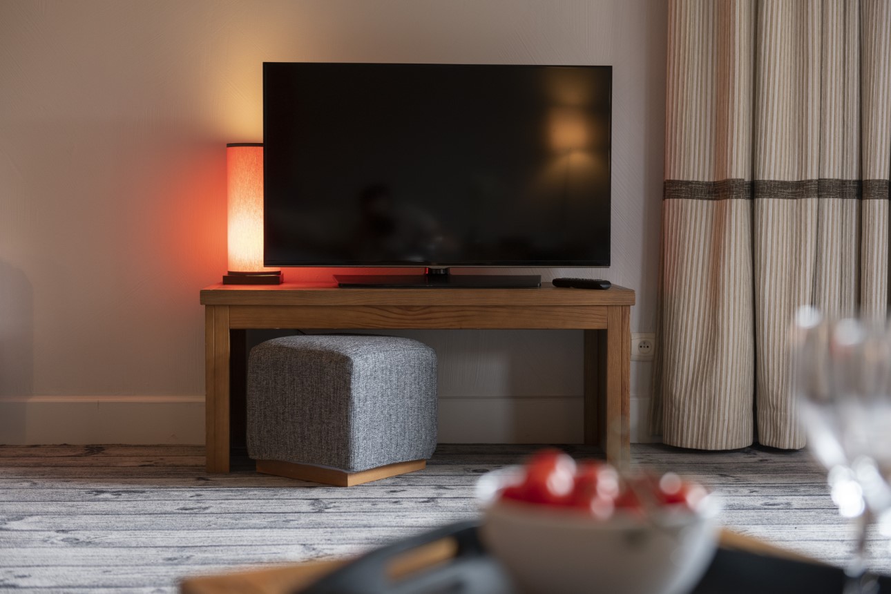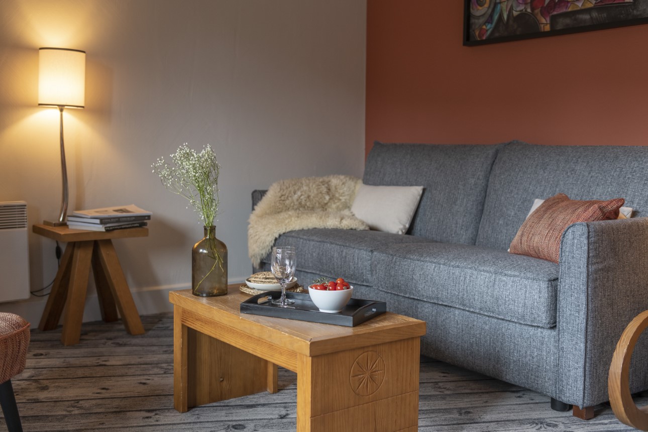 Ruime woonkamer met een uitklapbare slaapbank voor 2 personen.