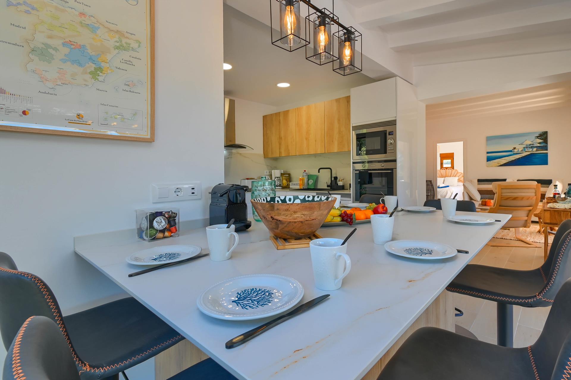 open keuken met elektrische kookplaat, elektrische oven, magnetron, vaatwasser, koel-vriescombinatie, koffiezetapparaat, waterkoker, mixer, broodrooster en citruspers