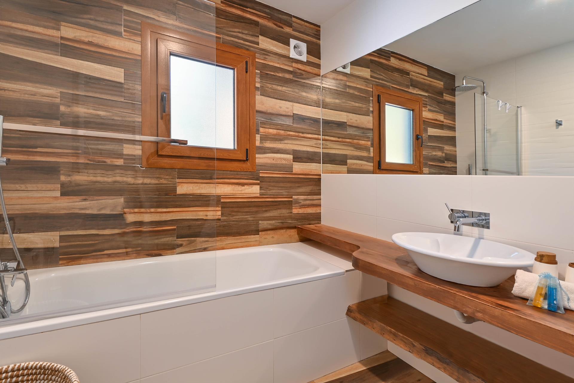 badkamer met enkele wastafel, bad/douchecombinatie en toilet