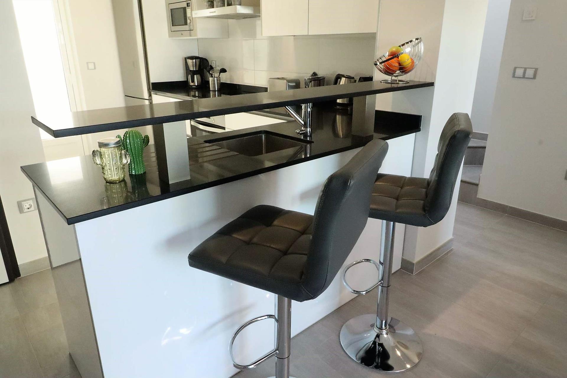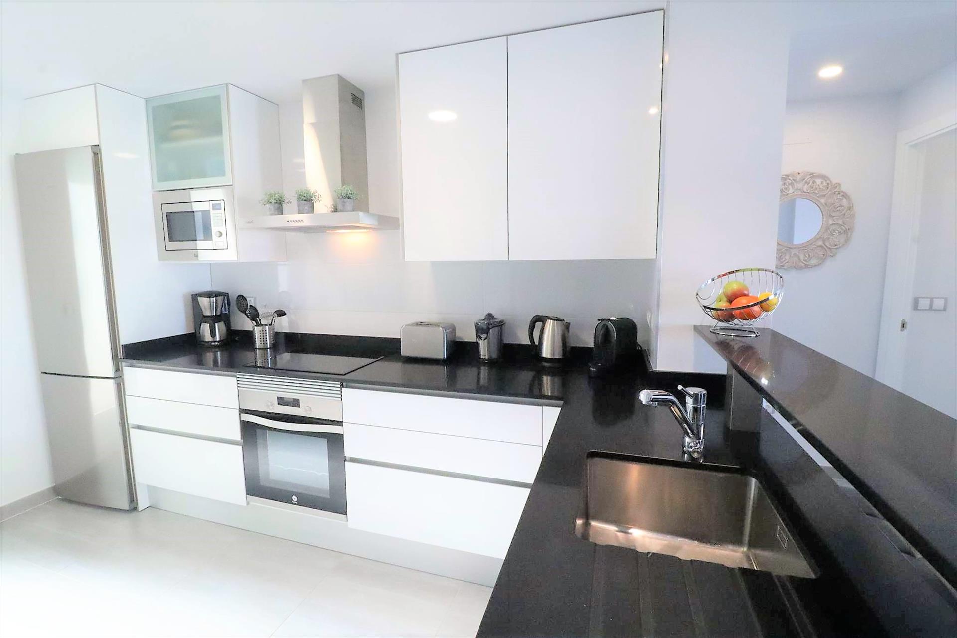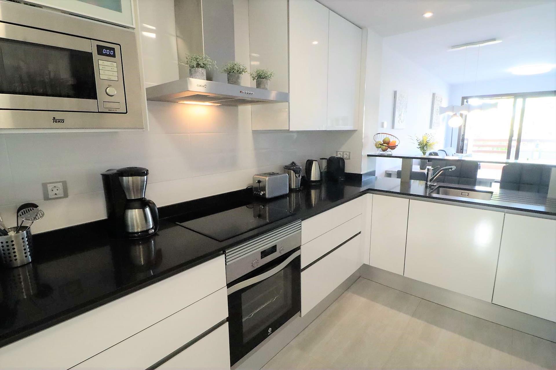 Open keuken met inductiekookplaat, elektrische oven, magnetron, vaatwasser, koel-vriescombinatie, koffiezetapparaat, waterkoker, broodrooster en citruspers
