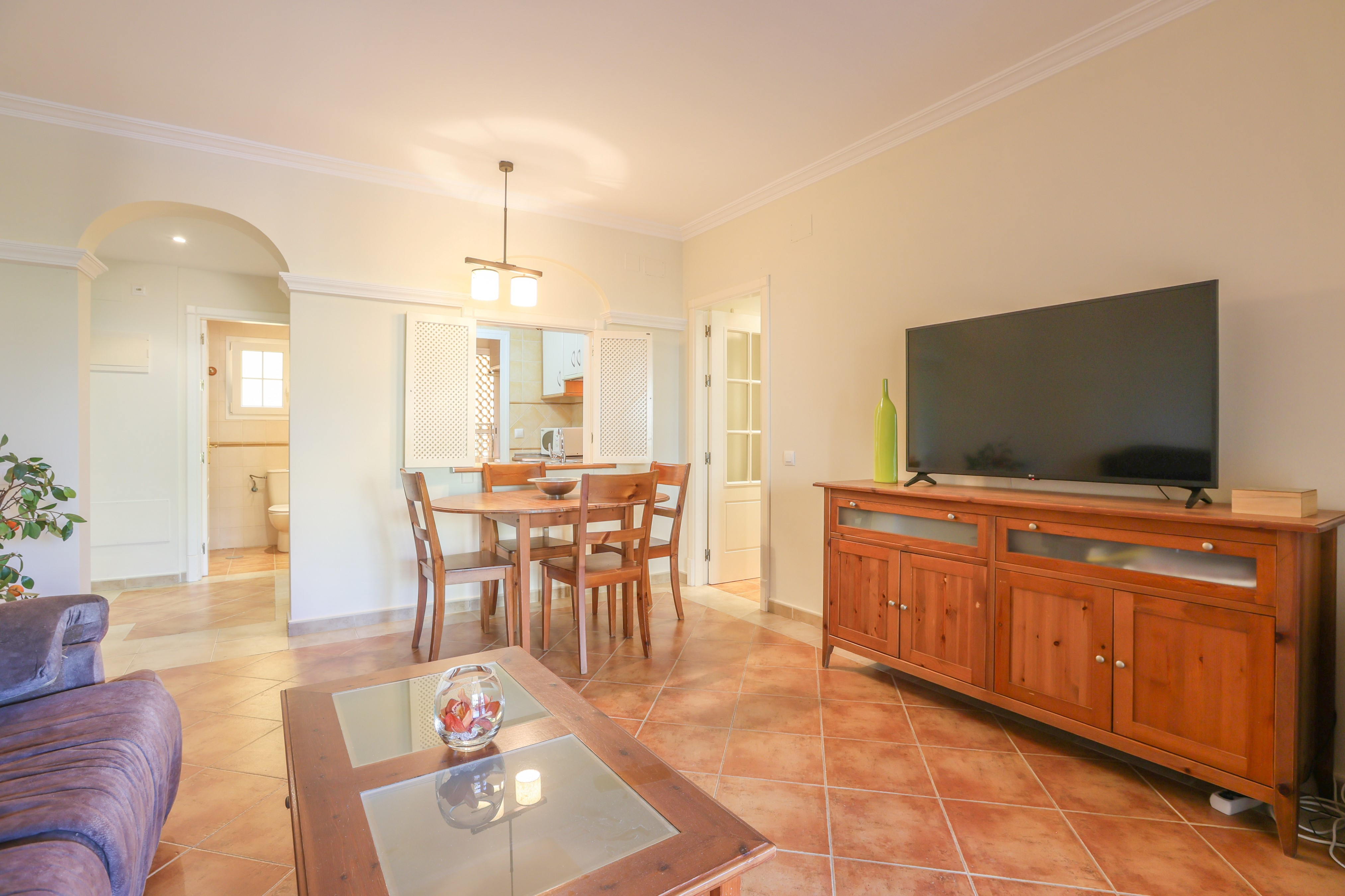 Gelegen op de eerste verdieping, het interieur is erg gezellig. U kunt 's ochtends genieten van een kopje koffie of een praatje maken met uw metgezellen op het gemeubileerde terras. Eenmaal binnen is de woon-eetkamer zeer licht en voorzien van airconditioning en Smart TV. De vitrokeramische keuken is uitgerust met al het benodigde keukengerei om comfortabel te koken. Er is ook een wasmachine, strijkijzer en strijkplank. Als het tijd is om te slapen heb je twee slaapkamers tot je beschikking, één met een tweepersoonsbed en een eigen badkamer met ligbad en directe toegang tot het terras en de andere met twee eenpersoonsbedden. Een badkamer met douche maakt uw verblijf compleet. En als u met uw baby reist, kunnen wij u voorzien van een kinderbedje en een kinderstoel.