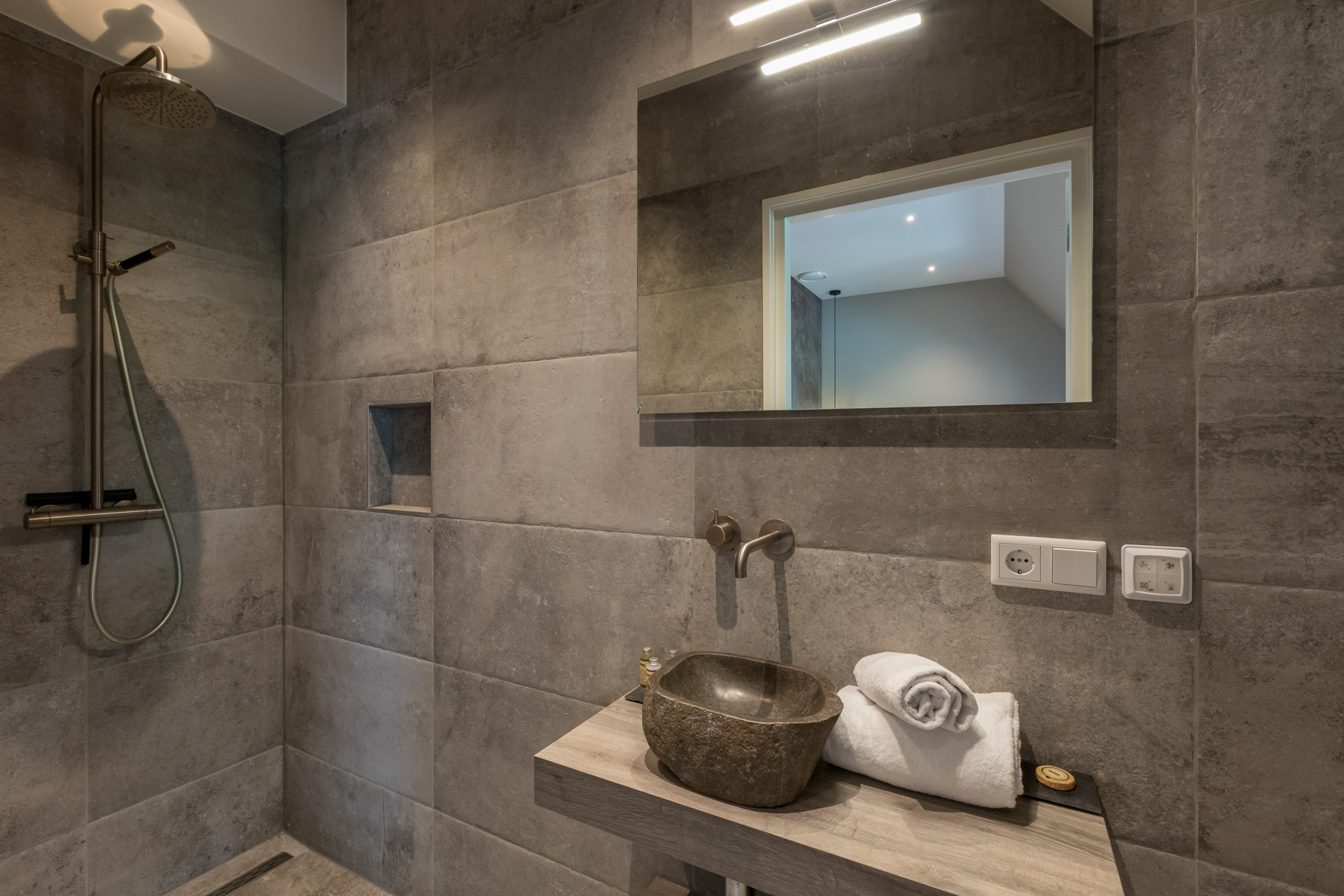 Er zijn twee slaapkamers: een met een dubbel bed en de andere met twee eenpersoonsbedden. Elke slaapkamer heeft een eigen badkamer: de ene met douche, toilet en wastafel, de andere met douche en wastafel. Daarnaast is er een apart toilet in het appartement.