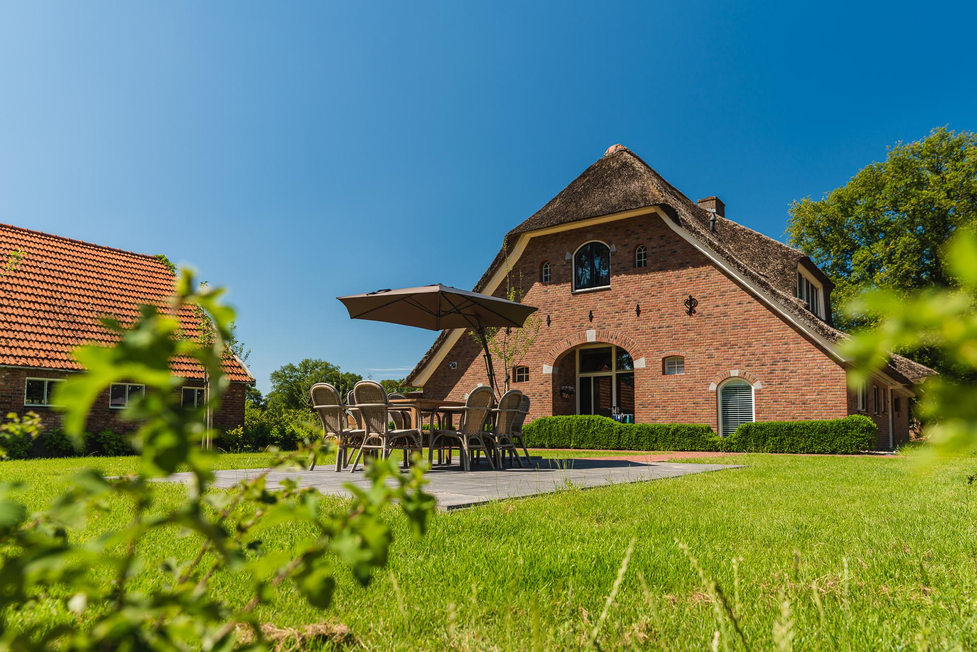 Het hoofdgedeelte van het huis beschikt over een ruime woonkamer met een gezellige open haard, die naadloos overgaat in een moderne, volledig uitgeruste keuken. Deze ruimte is ideaal om samen tijd door te brengen in een warme en uitnodigende sfeer. Op deze verdieping bevindt zich ook een badkamer met douche en een apart toilet. Boven zijn vier comfortabele slaapkamers met boxspringbedden en een extra toilet.