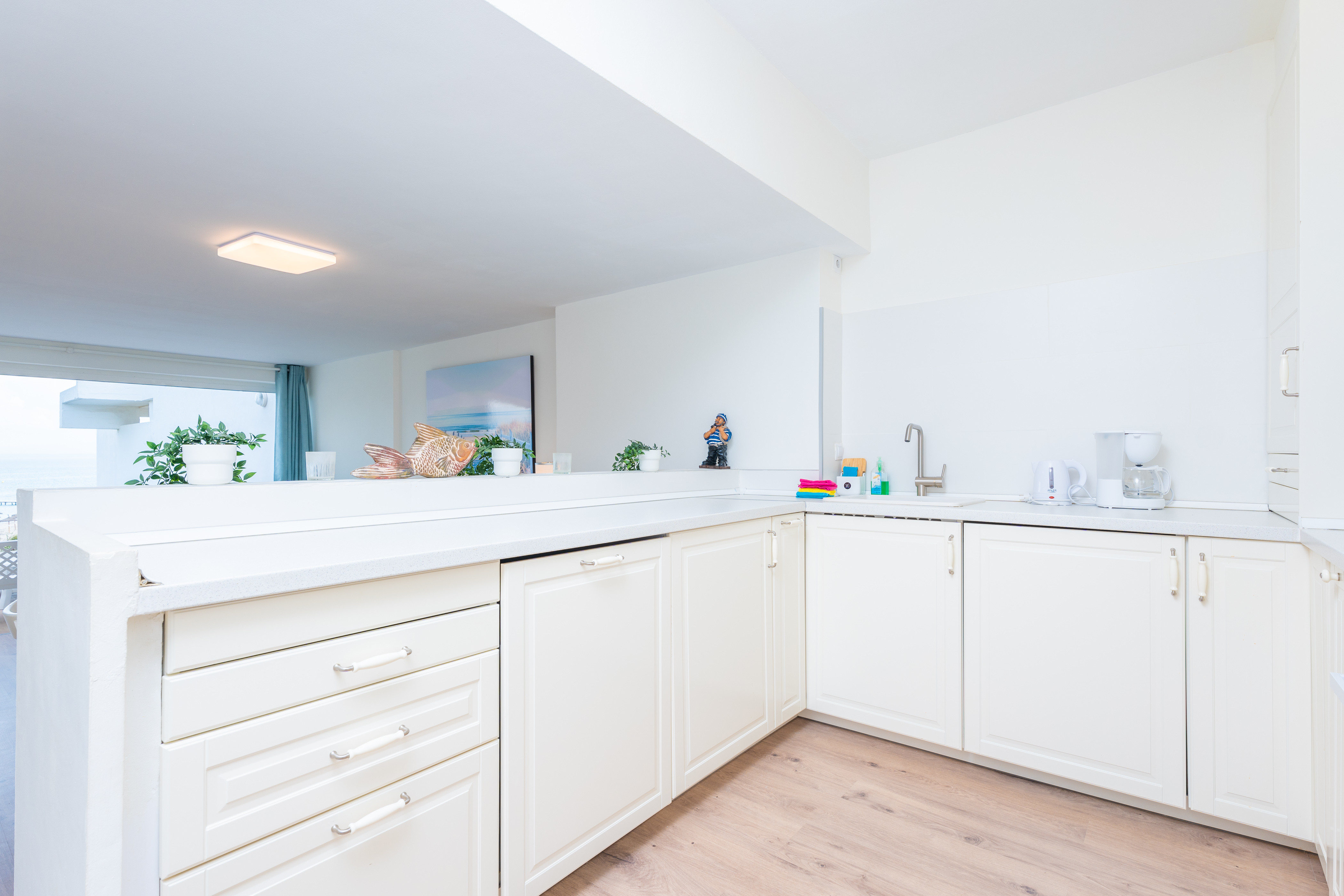 Gelegen op de derde verdieping van een gebouw zonder lift, is dit moderne appartement doordacht ontworpen op één niveau. Bij binnenkomst wordt u verwelkomd in een lichte en ruime woonkamer met dubbelhoge plafonds, die de keuken, woonkamer en eethoek naadloos combineert. De woonkamer beschikt over een comfortabele bank en een Smart TV, perfect voor gezellige avonden met uw gezelschap.