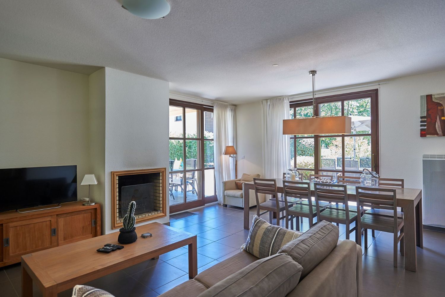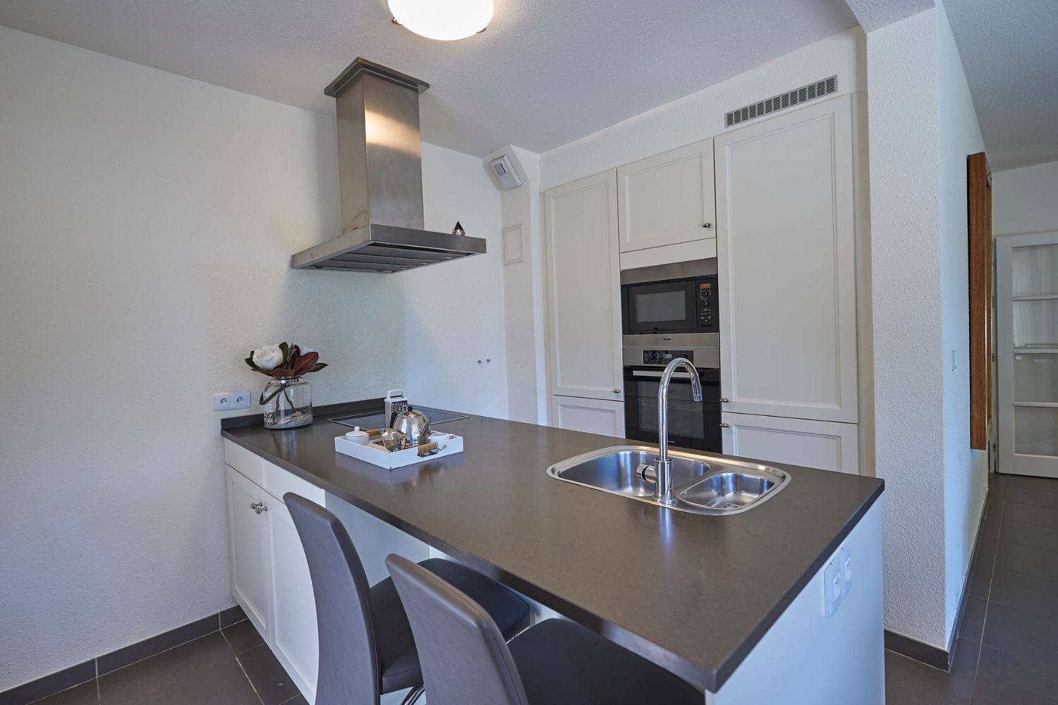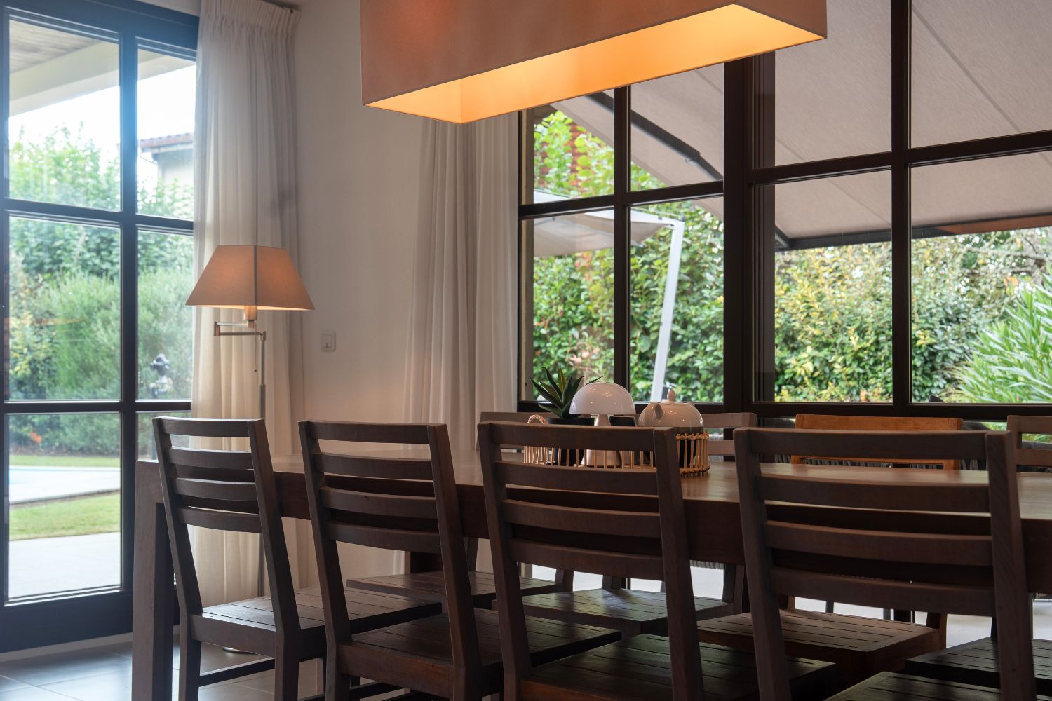 De privétuin is een veilige speelplaats voor kinderen, terwijl het overdekte terras, ingericht met luxe ligbedden en tuinmeubilair, de perfecte plek is om te ontspannen. De stijlvolle woonkamer nodigt u uit om tot rust te komen bij de open haard, terwijl u kijkt naar internationale zenders op de tv. De open keuken is de droom van elke chef-kok, met een design kookeiland en hoogwaardige ingebouwde apparatuur, waaronder een kookplaat, koel-/vriescombinatie, vaatwasser, oven en magnetron.