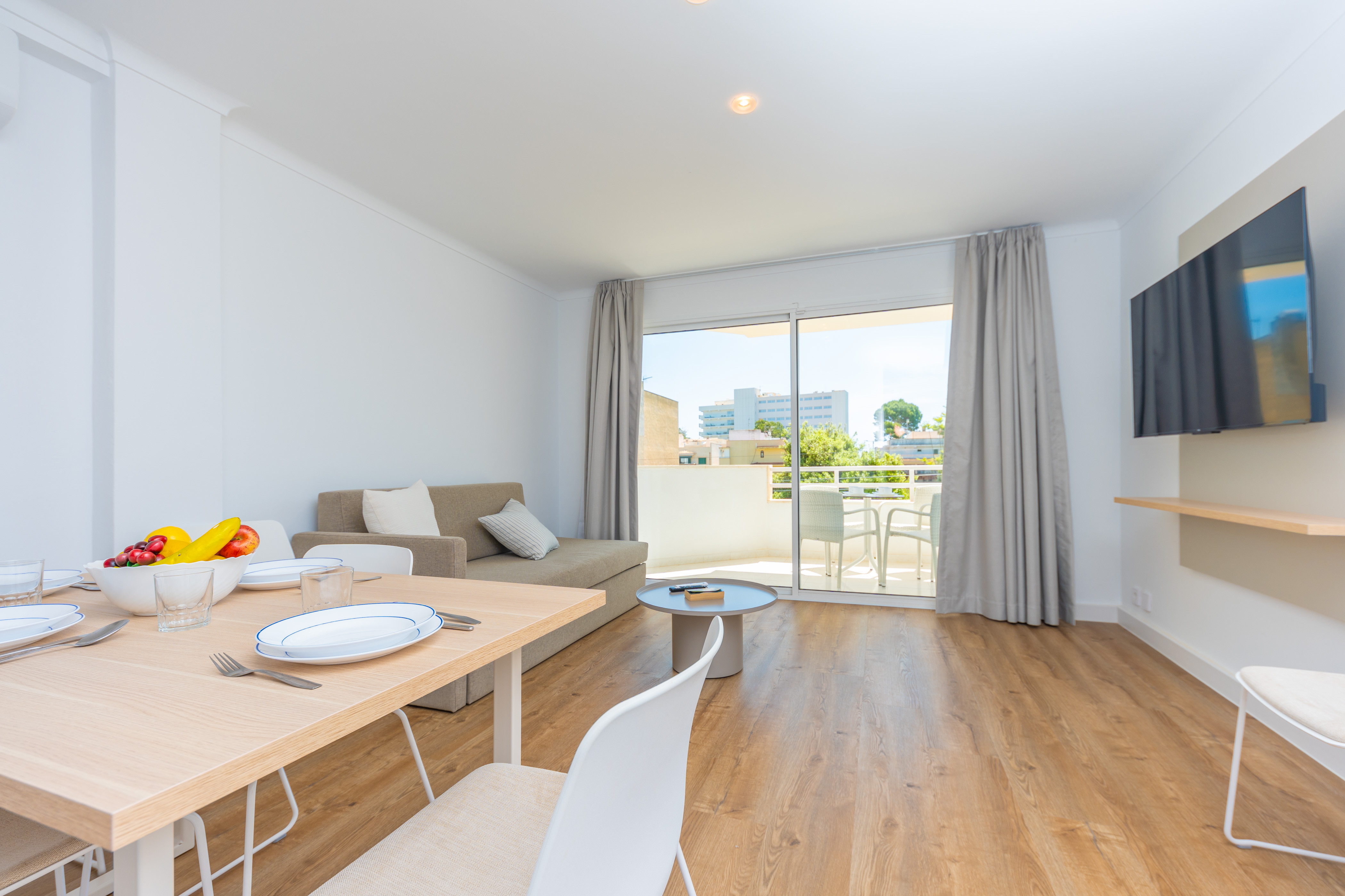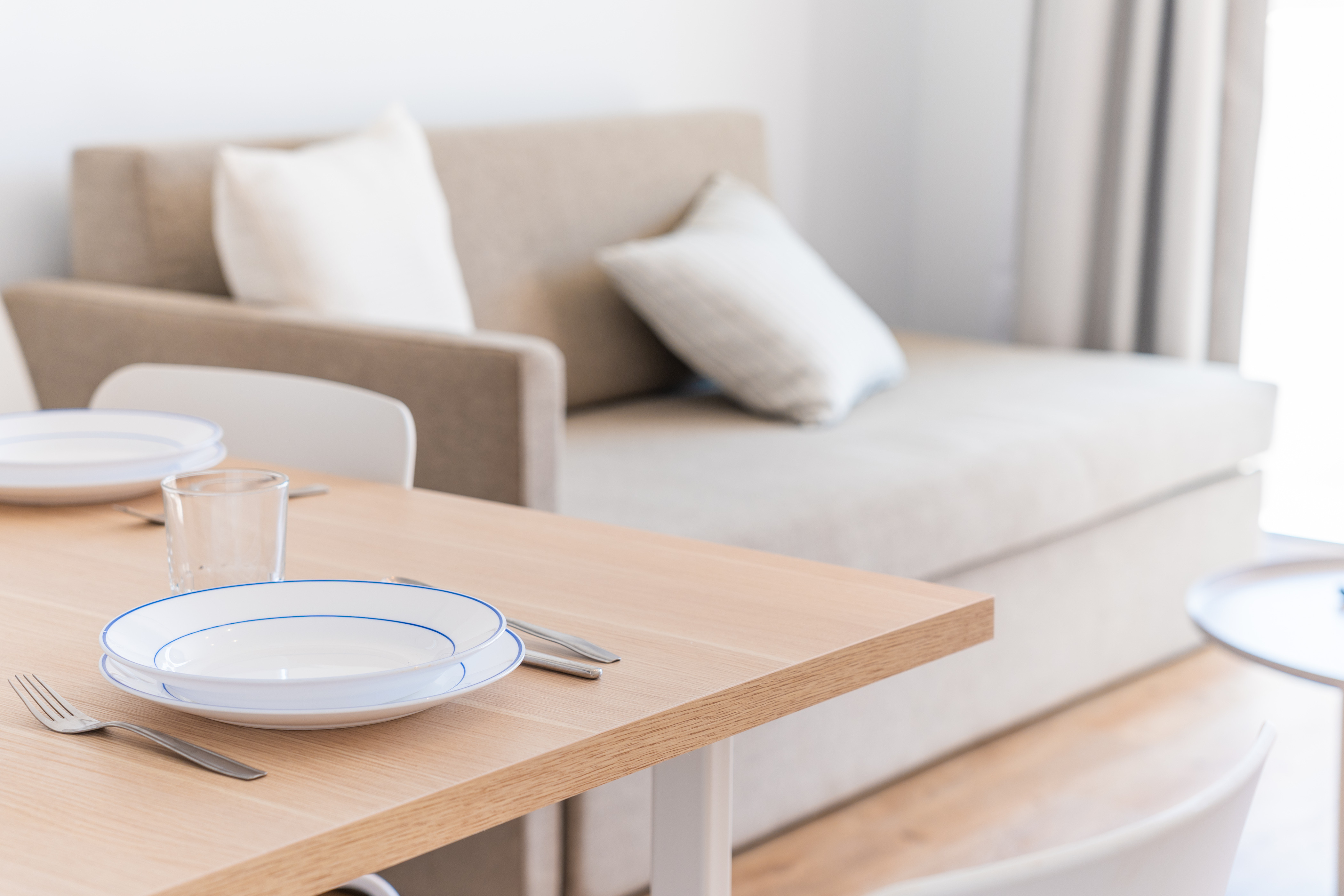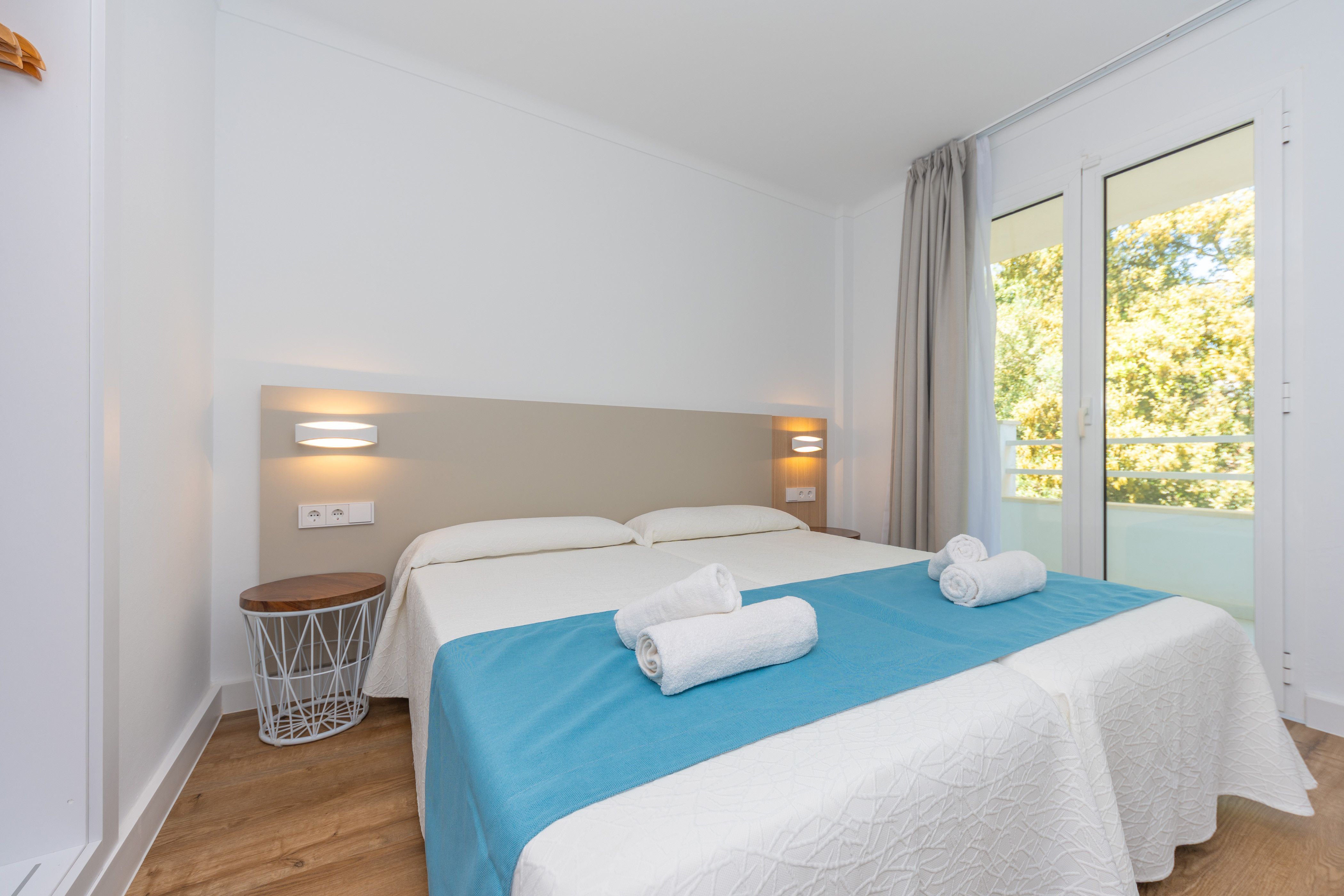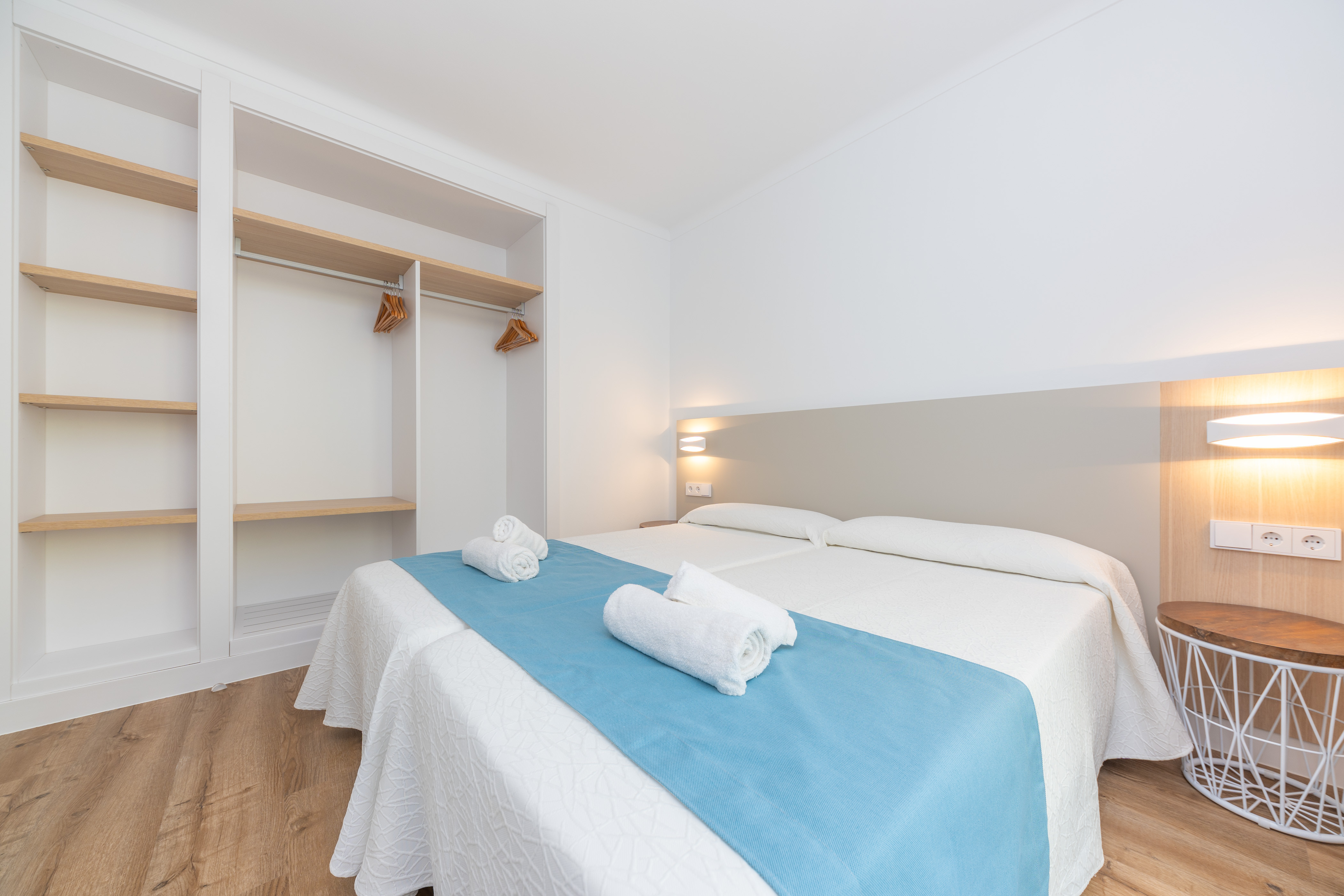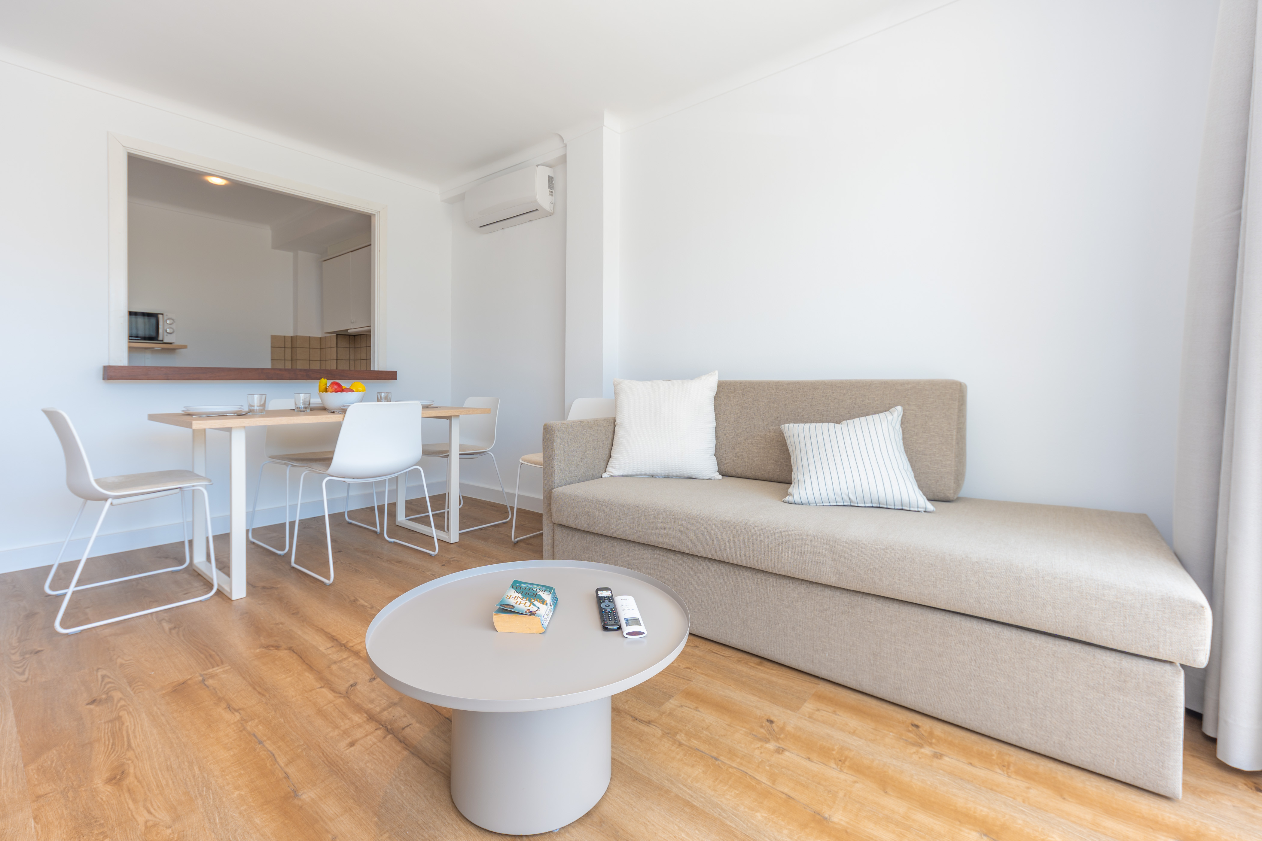 Dit is een appartement op de eerste verdieping zonder lift, waar onze gasten worden opgewacht door een behulpzame en comfortabele woon-eetkamer-keuken. Deze kamer nodigt uit om uw beste gerechten te bereiden op de elektrische kookplaat van de keuken en ervan te genieten aan de eettafel. Daarna kunt u ontspannen op de bank en naar de satelliet-tv kijken in de kamer met airconditioning (alleen koude lucht). De keuken is uitgerust en er is geen wasmachine of strijkijzer. Dit appartement heeft 2 slaapkamers met airconditioning (alleen koude lucht) en twee eenpersoonsbedden, waarvan één met toegang tot een klein terras. Een babybedje en een kinderstoel zijn aanwezig. Voor de extra gast kunnen wij een comfortabele slaapbank voor u klaarmaken. De badkamer is uitgerust met een bad.