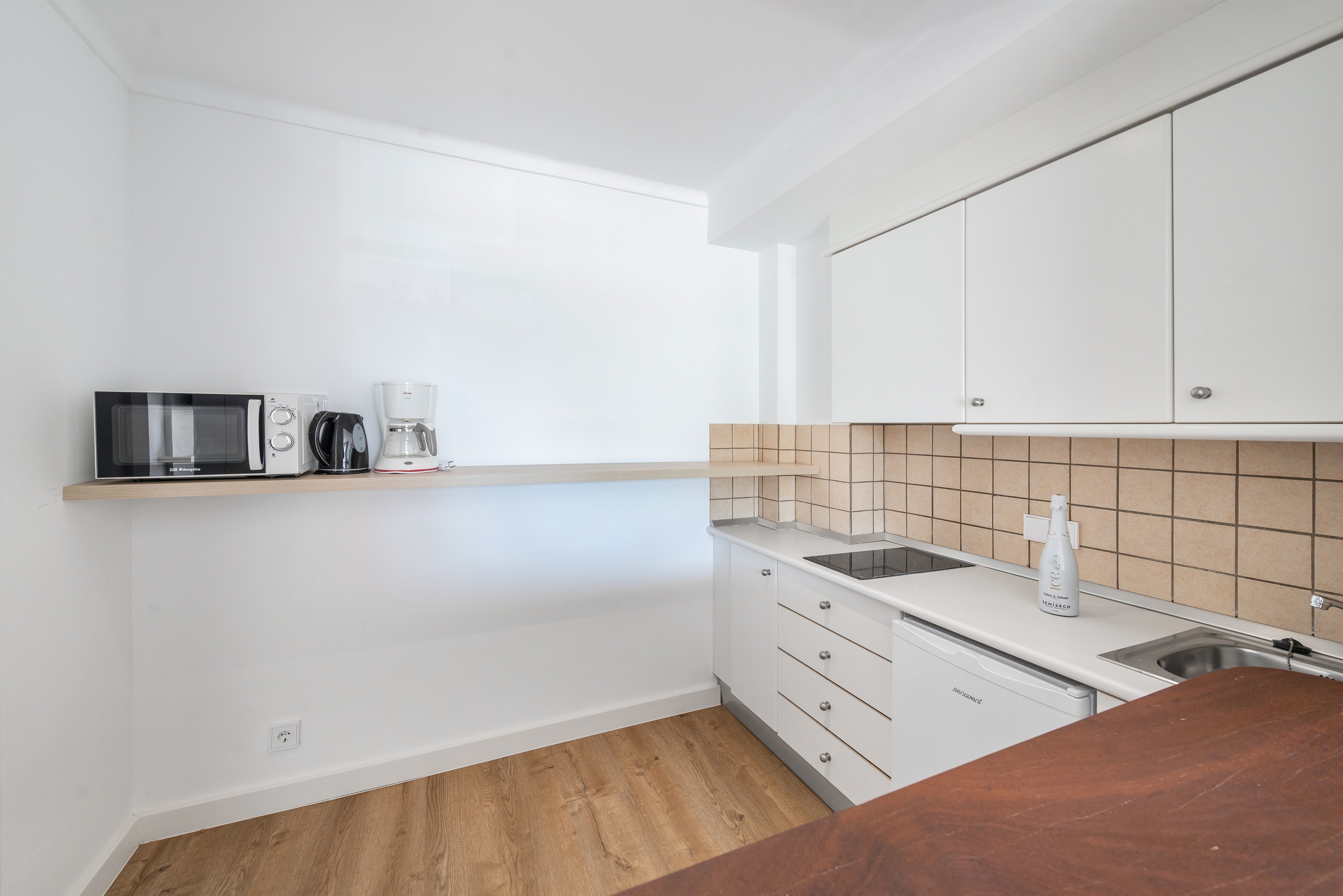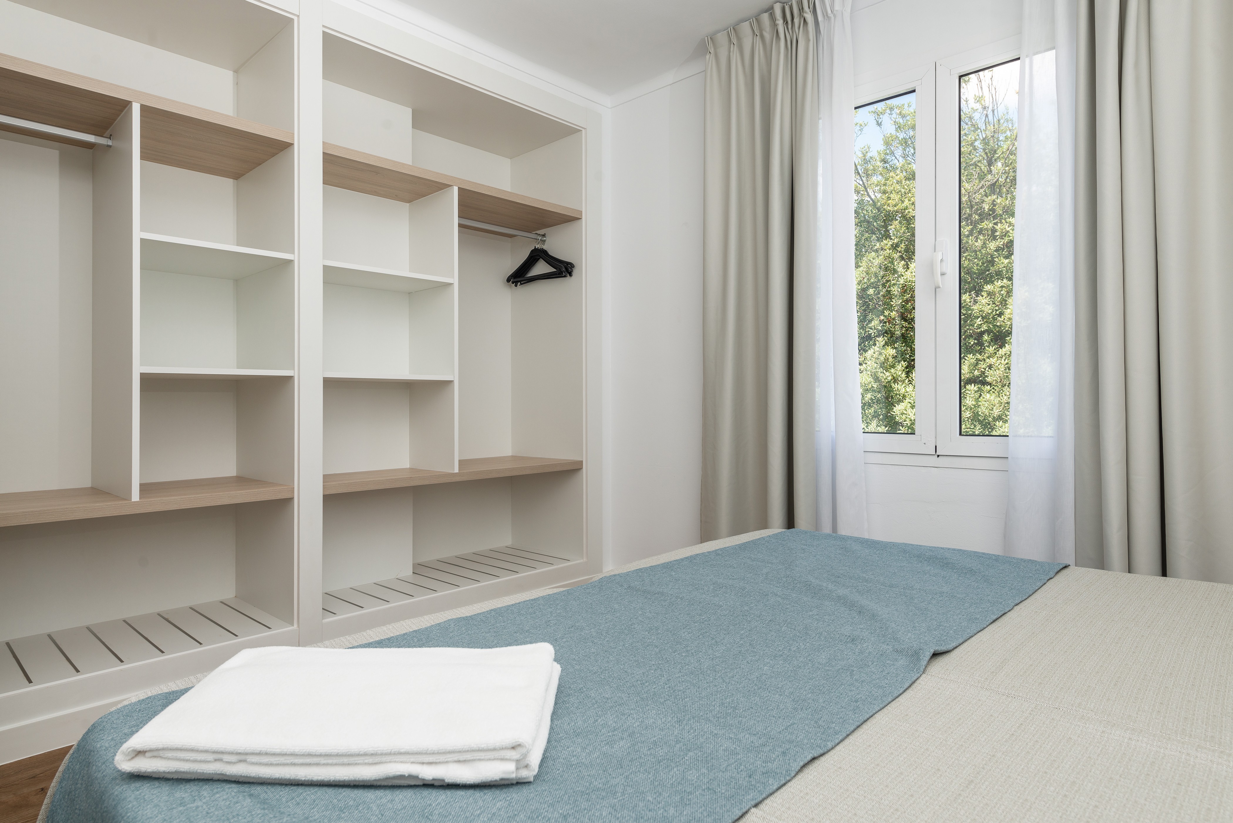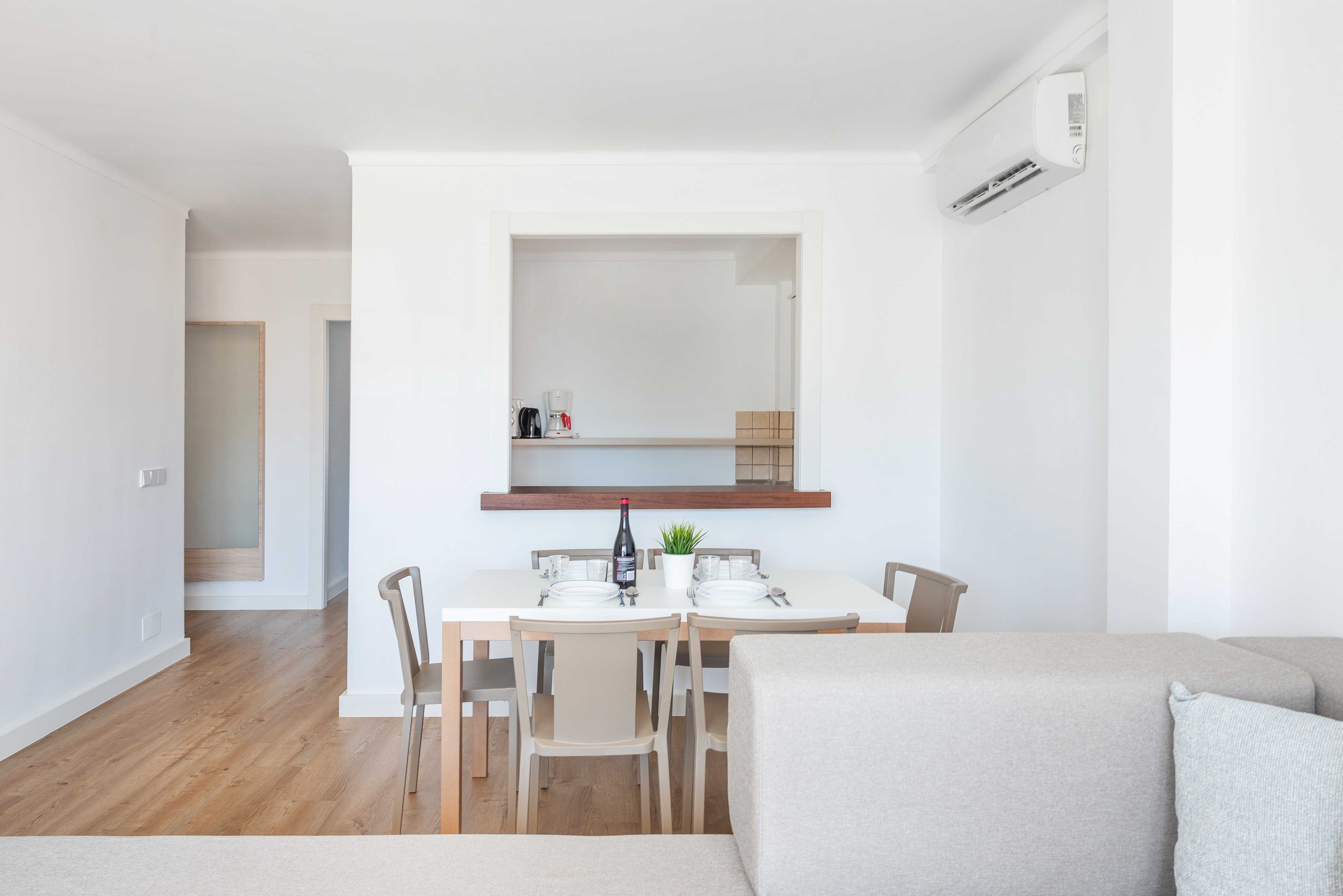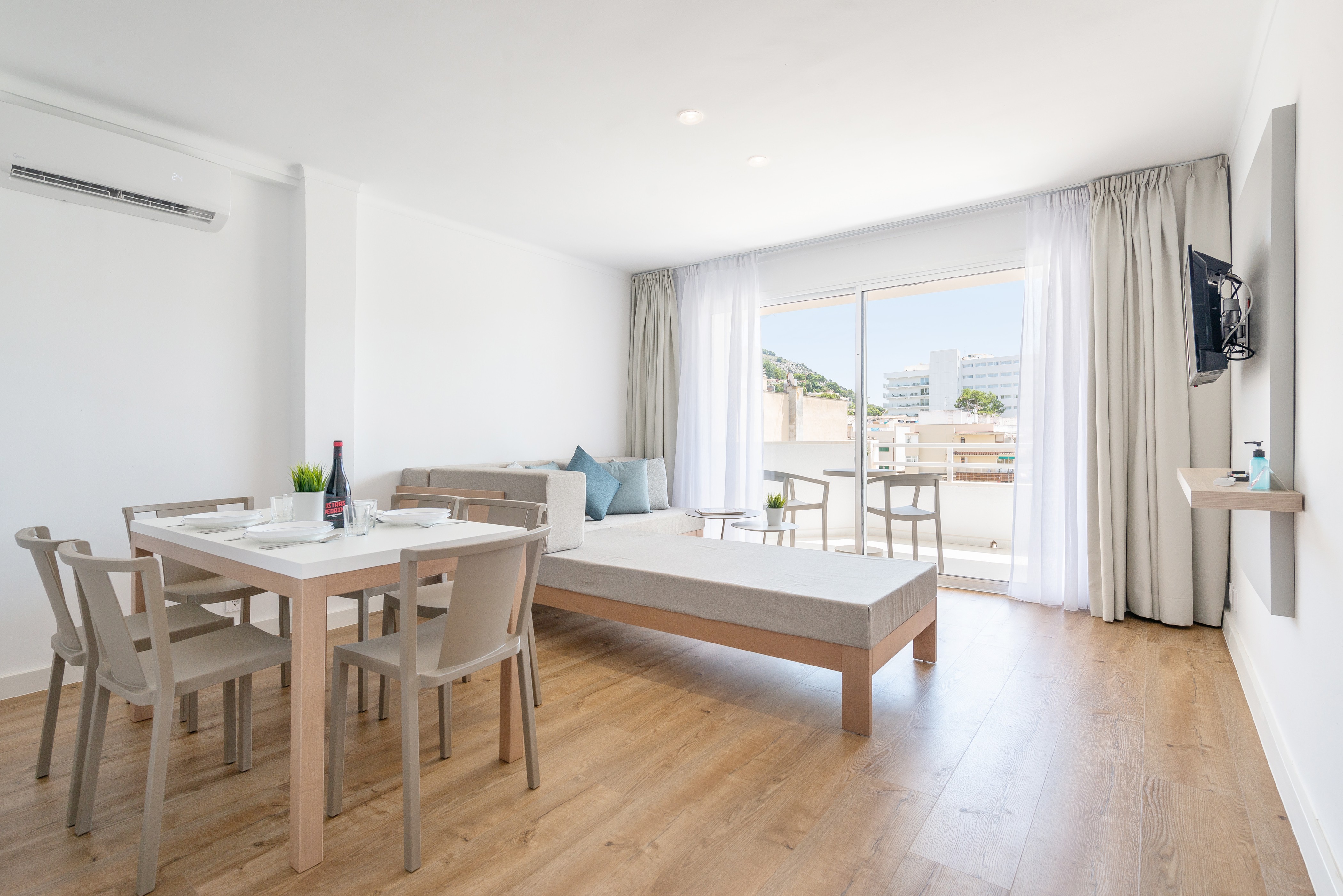Het appartement bevindt zich op de tweede verdieping van een gebouw zonder lift en is subtiel ingericht in een moderne en serene stijl. De woonkamer biedt een comfortabele bank, eettafel, airconditioning (alleen koude lucht) en tv met satellietzenders. De keuken is open naar het eetgedeelte en is uitgerust met een keramische kookplaat. Er zijn twee slaapkamers met twee eenpersoonsbedden, airconditioning (alleen koude lucht) en een kledingkast. Een van hen heeft toegang tot een terras. De extra gast slaapt op de slaapbank. De enige badkamer heeft een douche. We kunnen een kinderbedje en een kinderstoel leveren als u met uw baby reist, maar houd er rekening mee dat er geen wasmachine, strijkijzer of strijkplank is.