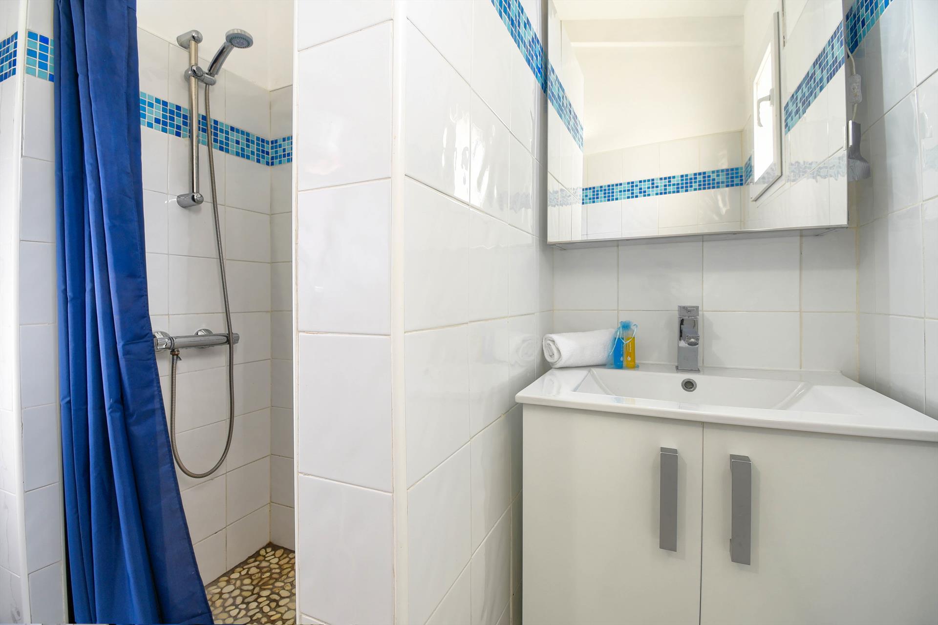 - badkamer met enkele wastafel, douche, toilet en haardroger