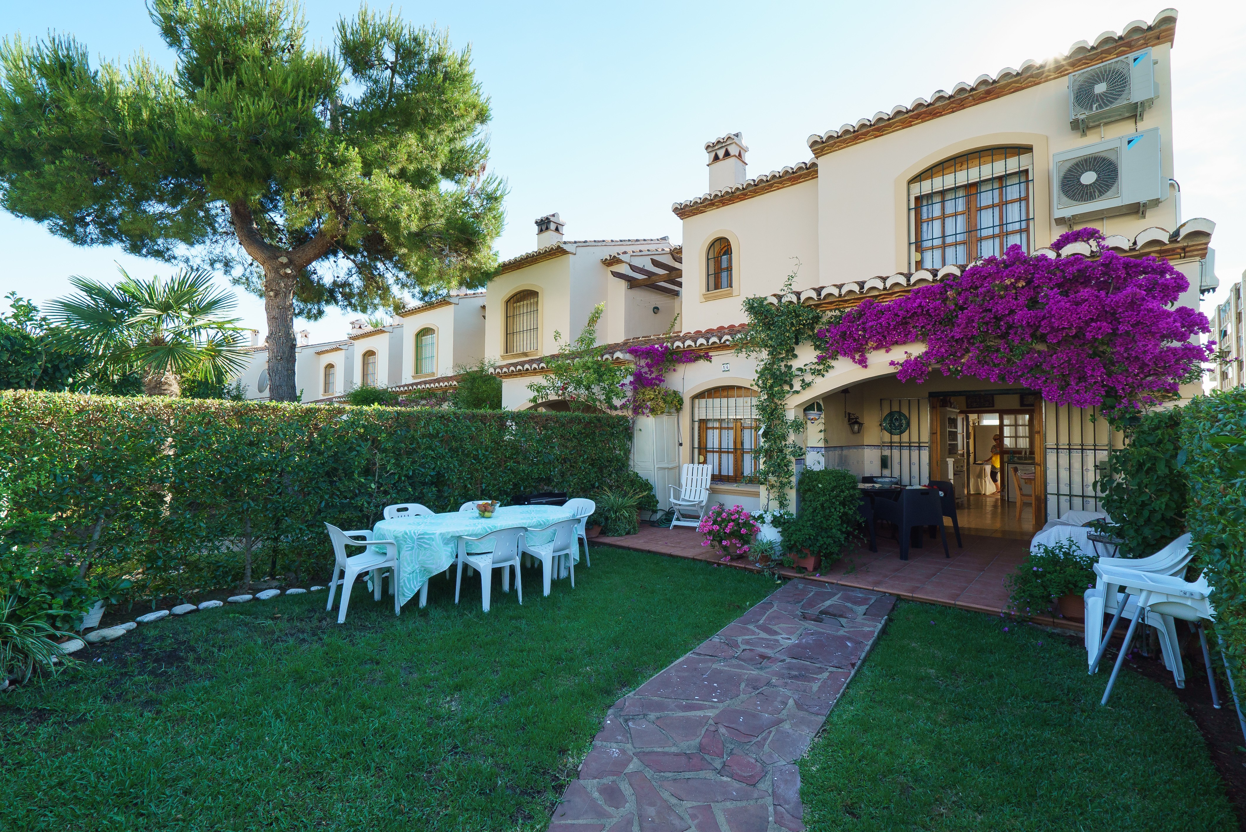Dit 130 m² grote duplex appartement heeft een privé tuinhoek met een gemeubileerd terras en overdekte veranda. Het biedt 4 slaapkamers, waarvan twee airconditioned zijn: een tweepersoonskamer op de begane grond, een tweepersoonskamer met een eigen badkamer en twee kamers met twee eenpersoonsbedden op de eerste verdieping. Een ledikant en hoge stoel kunnen op aanvraag worden verstrekt. Er zijn 2 badkamers, één op de begane grond en één op de eerste verdieping. De gezellige, airconditioned woonkamer-eetkamer-keuken is de perfecte plek om te ontspannen na een zonnige dag, of je nu TV kijkt of je favoriete boek leest. De volledig uitgeruste keuken is voorzien van alle keukengerei, en een wasmachine, strijkijzer en strijkplank zijn ook beschikbaar.
