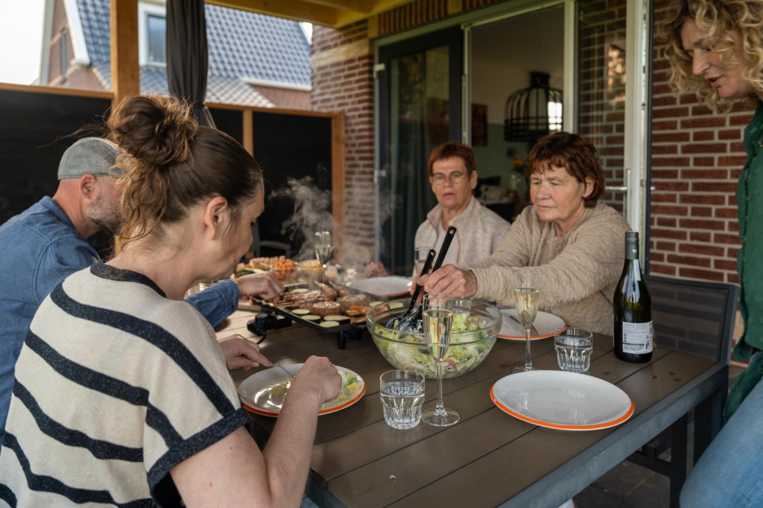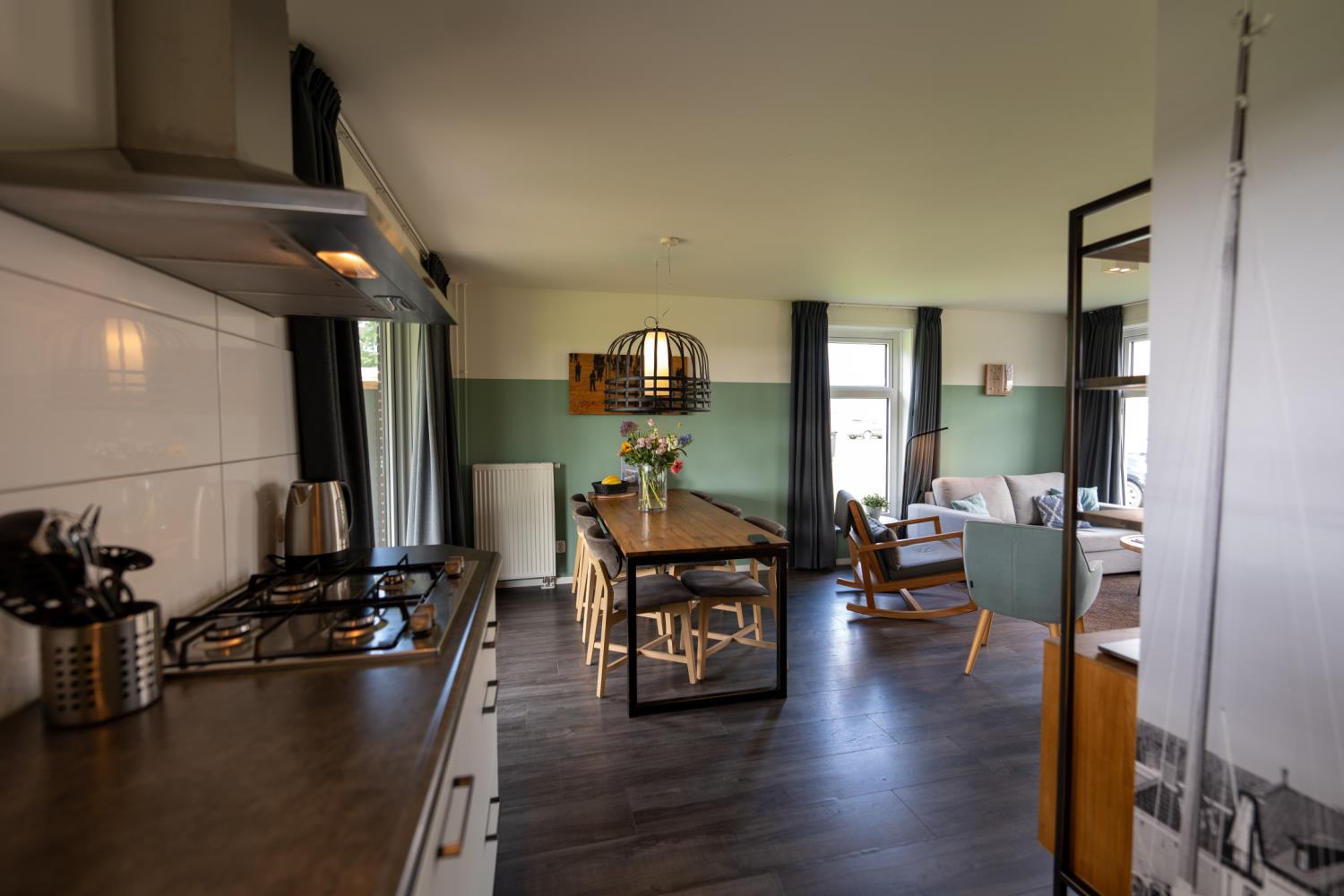 Op de begane grond bevindt zich een open keuken met een ruime, knusse woon- eetkamer. De keuken is voorzien van een koelkast, vaatwasser, waterkoker, koffiezetapparaat en Nespresso, combi-magnetron, 4-pits fornuis en voldoende keukengerei. De woonkamer heeft een ruime eethoek, een comfortabele bank en een TV. Er is ook een apart toilet.
