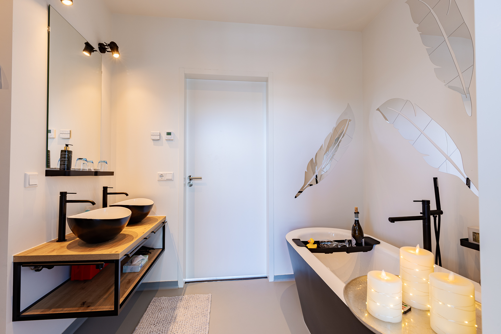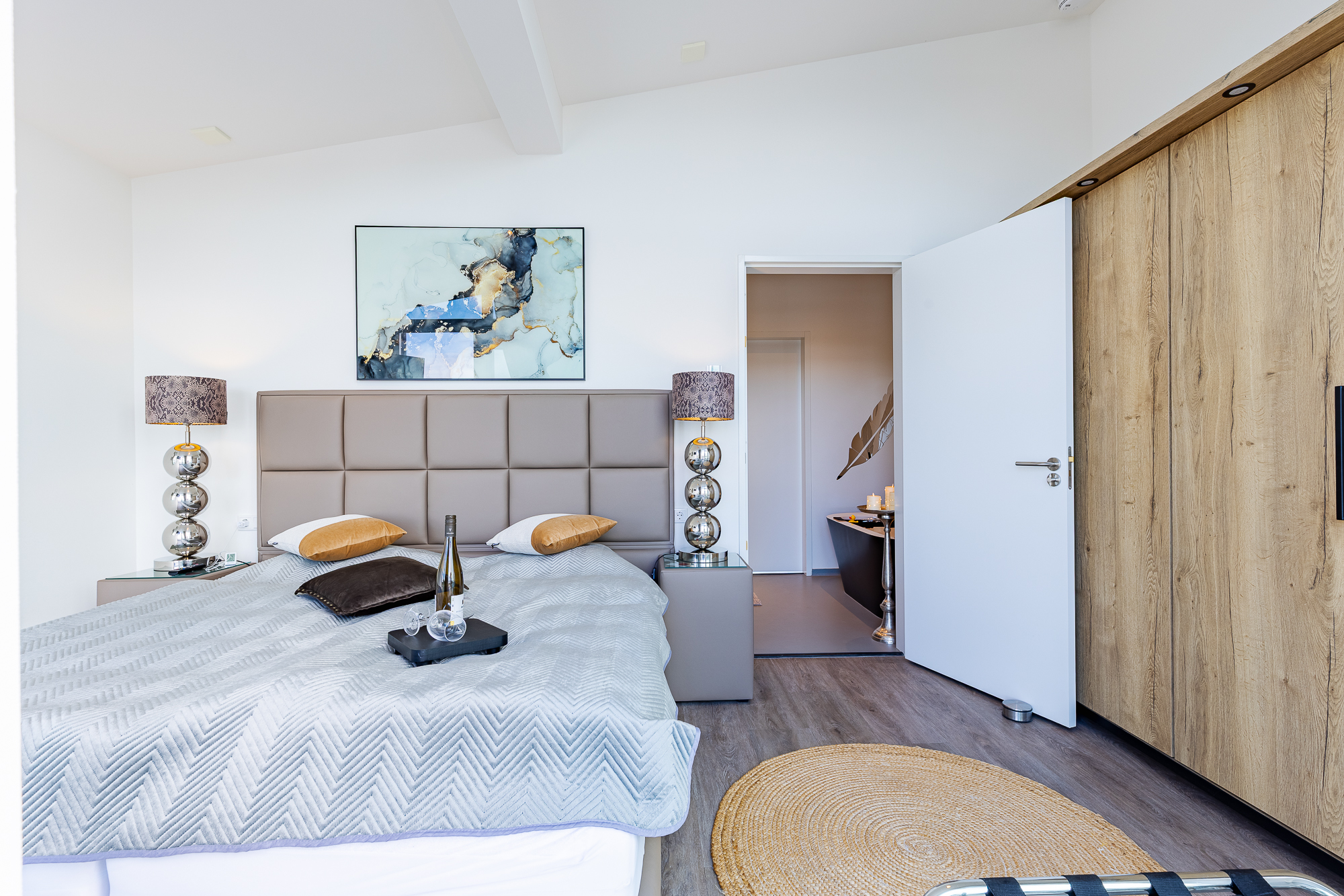 De ruime slaapkamer is voorzien van een comfortabel tweepersoonsbed (180x200 cm), bedverlichting en een grote kledingkast voor voldoende opbergruimte. De badkamer is uitgerust met zowel een inloopdouche als een bad - perfect voor een verfrissende start of een ontspannen einde van de dag. Een apart toilet voegt extra gemak toe.